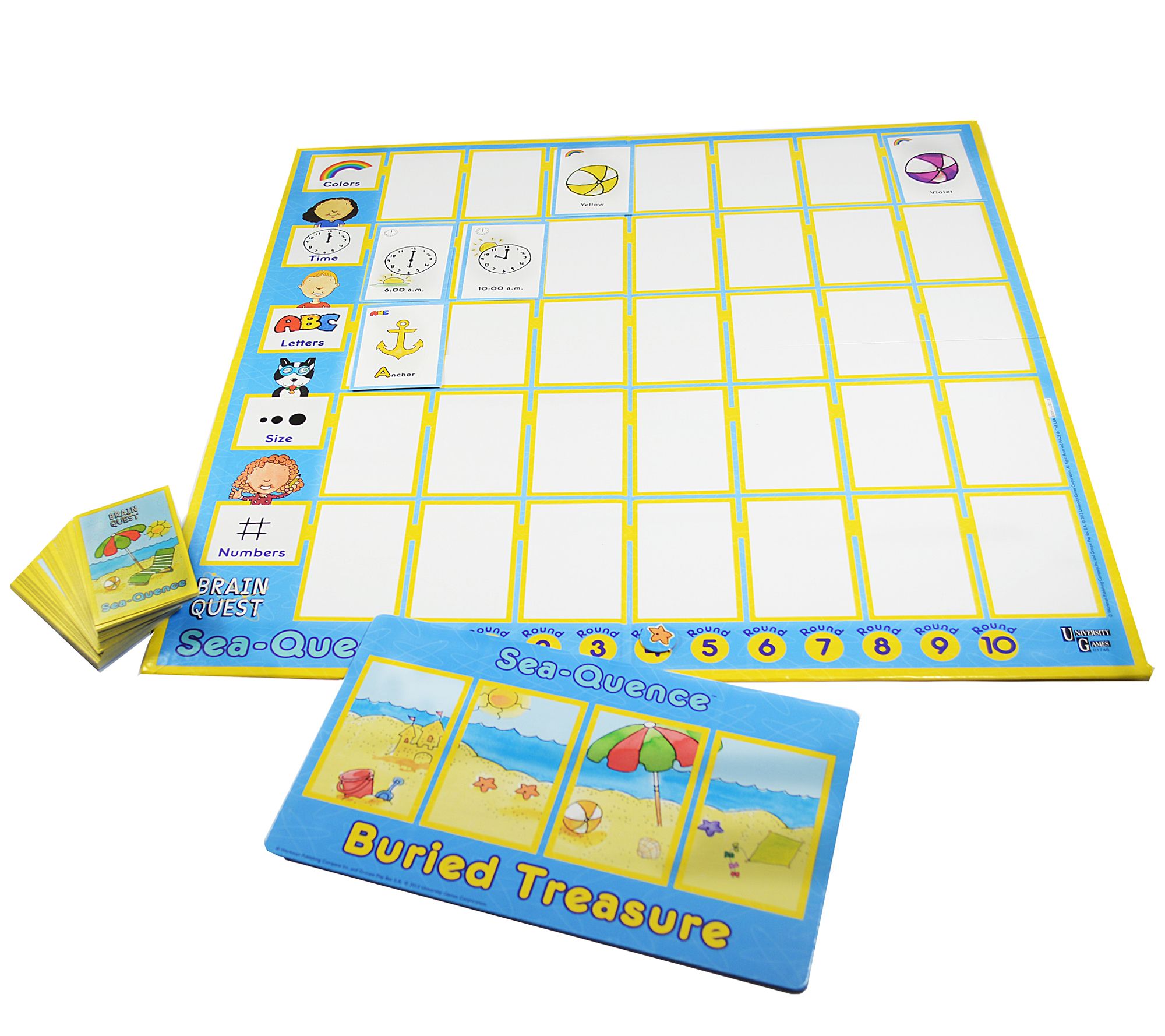 • Includes game board, 35 sea-quence cards, 20 beach booster cards, round token, buried treasure bonus zone, and instructions