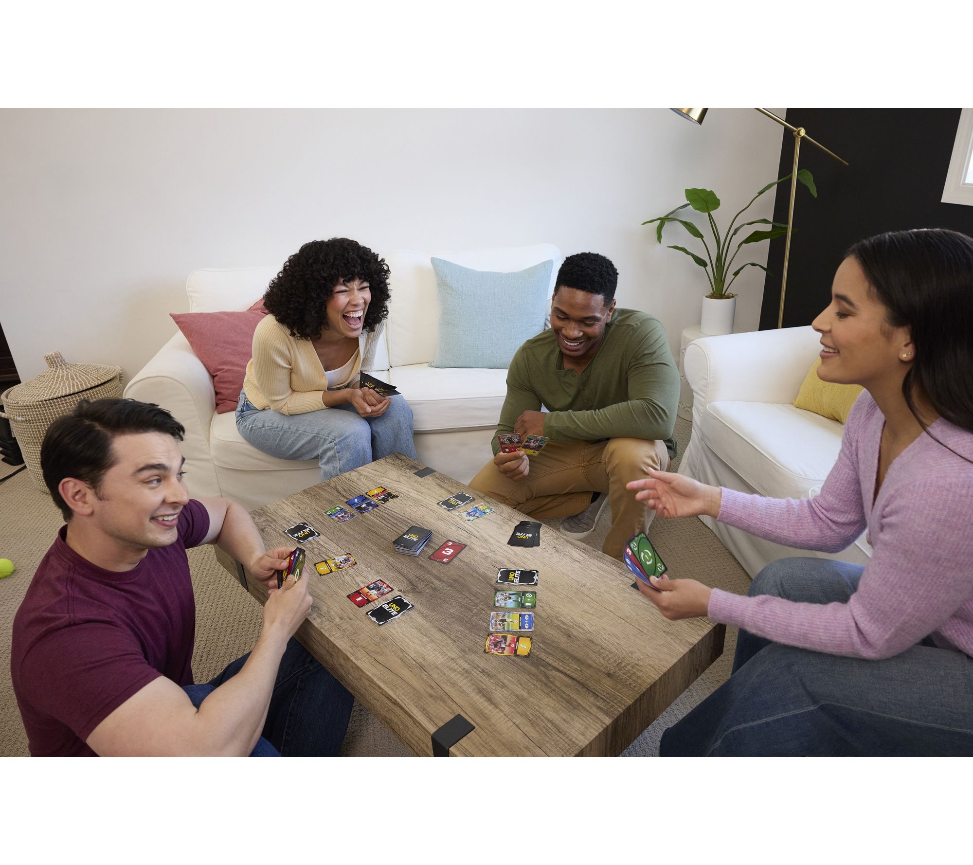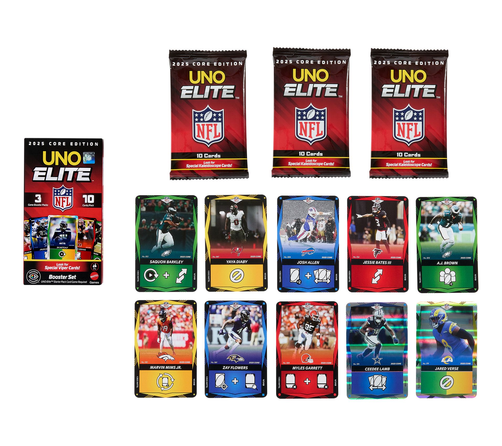Includes UNO Elite Mattel NFL 2025 Core Edition starter pack (with 122 NFL UNO cards, four Game Booster packs each with 10 cards, and two Promo Elite action cards); and three additional UNO Elite NFL Game Booster packs (each with 10 cards)