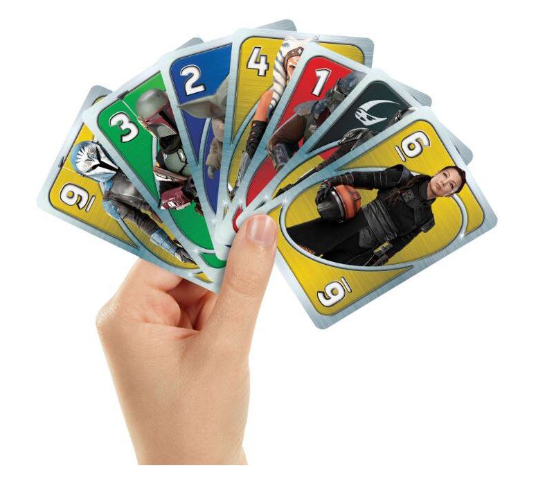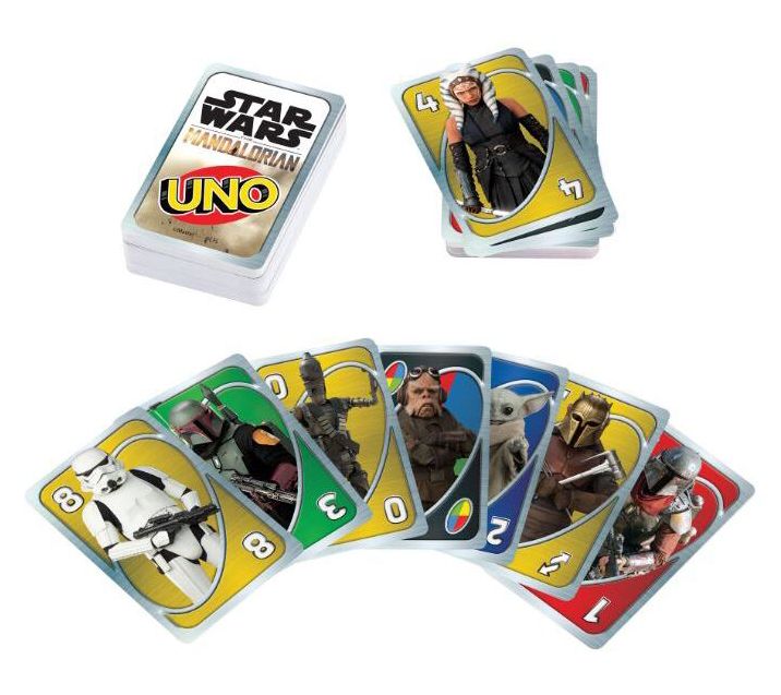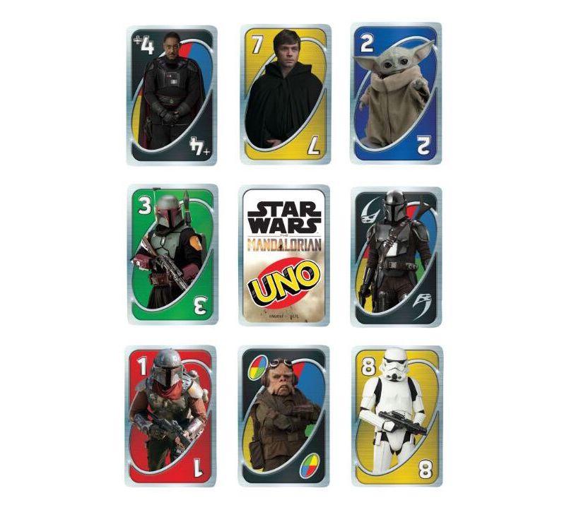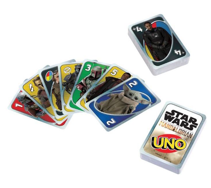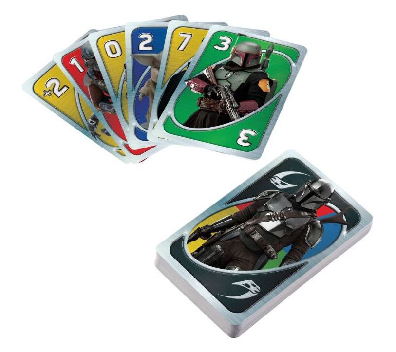 Enjoy a game night that's out of this galaxy when you play this fun Mandalorian version of Uno, all tucked away in a storage tin decorated with characters and graphics from the beloved series! From Mattel.