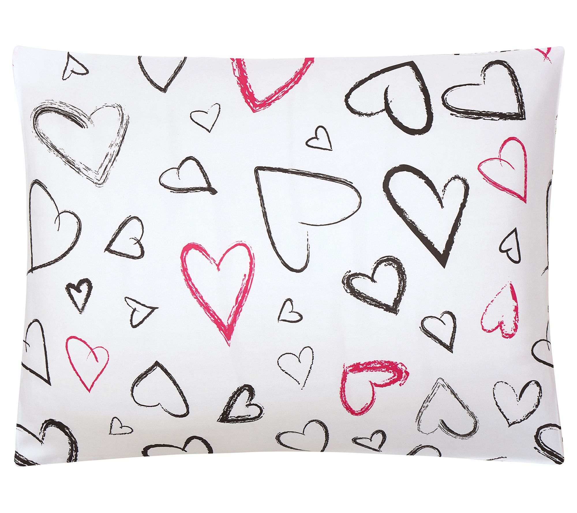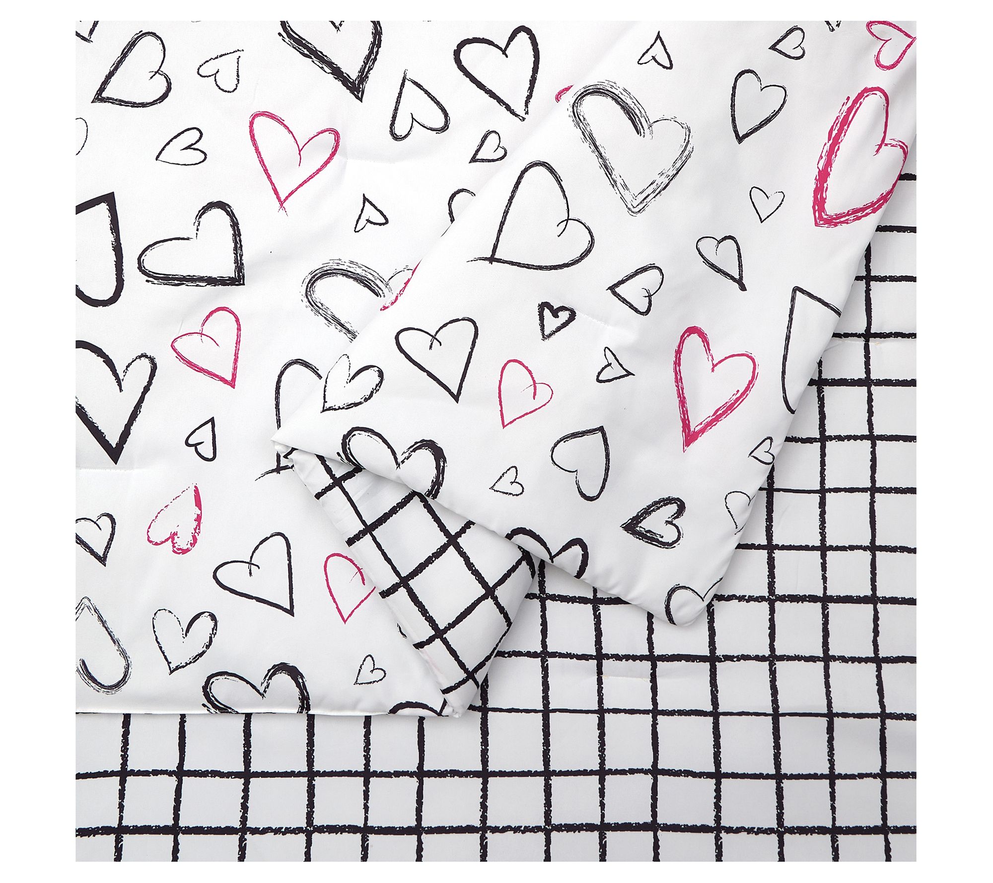 Bring a touch of playful charm to your bedroom with the Urban Playground Roxy Hearts Comforter Set. Featuring a delightful heart pattern that reverses to a modern black and white grid design, this set allows you to switch up your look whenever you choose. Crafted from 100% brushed polyester, this comforter is incredibly soft and durable. From Urban Playground.