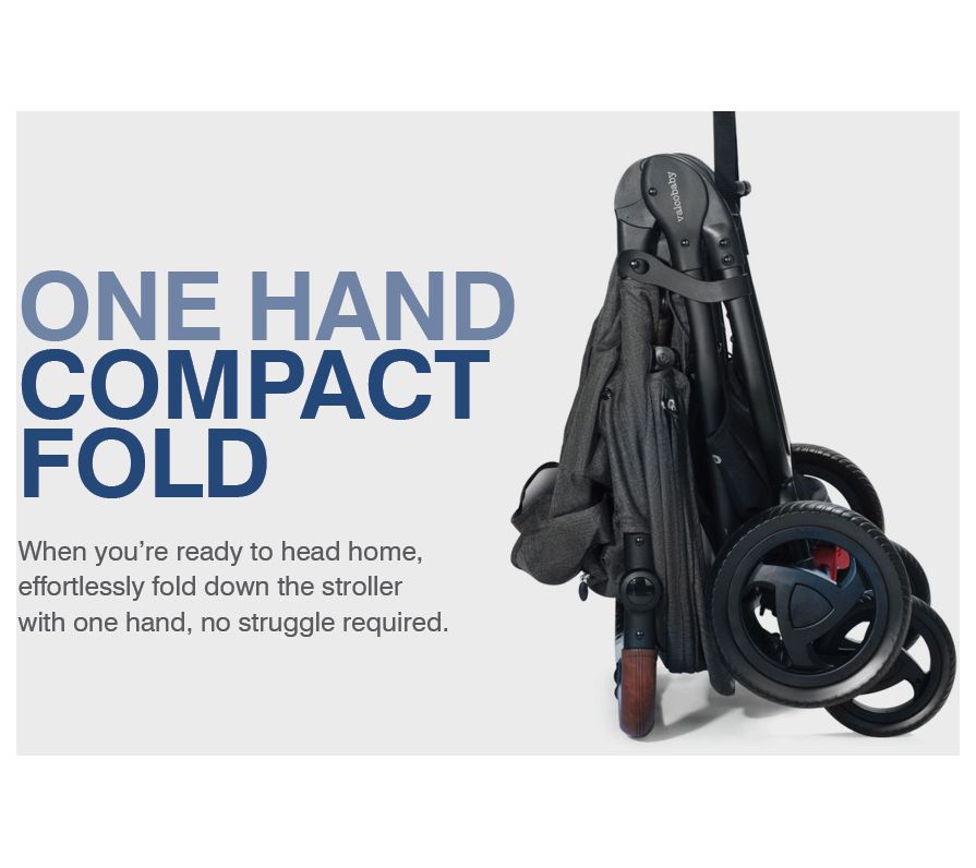 Compact one-hand fold, auto-lock, adjustable handles, footrests, large storage basket, pockets, handle straps, five-point harness, twin vents, peek-a-boo windows