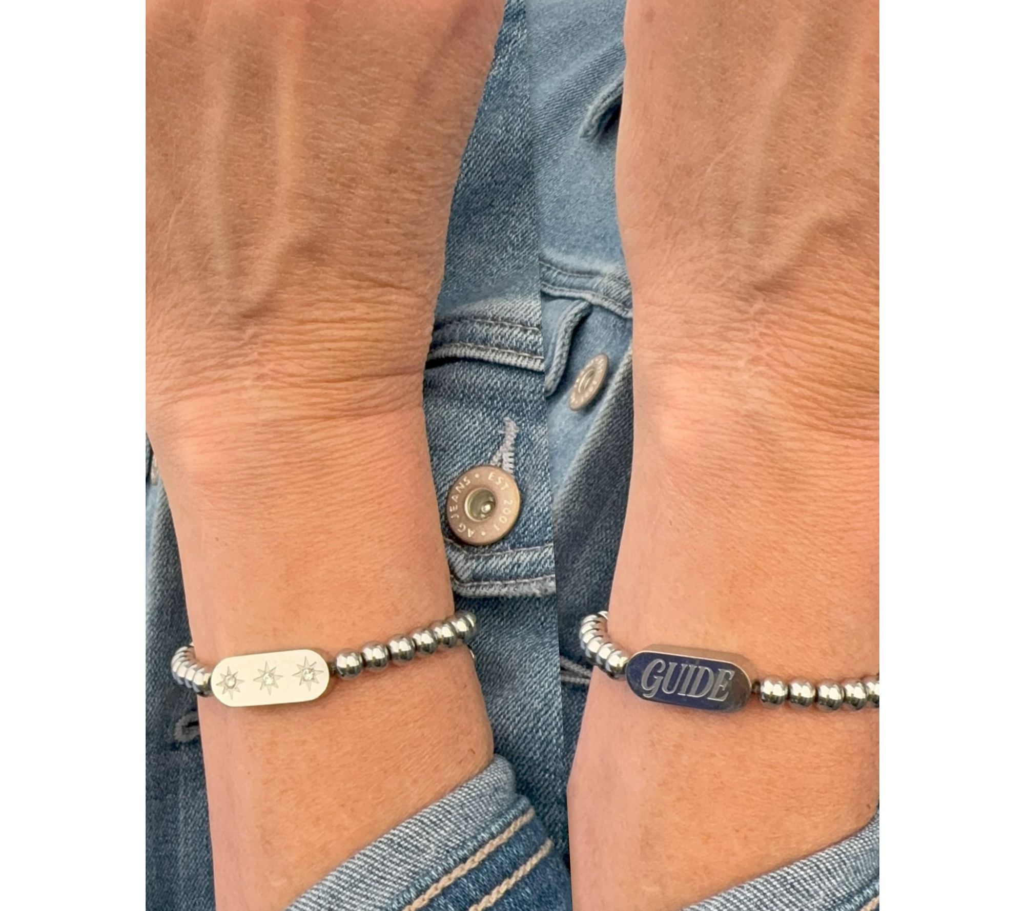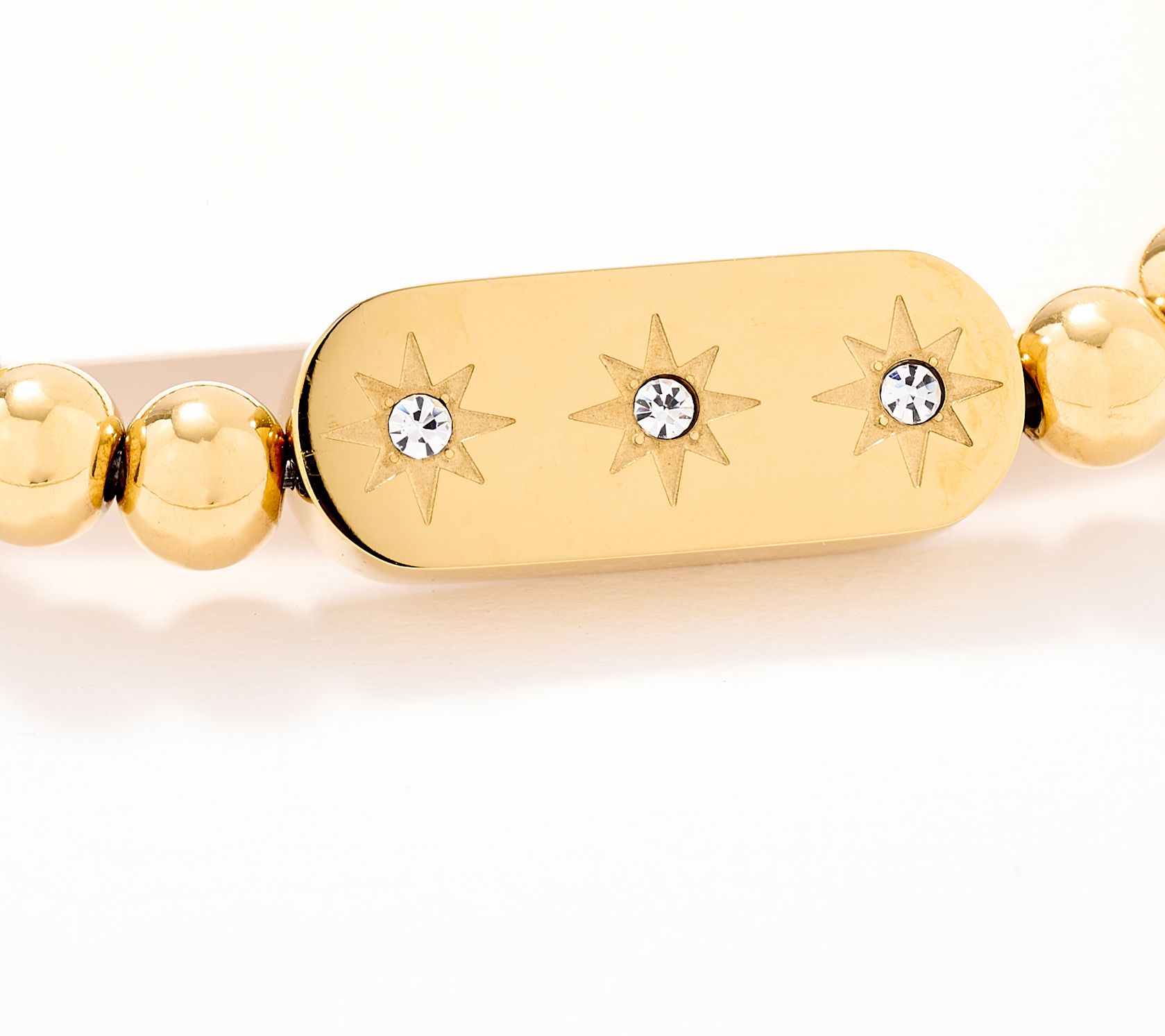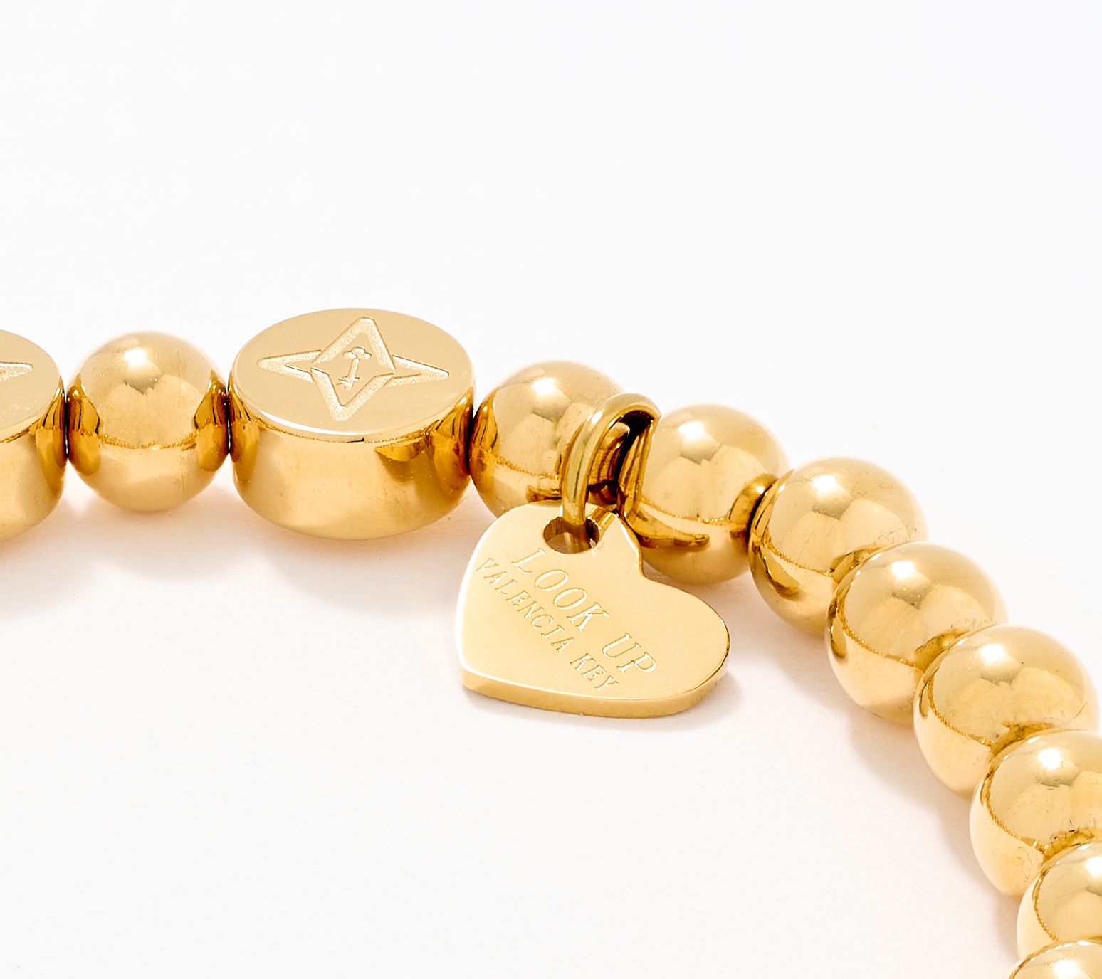 Beaded stretch bracelet style; two-sided station features three crystal star accents on one side and "Guide" message on the other; heart charm engraved with "Look Up" message; three logo beads with signature star symbol