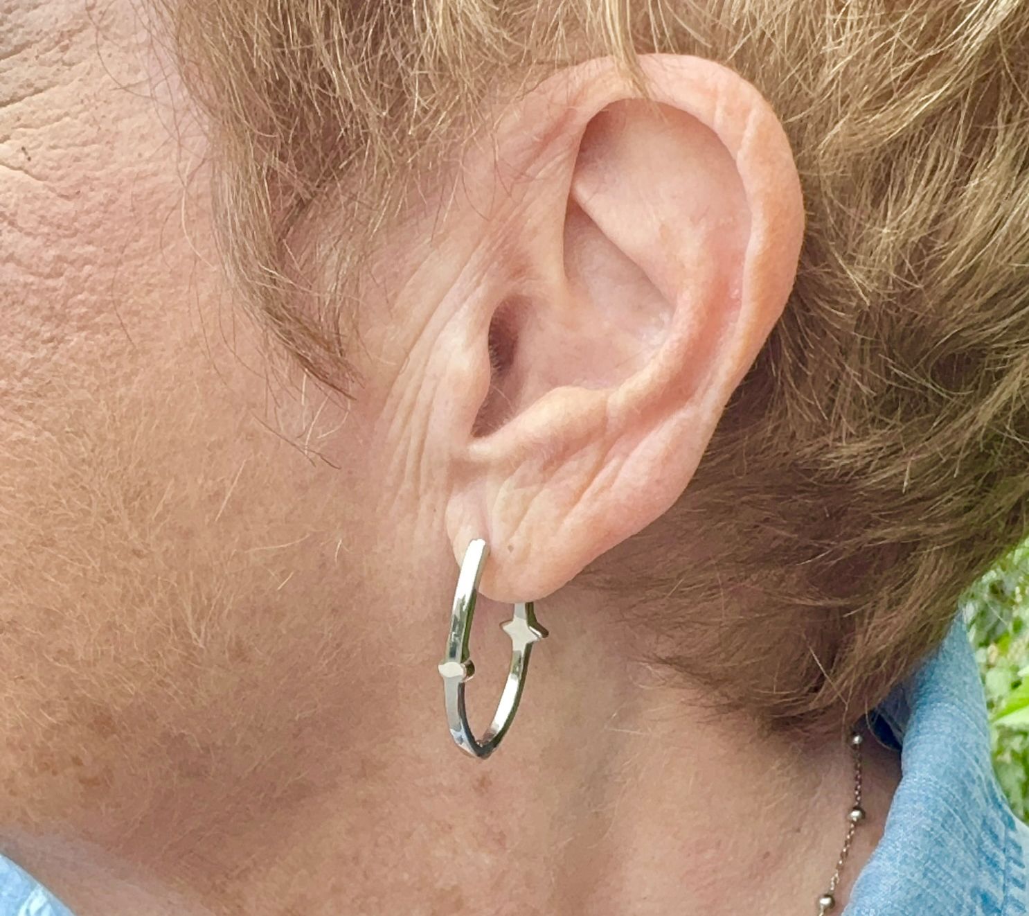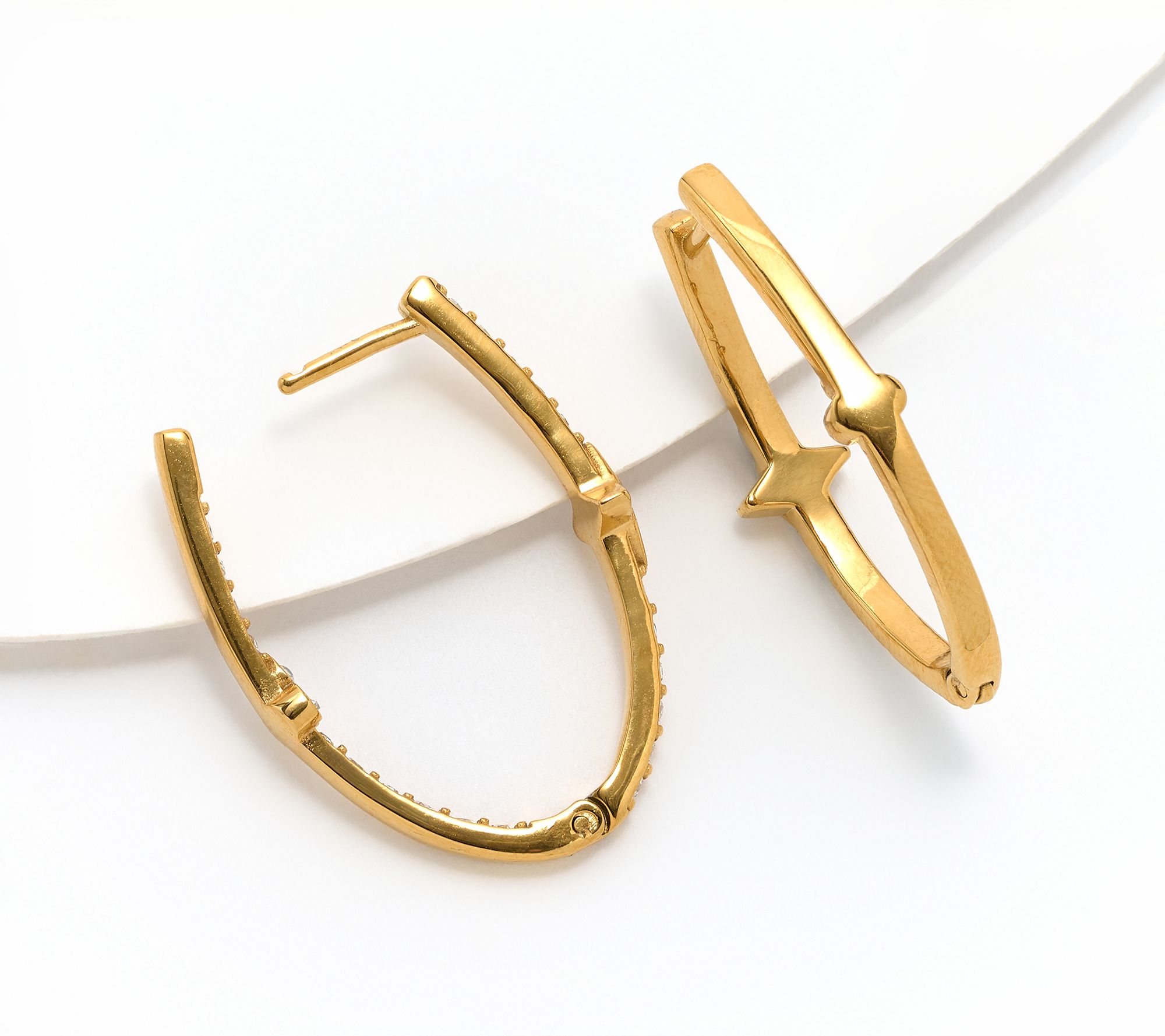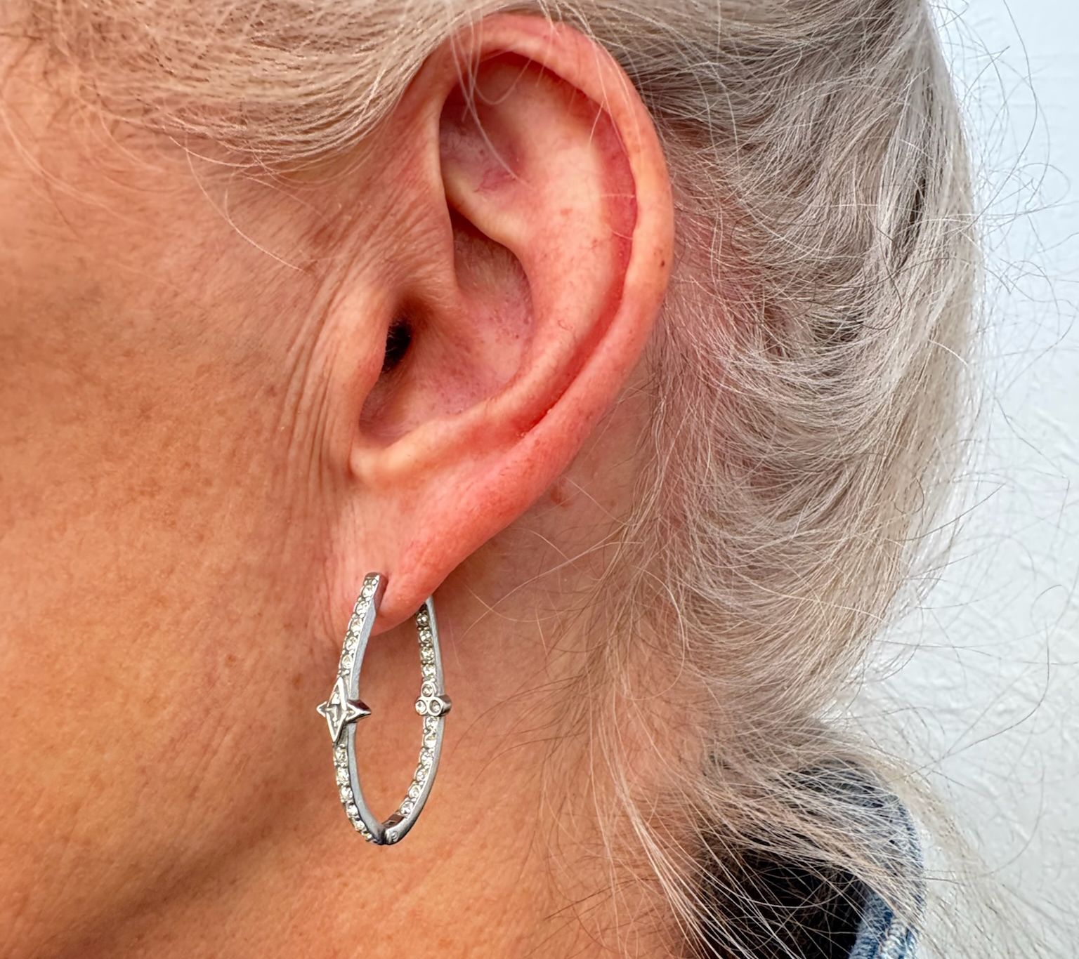 • Reversible hoops; single row of crystals front to back; reversible to smooth polished side; star logo detail