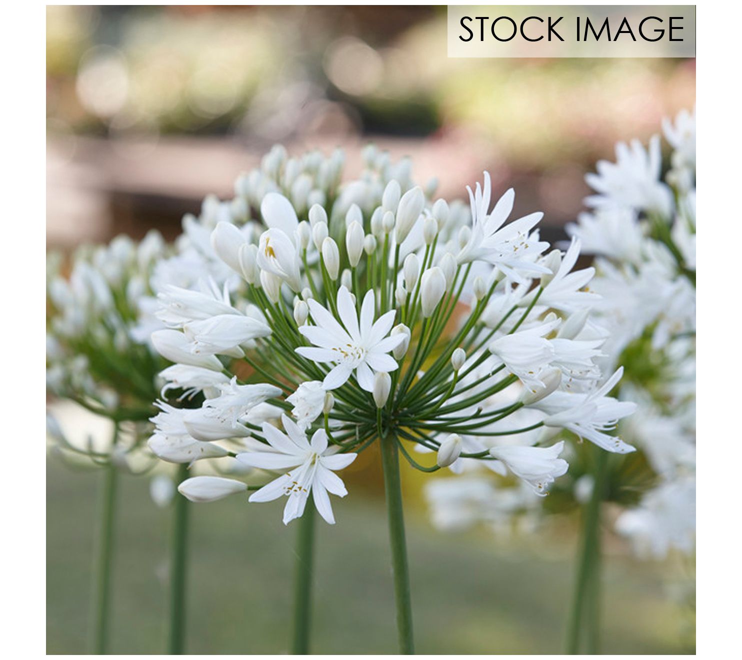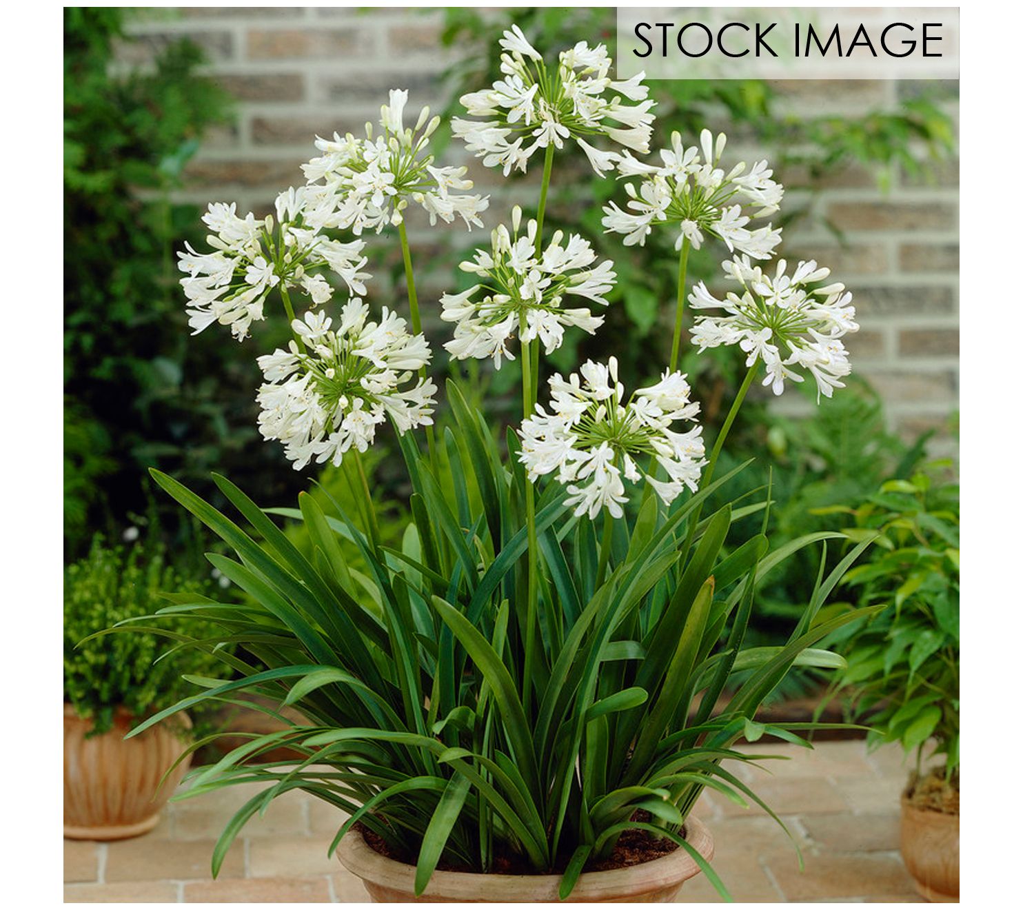 An evergreen perennial, Agapanthus White produces large flower clusters on tall stalks arising from a mound of strap-shaped leaves. From Van Zyverden.