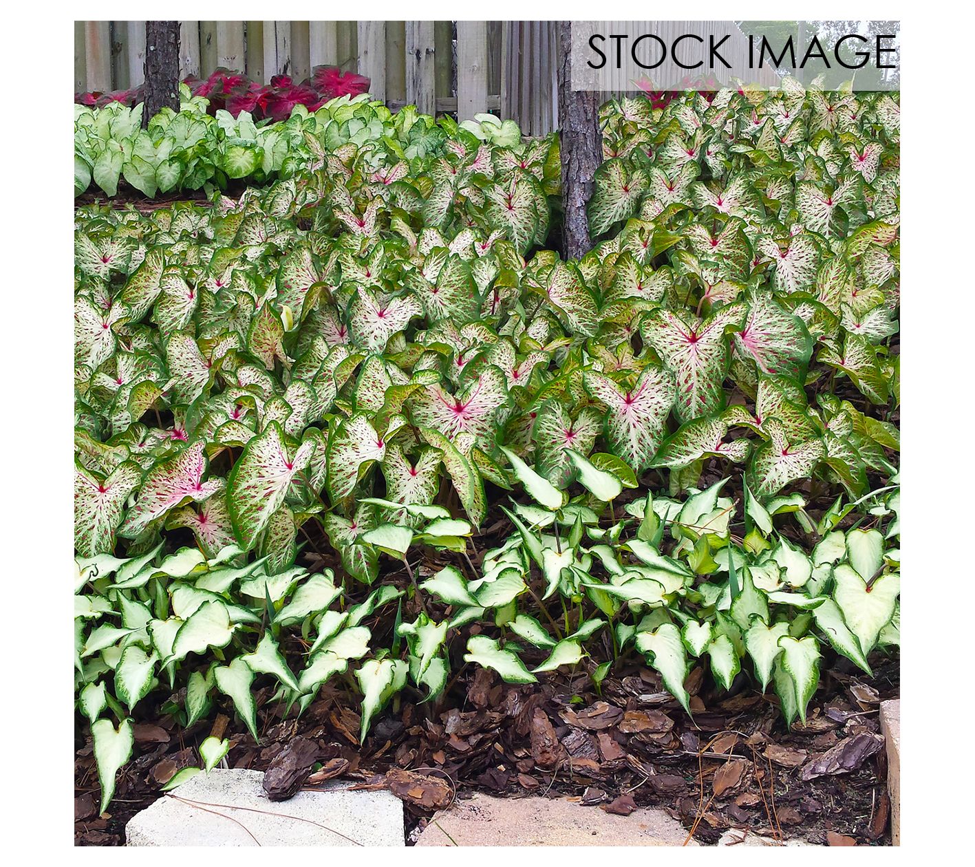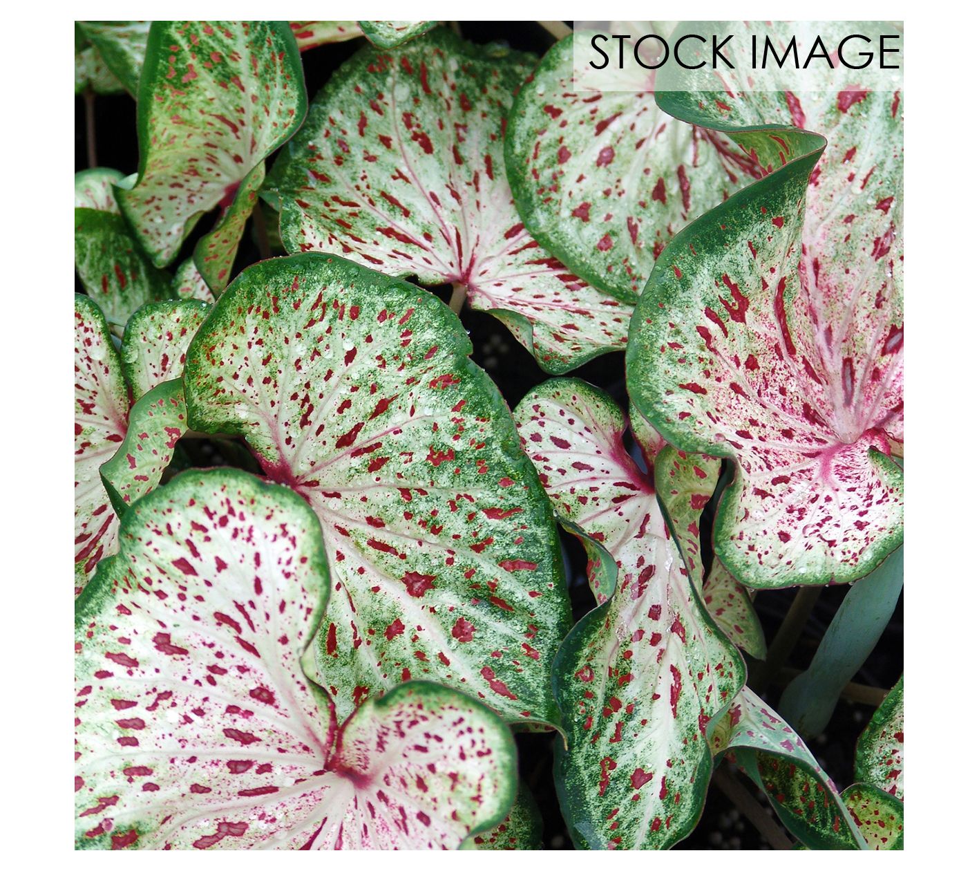 Enhance your garden with the striking colors of caladiums. These beautiful tropical plants are known for their lush, contrasting edges, veins, and multi-colored foliage. Whether you place them in hanging baskets, patio pots, or borders, their creamy white leaves with raspberry specks and green margins will add a vibrant touch to any outdoor space. From Van Zyverden.