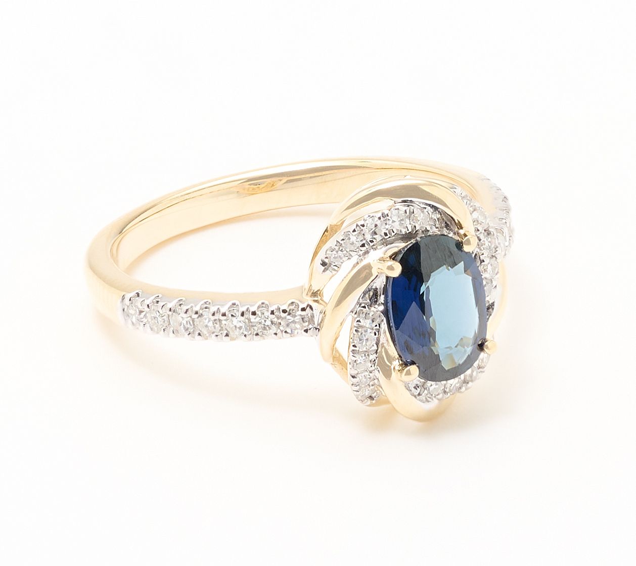 Prong-set, oval-cut blue sapphire in center; halo of diamonds with rhodium-plated settings; polished finish