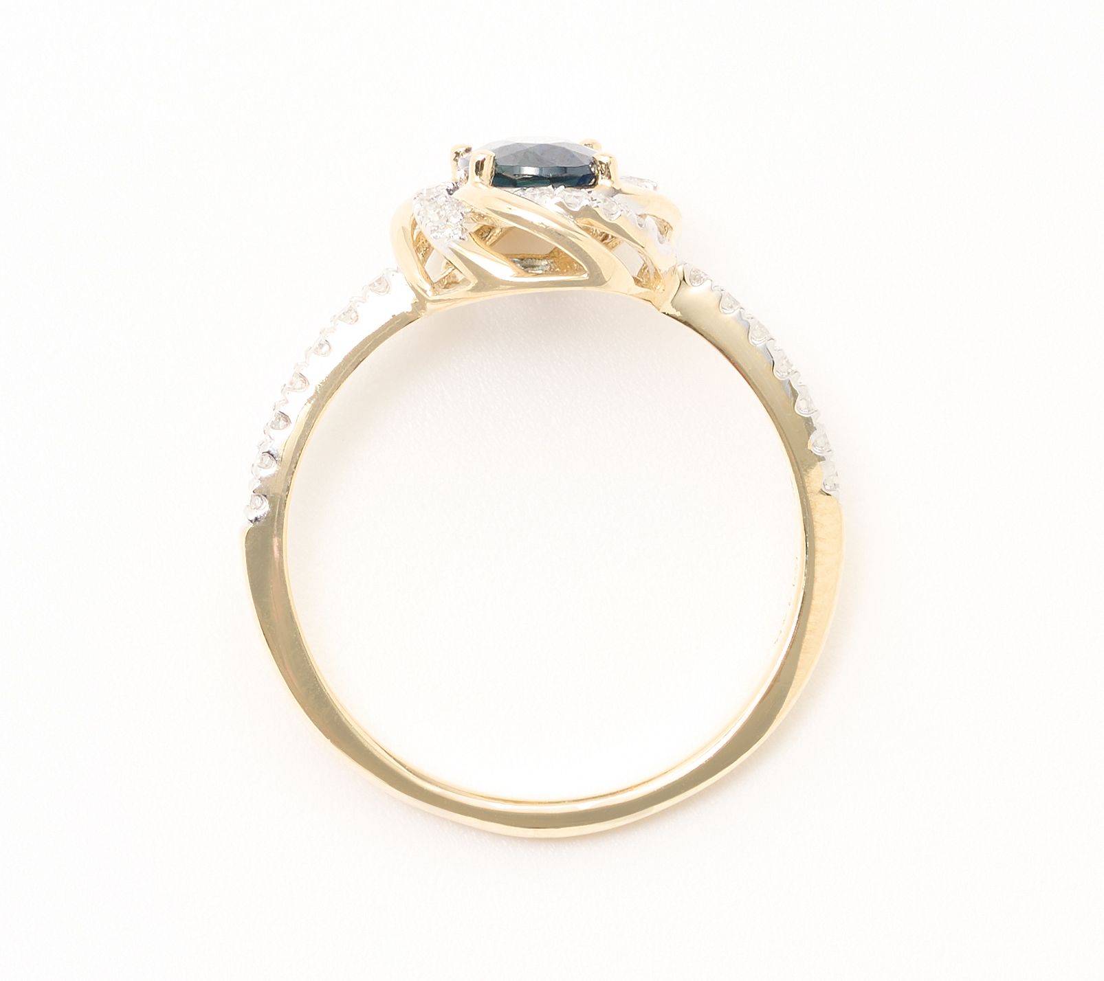 A deep blue sapphire glows at the center of this 14K yellow gold ring, framed by a sparkling diamond halo for a look that easily transitions from a celebratory dinner to everyday elegance. Delicate rhodium-plated diamond settings provide added shimmer, while the polished finish highlights the vibrant hues. From Vault Discoveries.