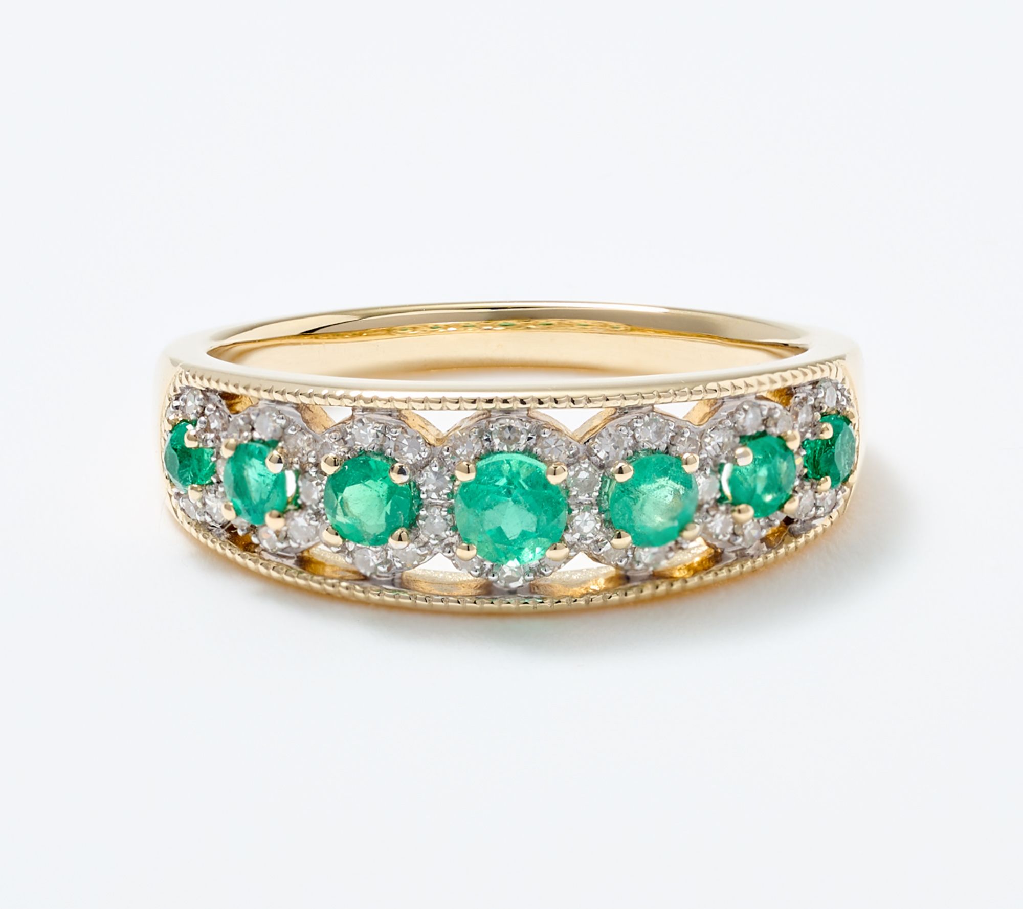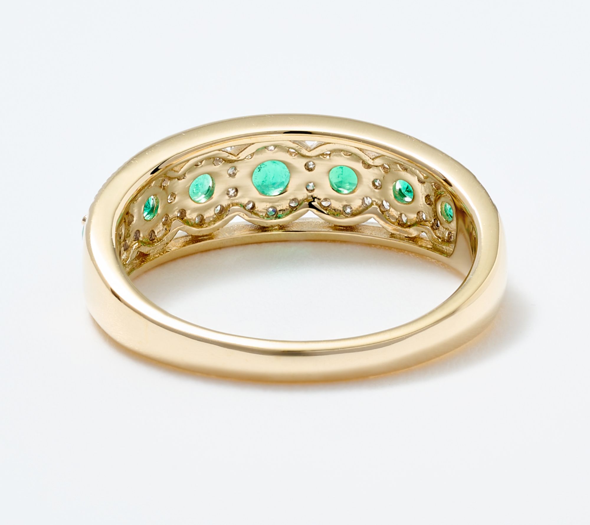 Five luminous round Colombian emeralds grace this standout band ring, accentuated with a sparkling halo of white diamonds for a look that's both elegant and striking. Set in polished 14K yellow gold with rhodium-plated diamond settings, this ring shines whether worn solo or paired with other favorites to mark life's special moments. From Vault Discoveries.