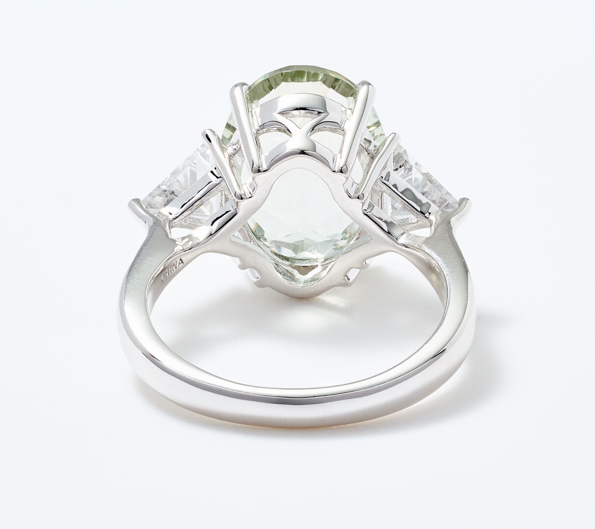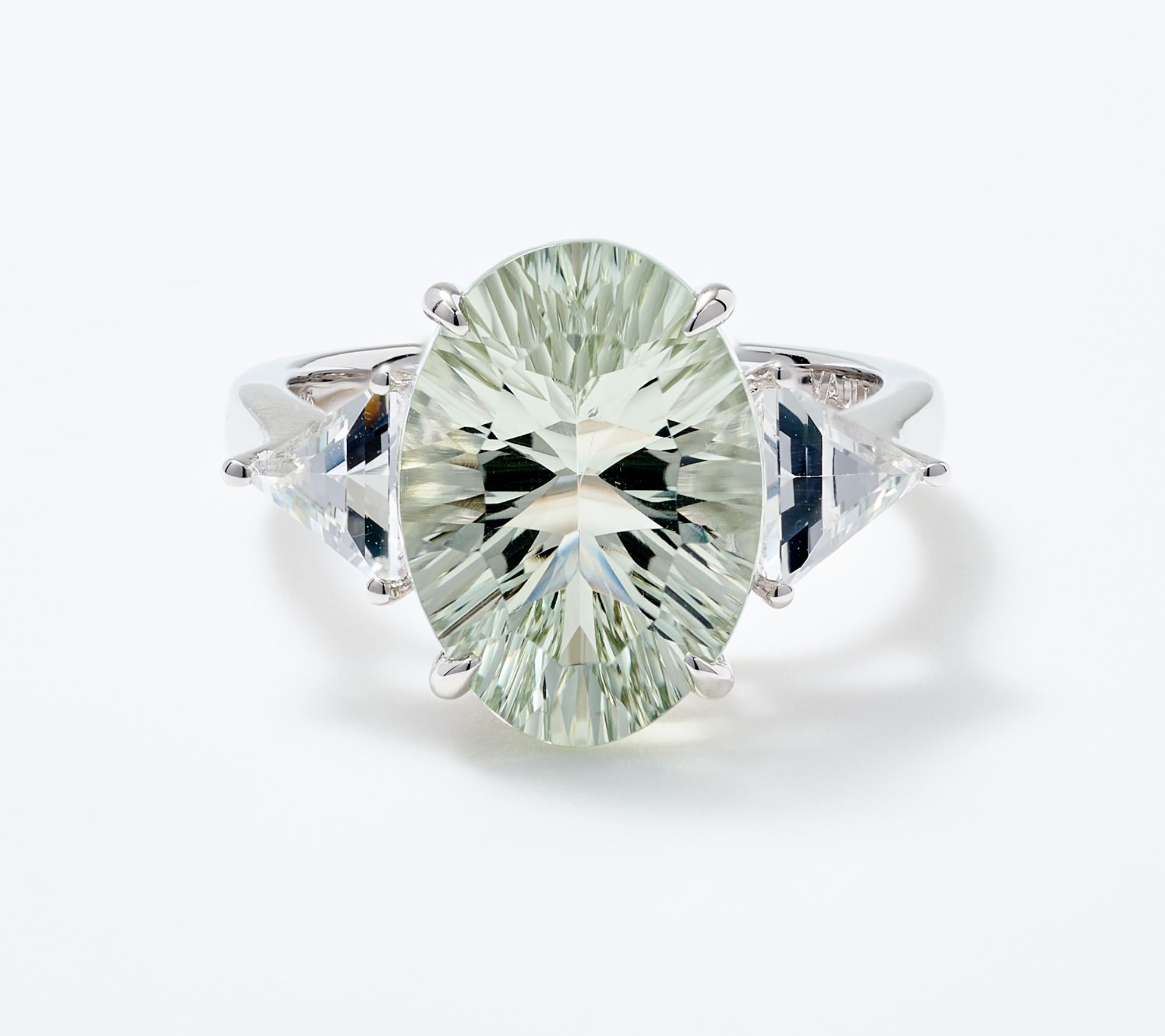 • Oval, millenium-cut gemstone in center; prong set; trilliant-cut white topaz accents; polished finish