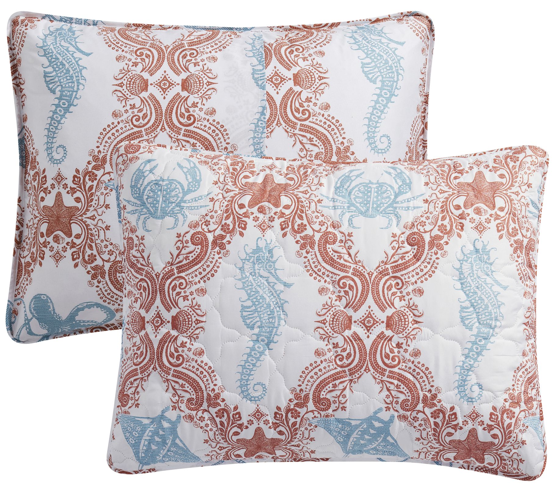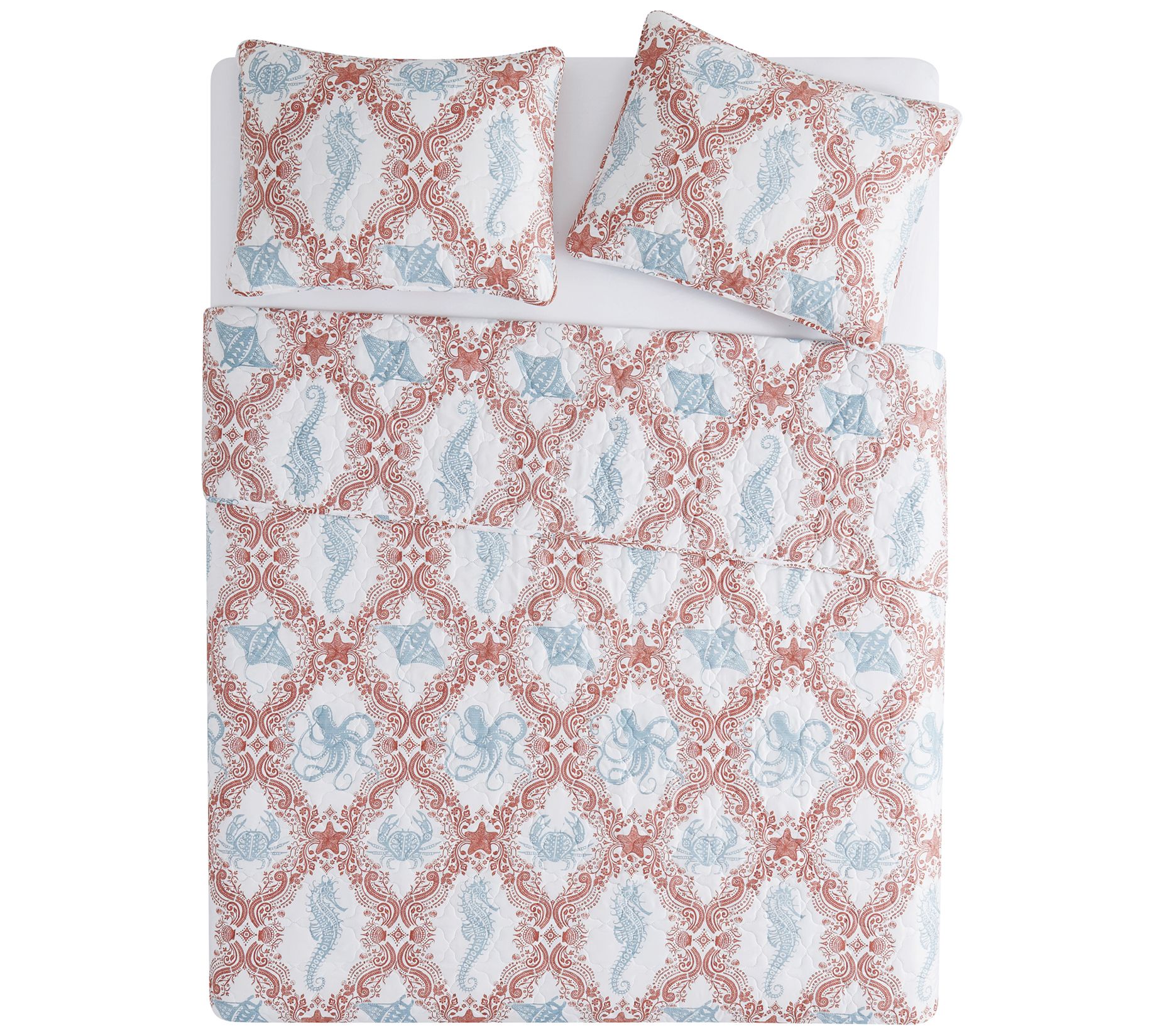 Dive into a serene sleep experience with this quilt set featuring charming seahorses, crabs, and other sea life prints in soothing coral and seafoam green. This set brings the tranquility of the ocean right into your bedroom. From VCNY Home.