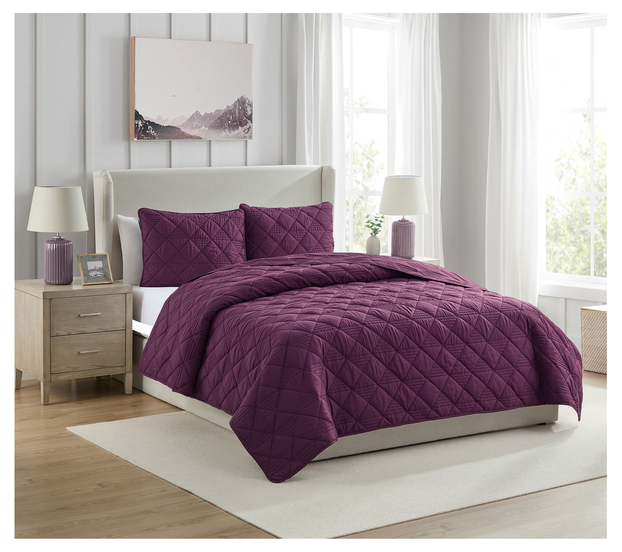 Transform your bedroom into a serene sanctuary with the VCNY Home Lucy three-piece quilt set. Perfect for any season, this cozy set features a pinsonic textured diamond design and is pre-washed for extra softness. From VCNY Home.