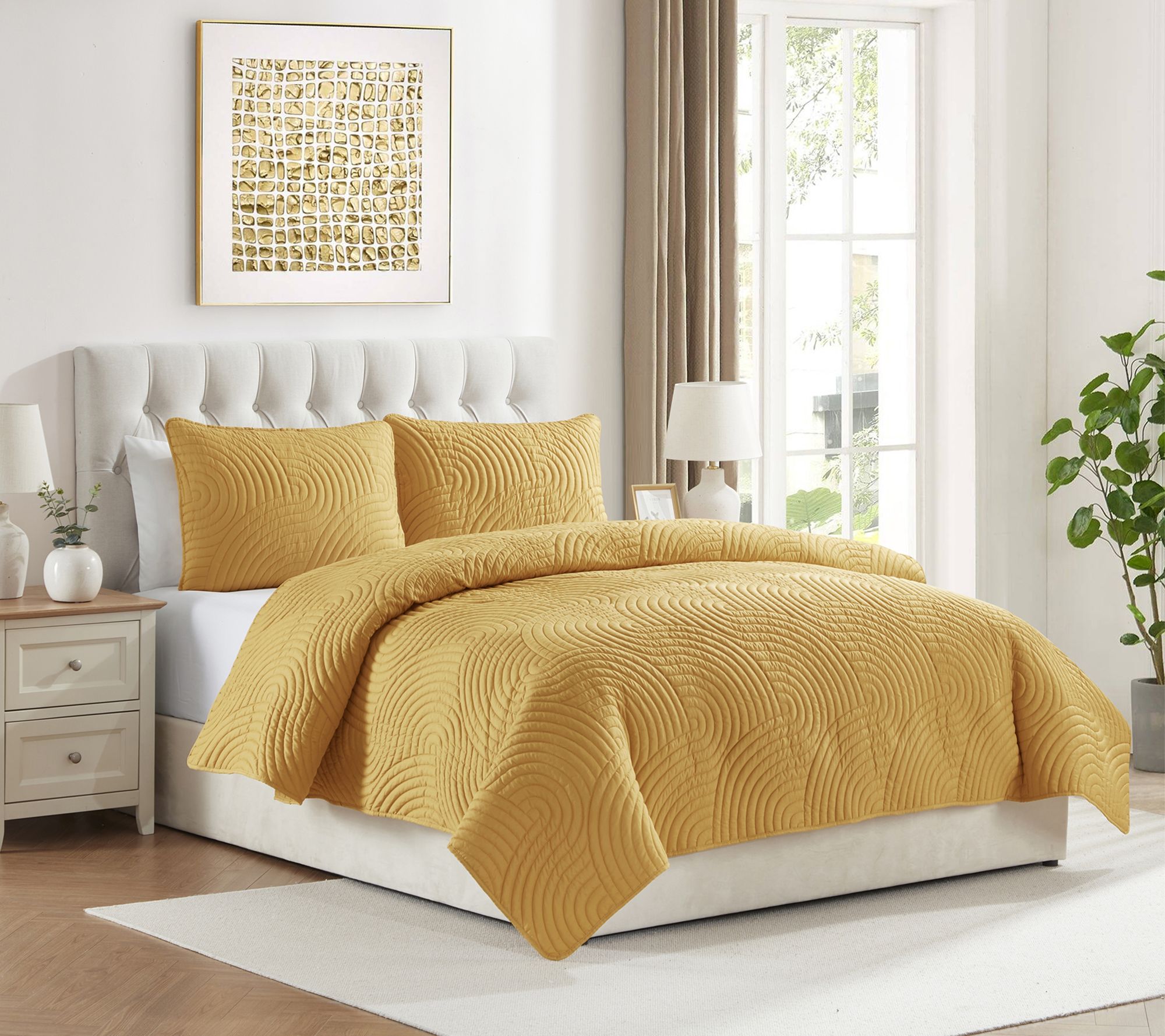 Transform your bedroom into a serene retreat with this textured quilt set. Curved stripe patterns add a touch of elegance, while the soft and lightweight quilt ensures comfort in all seasons. From VCNY Home.