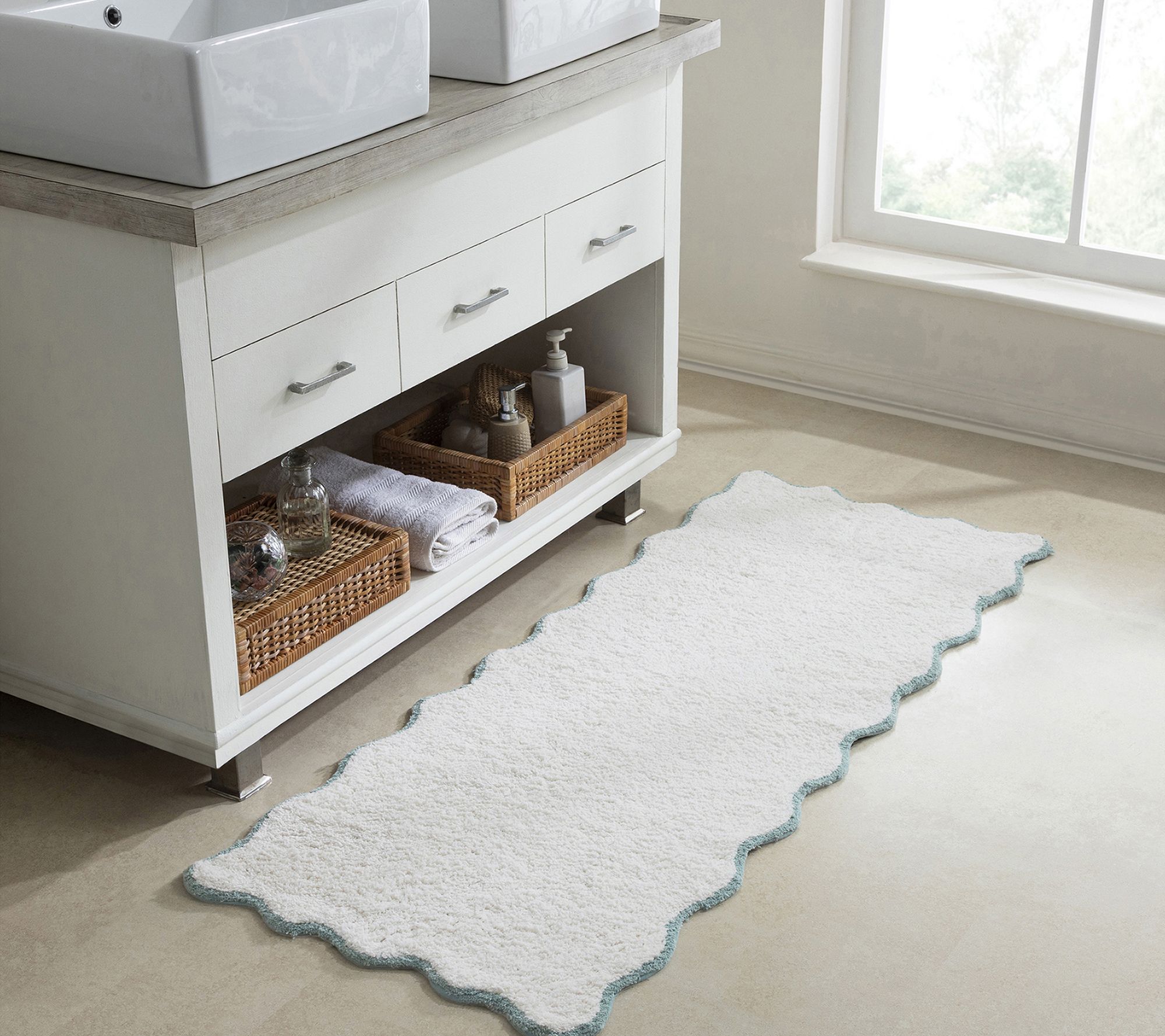 Welcome guests with a pop of style as you step out of the shower -- this cotton bath runner brings a touch of softness underfoot and flair to any bathroom space. Its scalloped detailing adds classic charm, while the substantial length covers more ground for a spa-like experience every day. From VCNY Home.