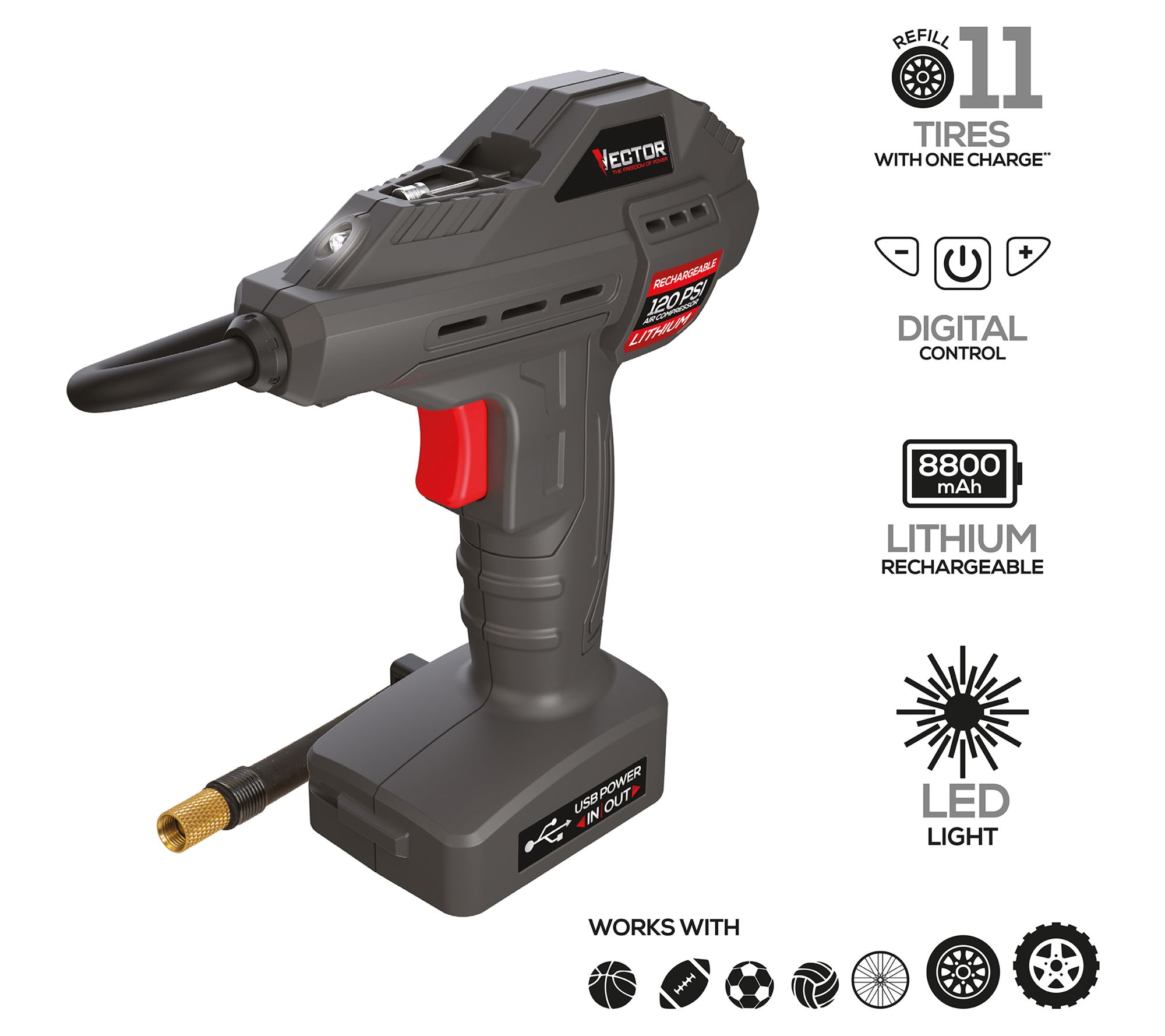 Don't let your plans fall flat! This convenient 120 PSI air compressor helps keep you -- and your tires -- pumped and ready for any adventure. The Sure Fit nozzle offers a secure connection, while the built-in LED light provides a spot of brightness when you need to use the compressor at night. From Vector.