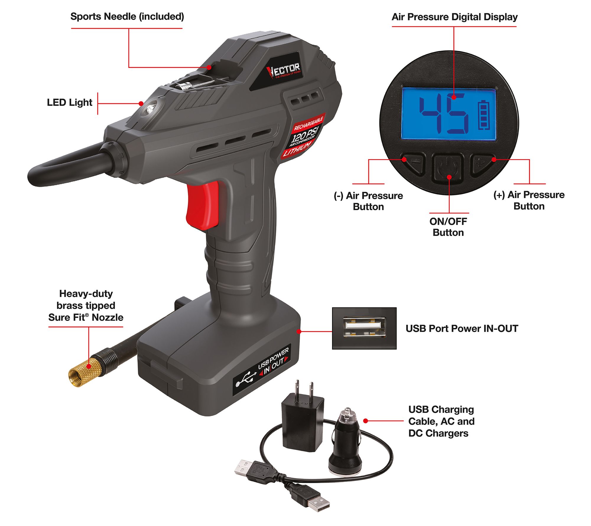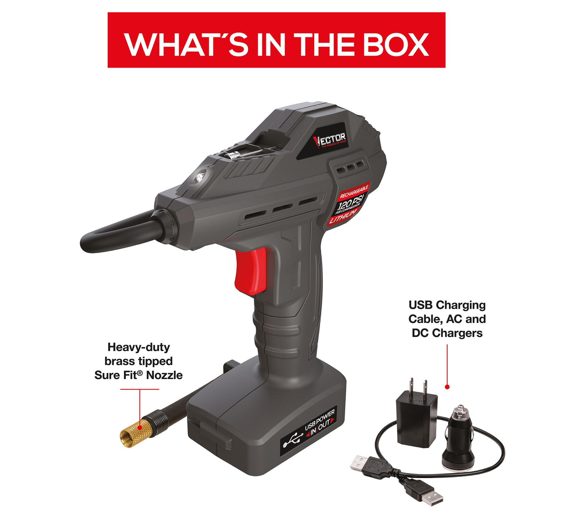 • Includes CLI120FV air compressor, AC and DC chargers, and USB charging cable