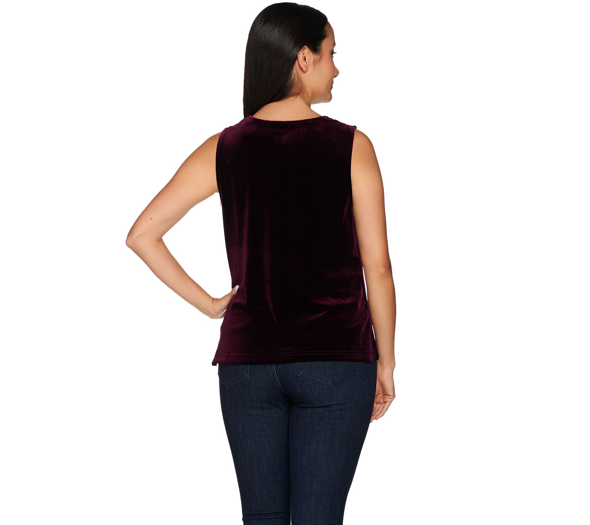 Style that simply goes with the flow. This whisper-soft, velvet tank drapes elegantly at the neck. Pair it with dark jeans for a dinner date or wear it layered under a suit jacket for a lustrous, finished look. From VT Luxe.