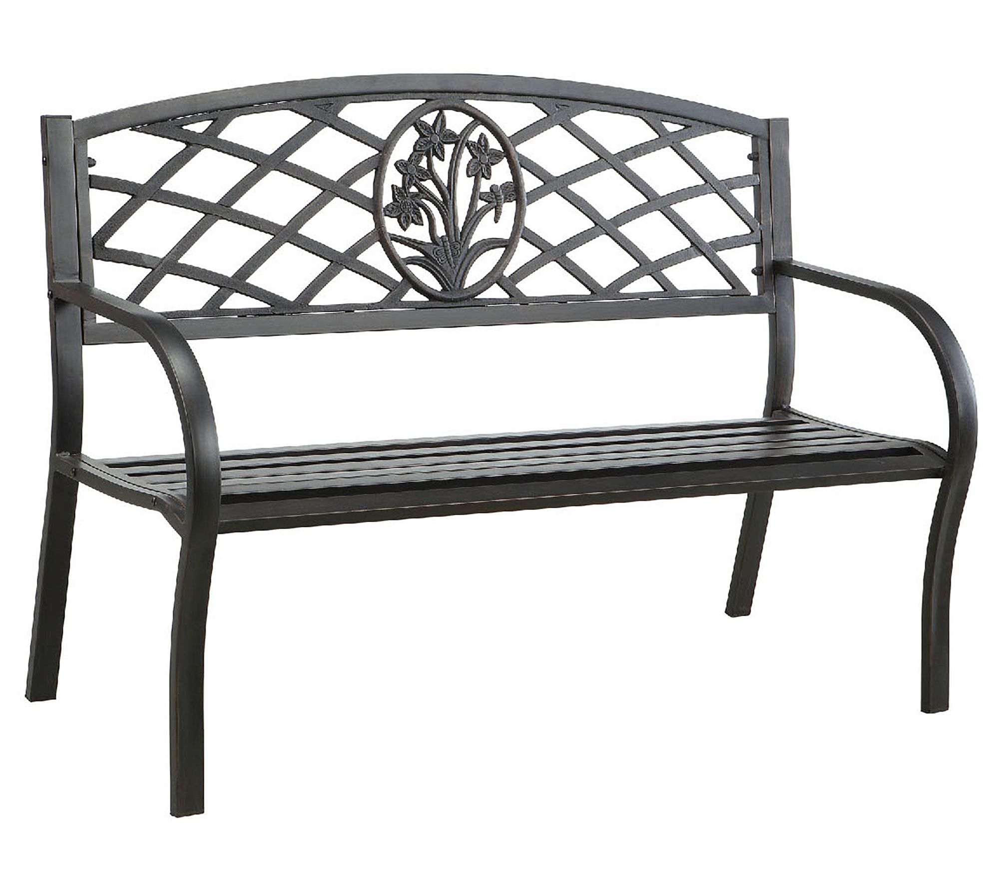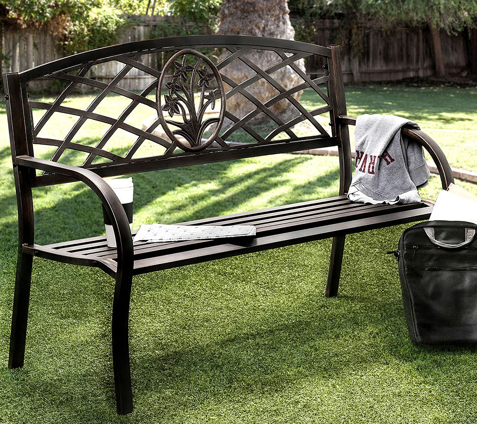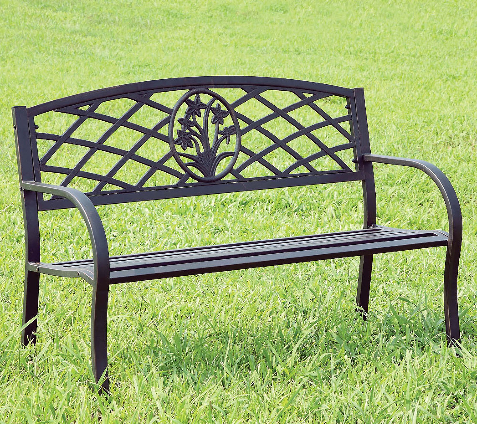 This stylish steel outdoor bench makes an ideal place to sit a spell and take in the warm sunshine or gaze at the stars. From Venetian Worldwide.