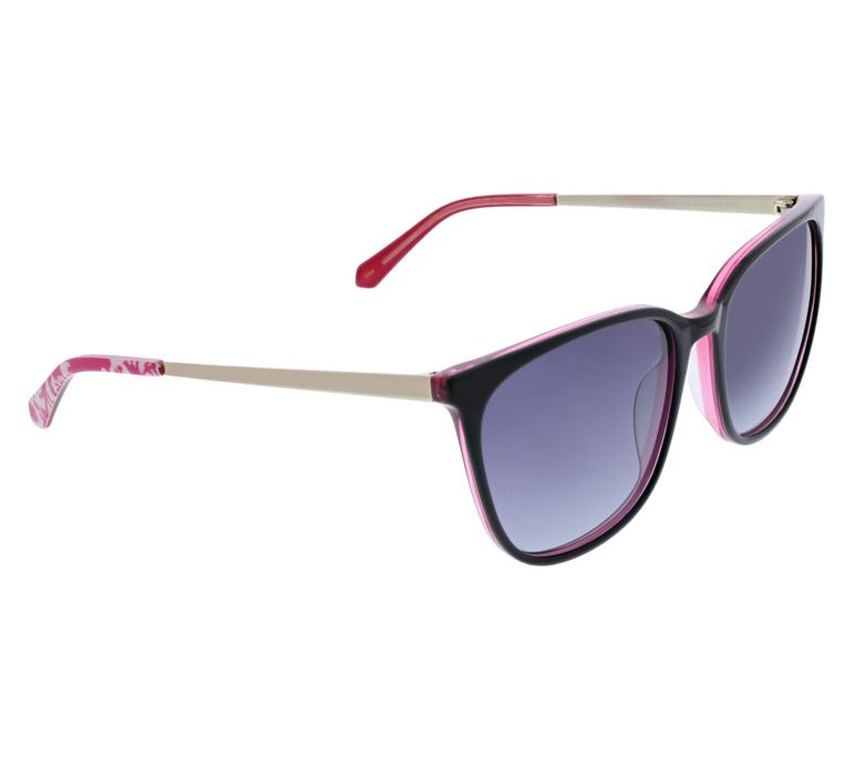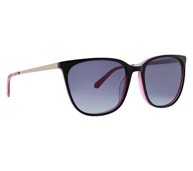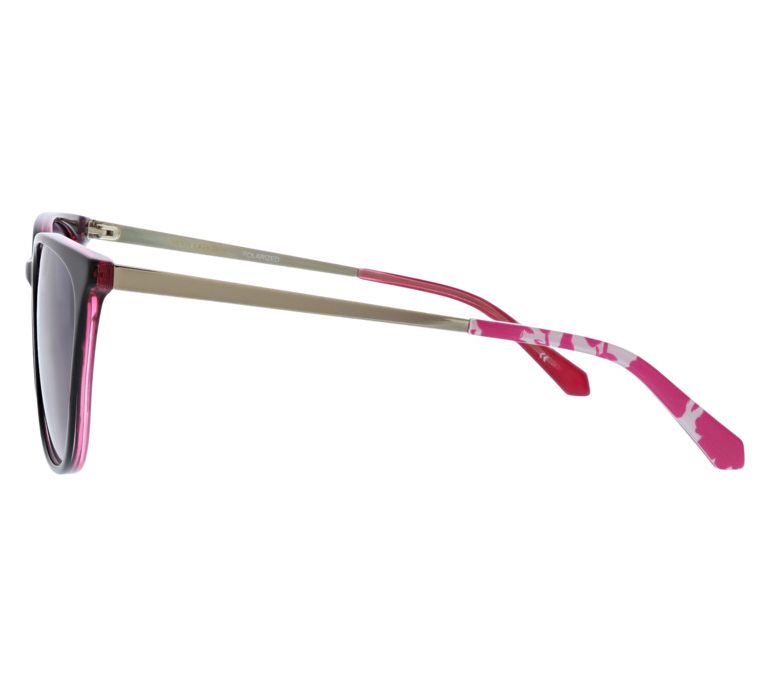 • Features: oversize round polarized lenses, black front frame with pink acetate backing, signature print on acetate temple tips, logo plaque on temple