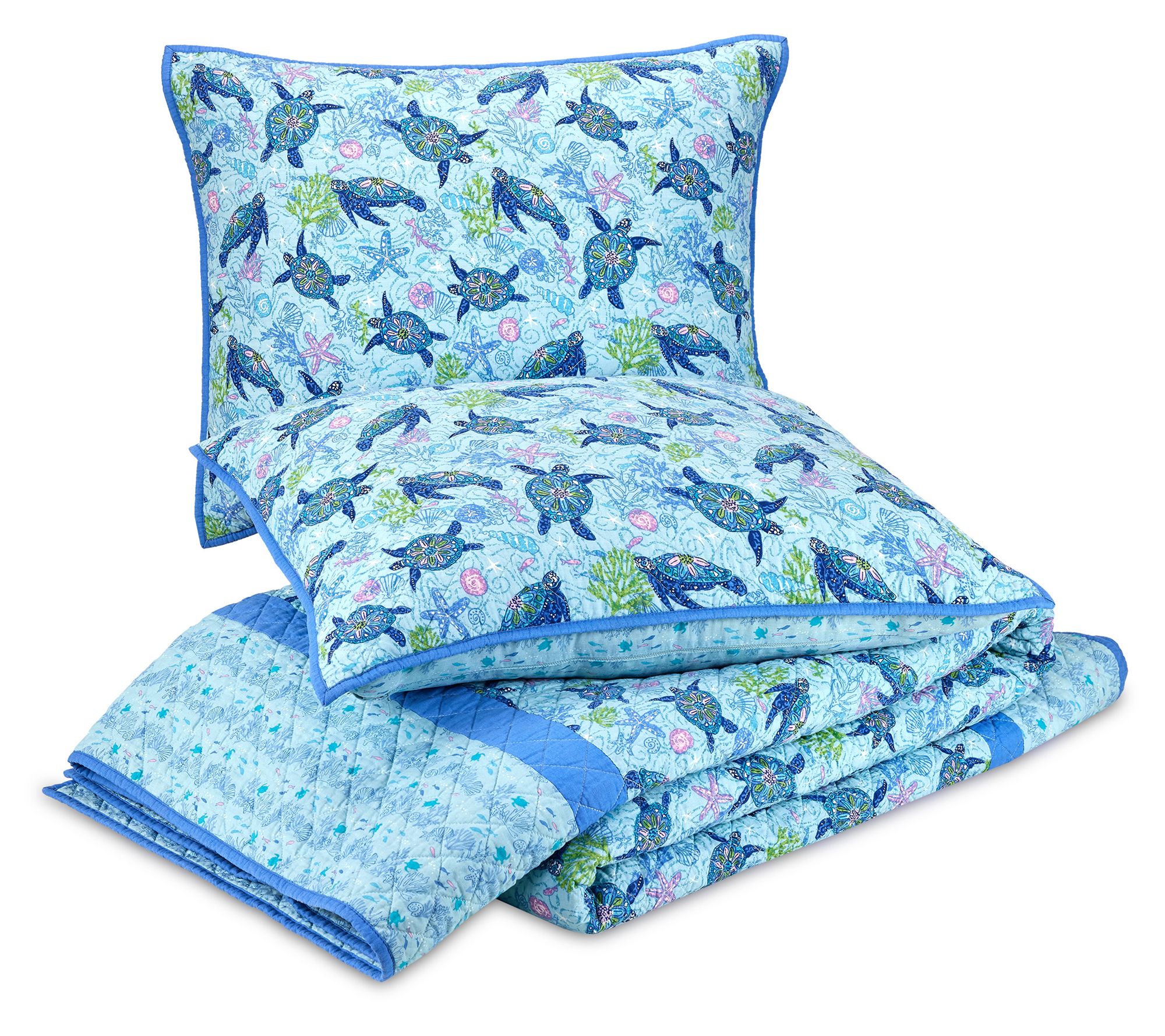 Escape to an underwater paradise when you transform your bedroom with the Turtle Dream quilt set. One side showcases a vibrant under-the-sea pattern while the other side offers a soothing, all-over coastal print. From Vera Bradley.