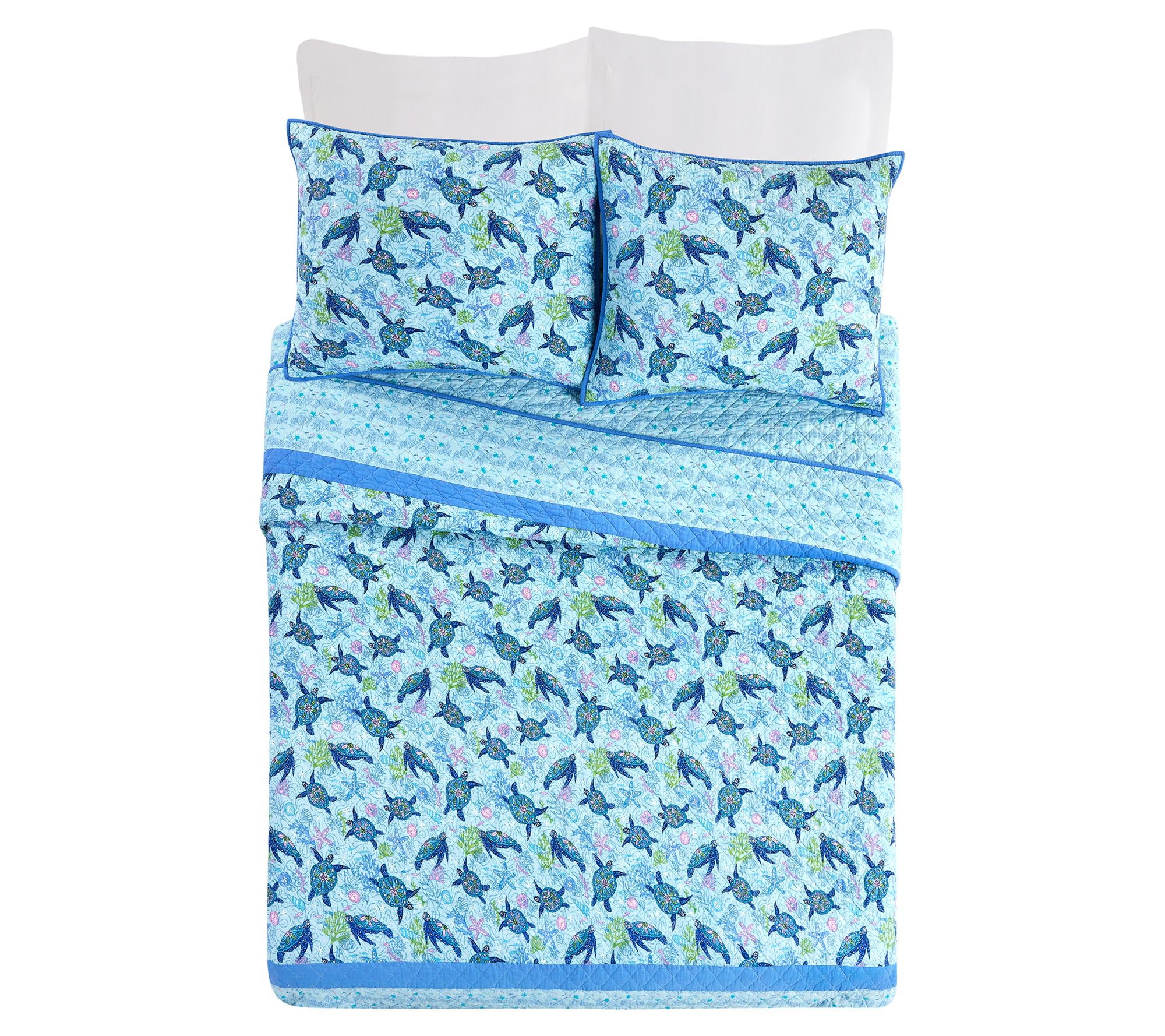 Escape to an underwater paradise when you transform your bedroom with the Turtle Dream quilt set. One side showcases a vibrant under-the-sea pattern while the other side offers a soothing, all-over coastal print. From Vera Bradley.