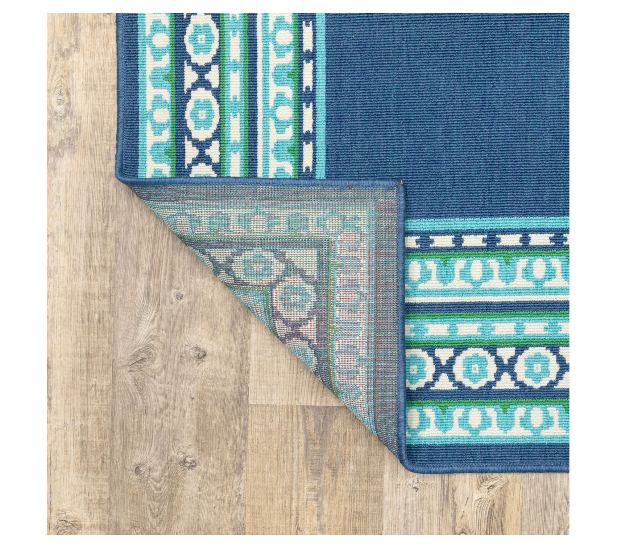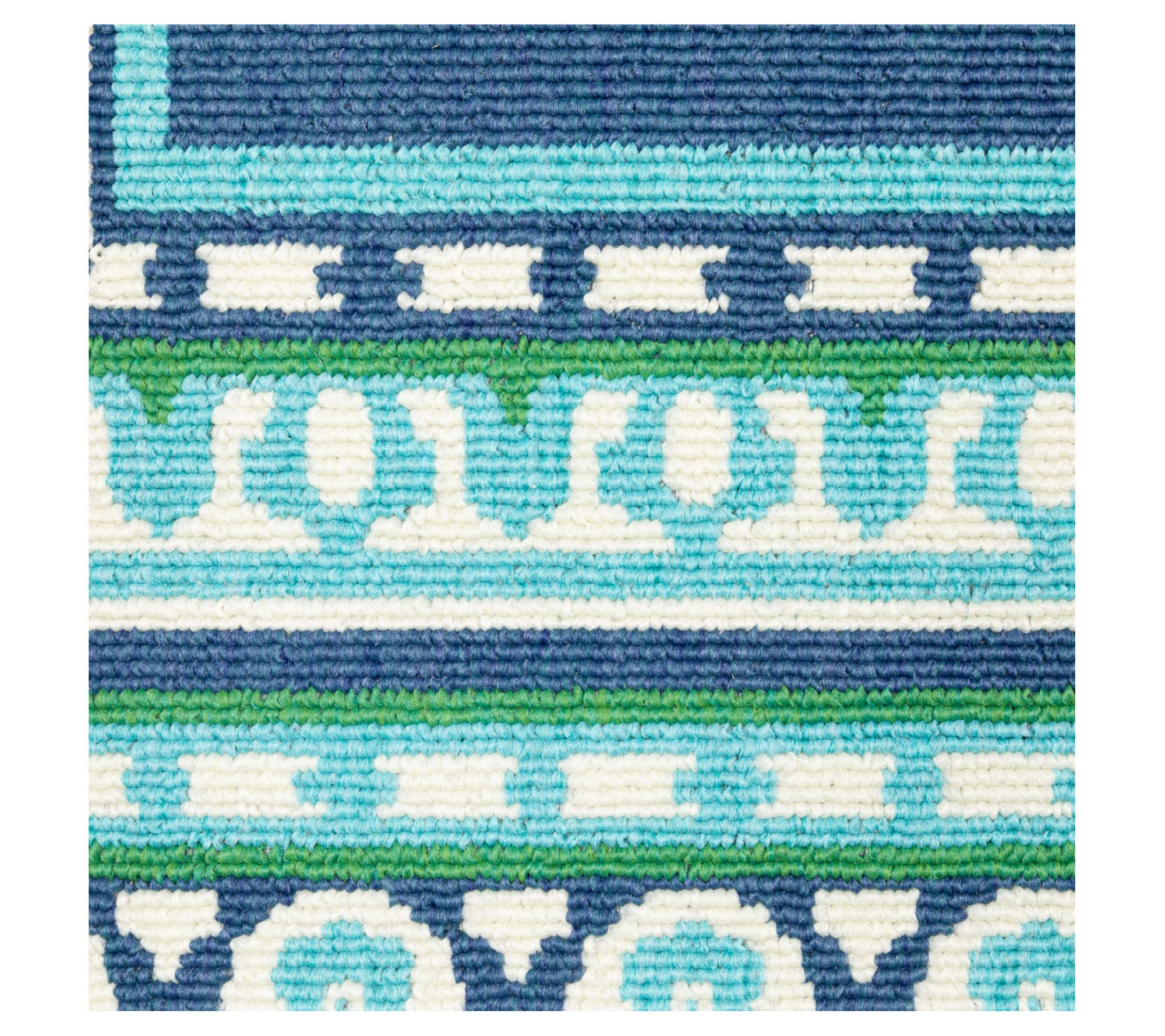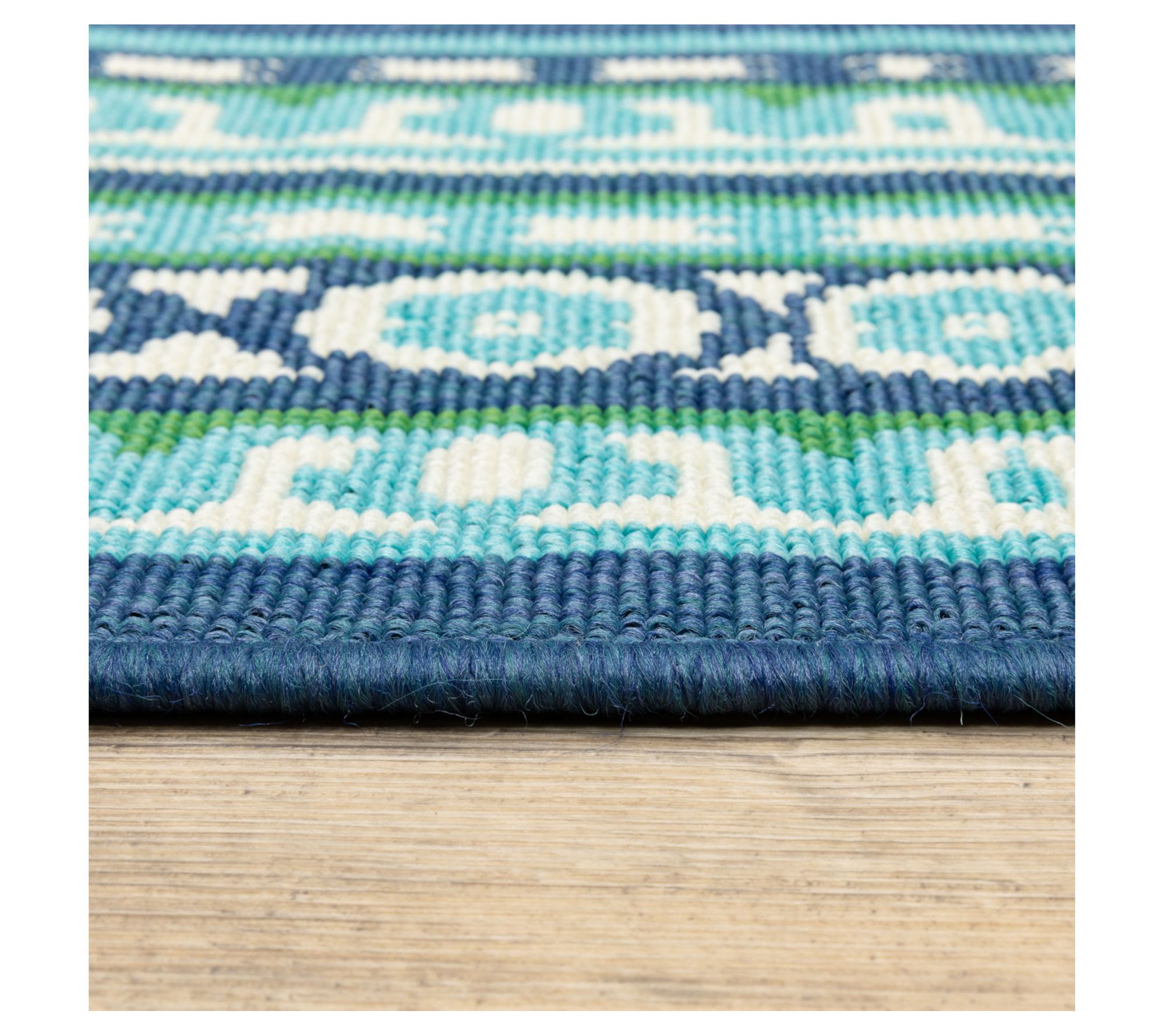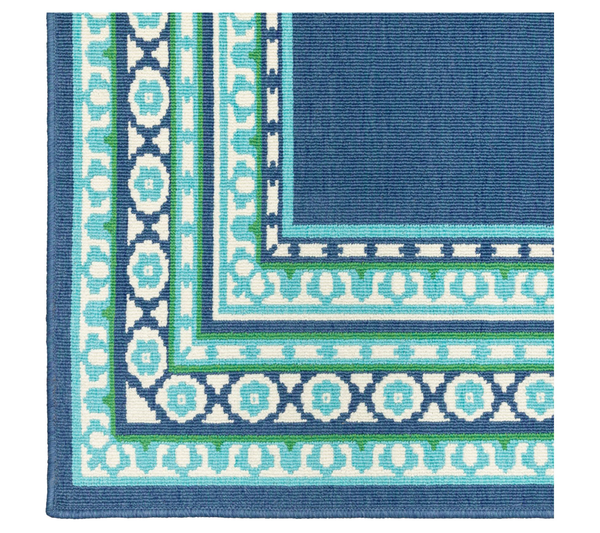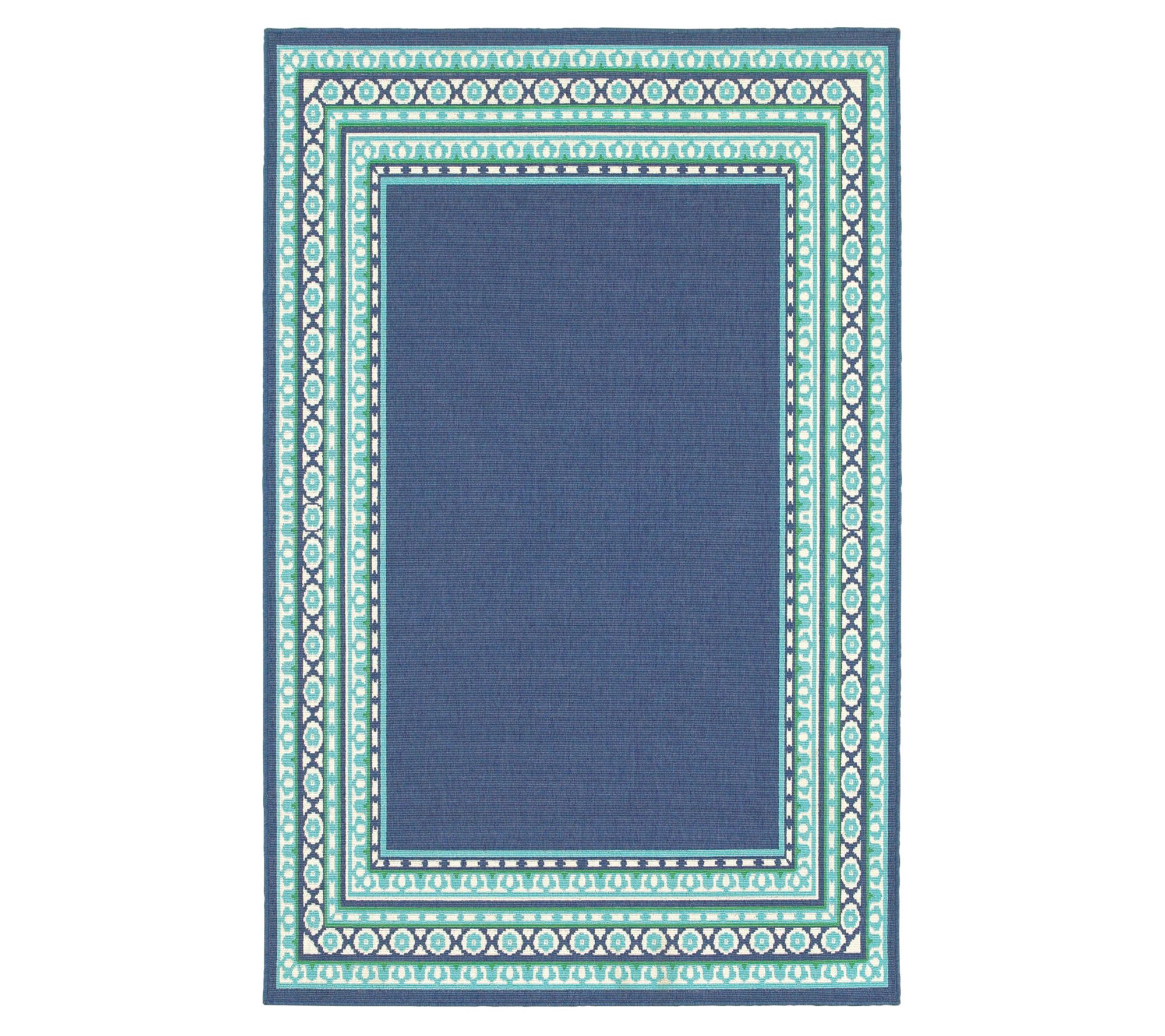 With a beautiful border pattern and a fresh mix of greens and blues, this durable rug brings a splash of style to a patio, dining area, or poolside deck. From Veranda Living.