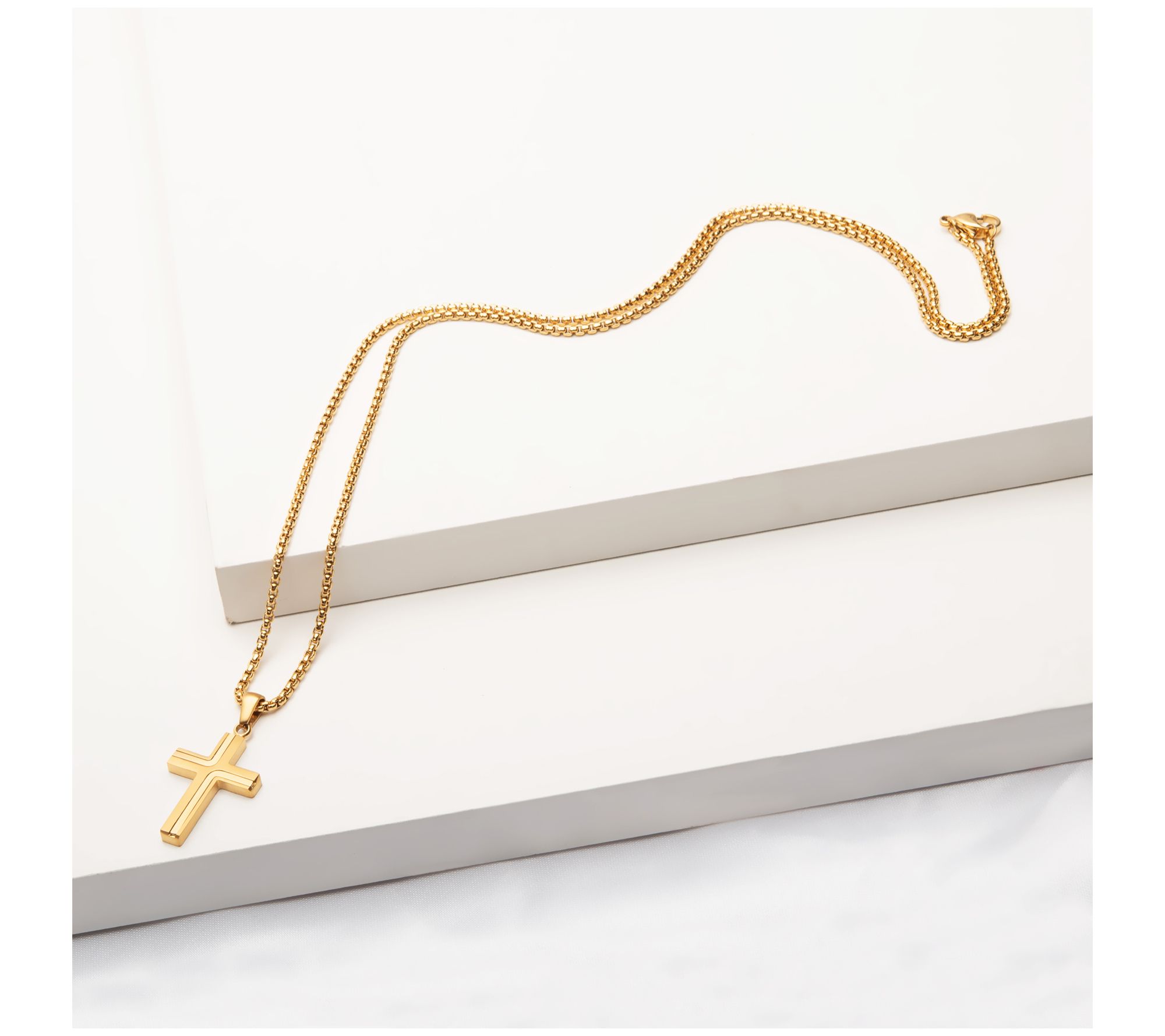 Show off your faith with this masculine goldtone stainless steel cross pendant and sturdy box chain. From Verve Men's Jewelry.