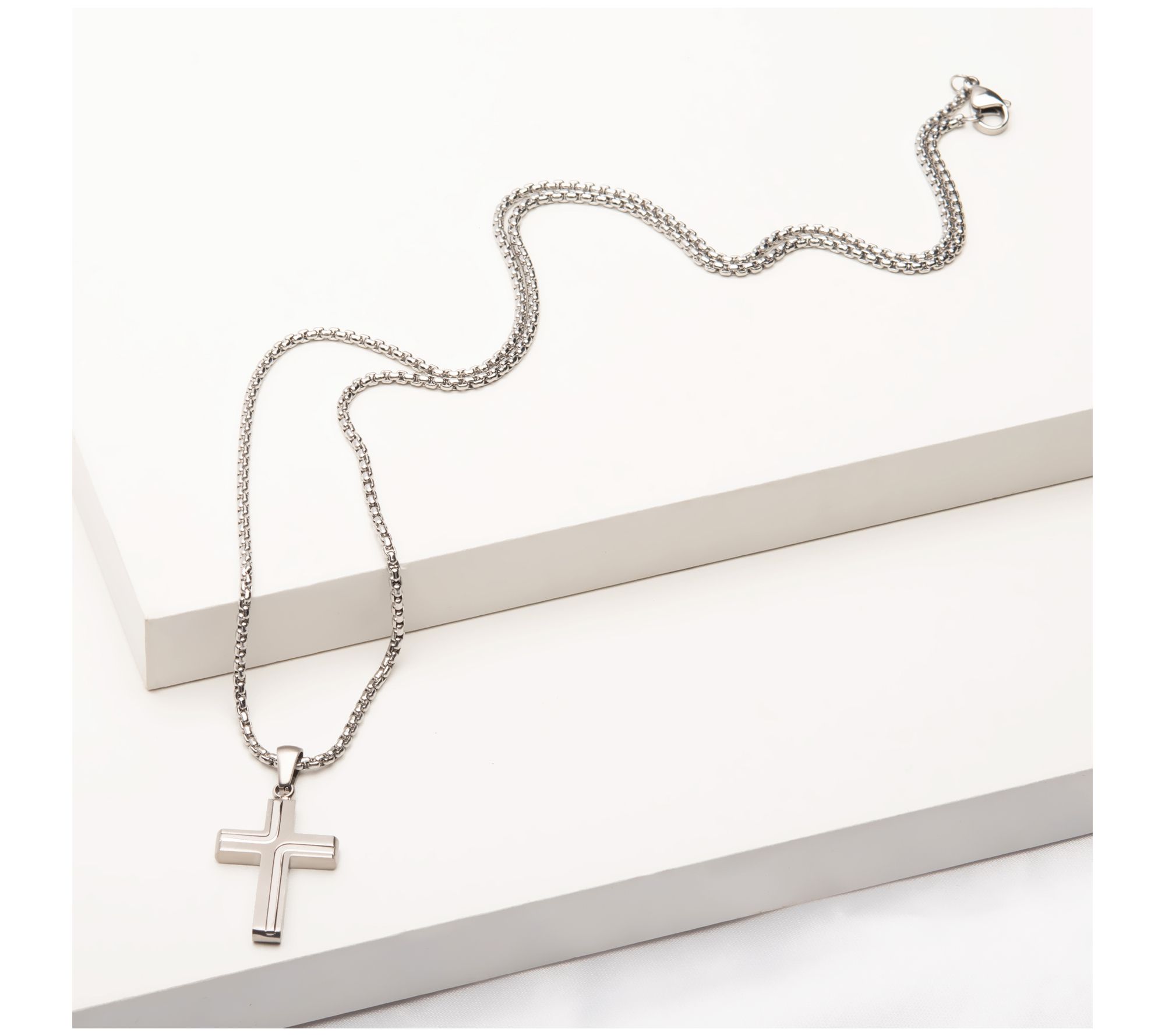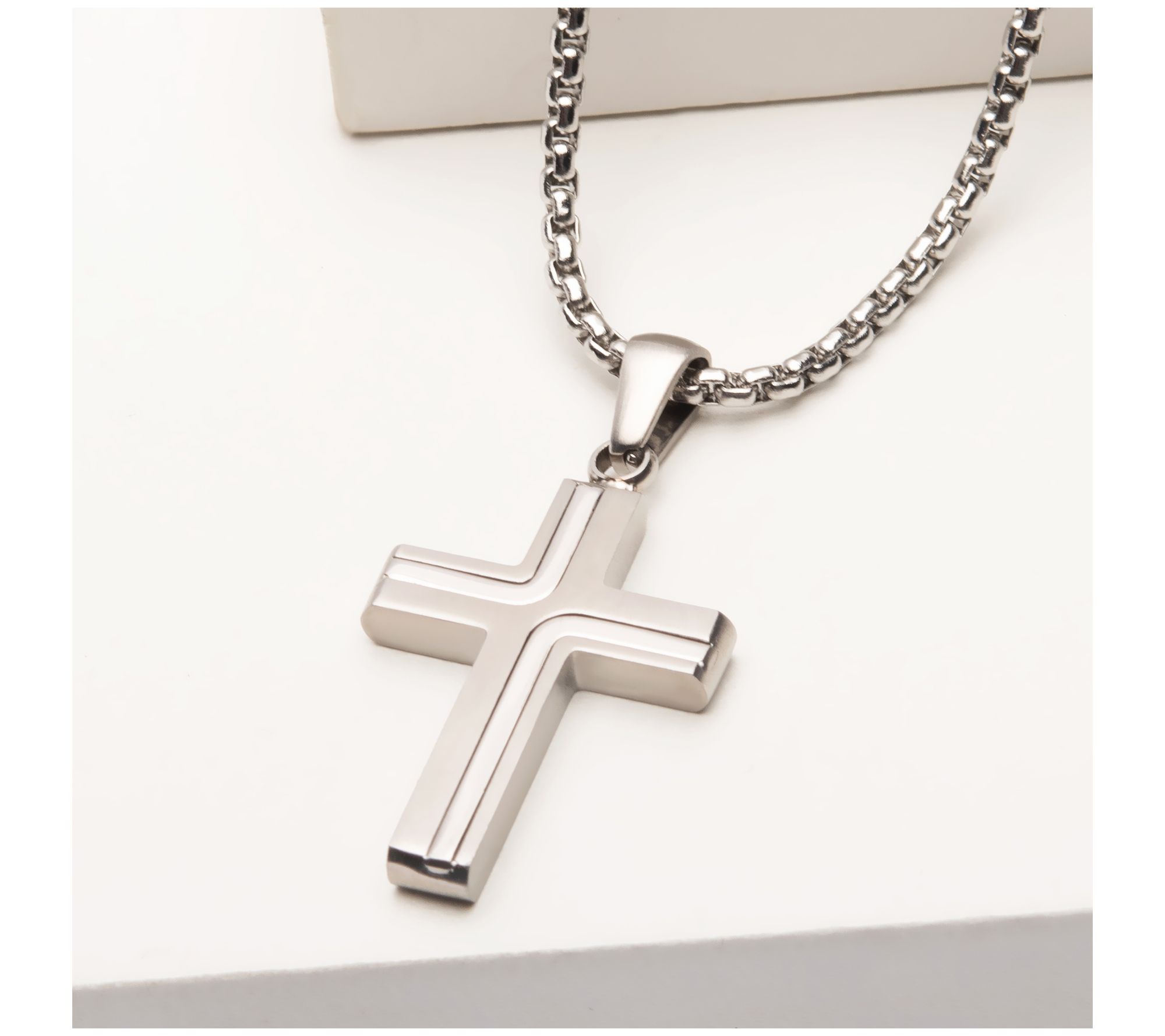 Show off your faith with this masculine stainless steel cross pendant and sturdy box chain. From Verve Men's Jewelry.