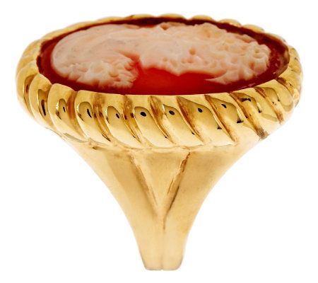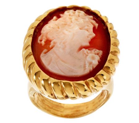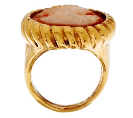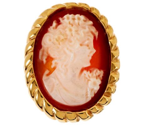 • Oval-shaped, carved shell cameo profile; rope-style border; ribbed, tapered shank; highly polished