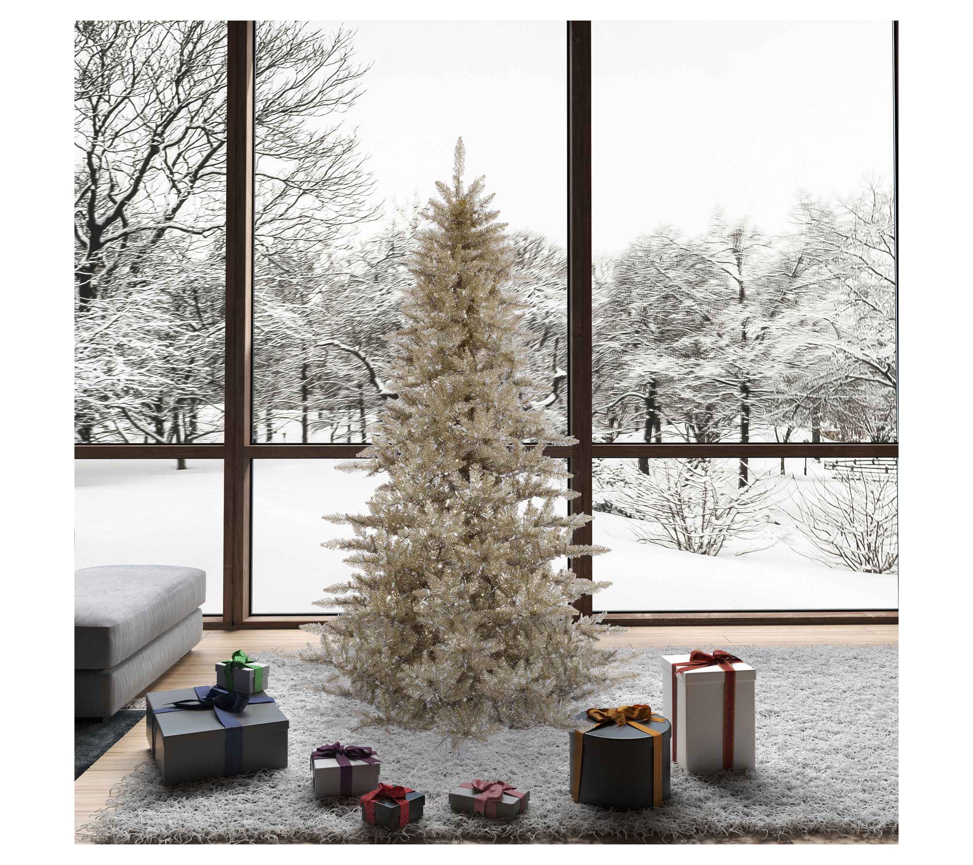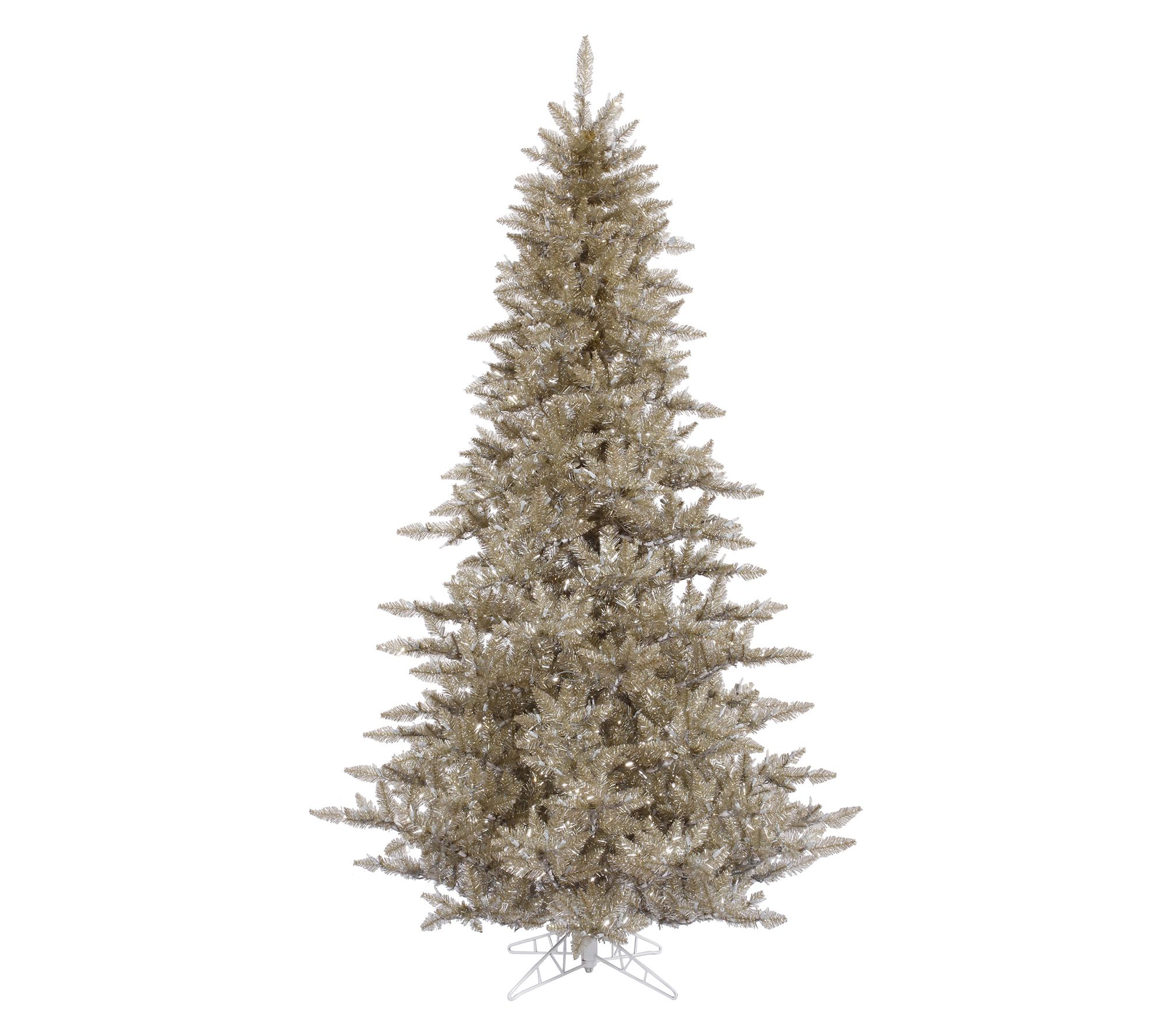 Celebrate the joy of the season by making this faux champagne fir the centerpiece of your holiday display. Its shimmering branches bring a modern twist, inviting moments of wonder as you gather with loved ones all season long. With sturdy hinged branches and a robust metal stand, decorating becomes an enjoyable, effortless part of your traditions. From Vickerman.
