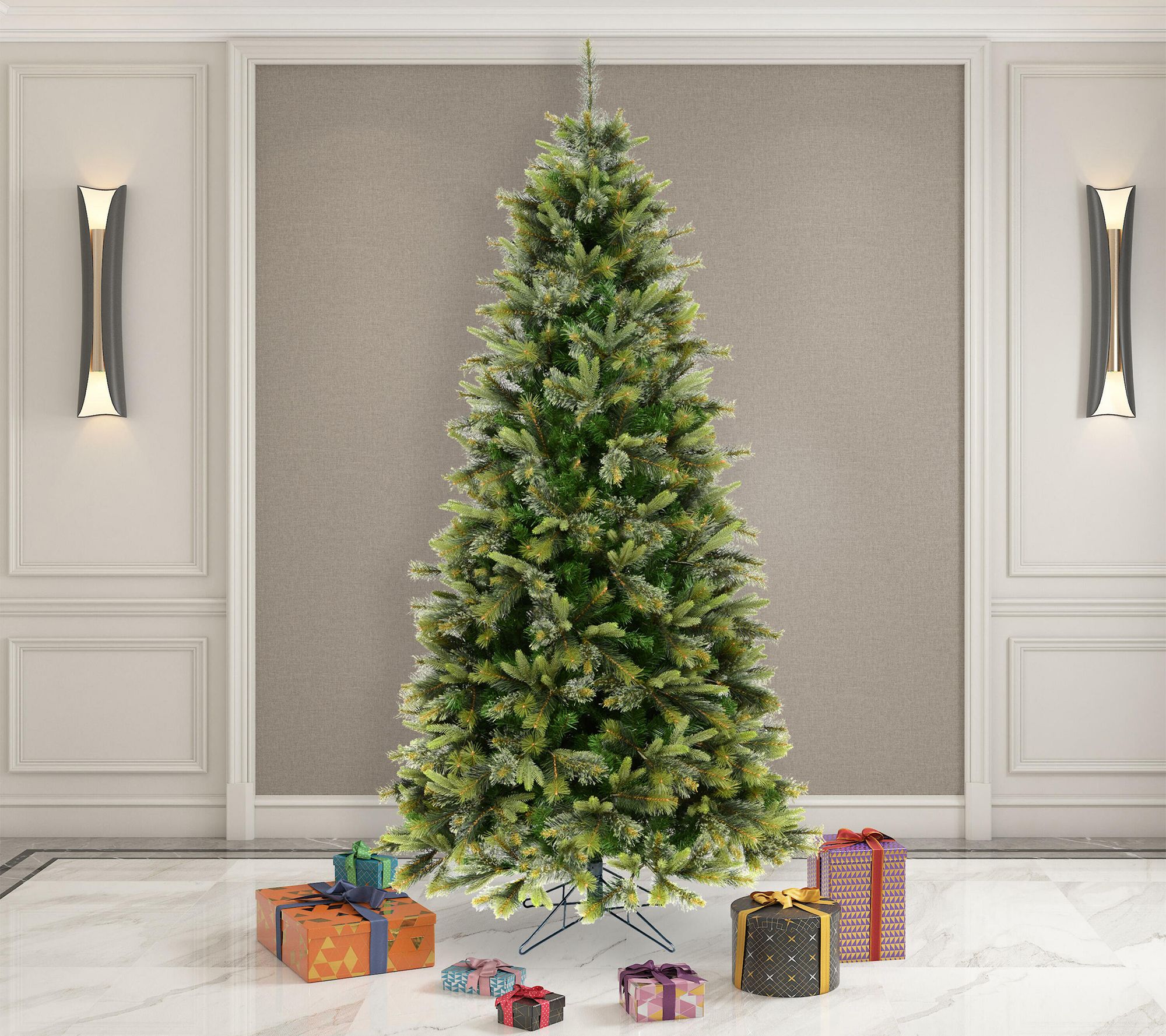Enjoy relaxed holiday decorating with a slim profile faux tree that fits easily into any room, setting the stage for cozy gatherings and joyful celebrations. Hinged branches with a lush blend of PE, PVC, and hardneedle tips create a full look without lights -- letting you personalize your tree year after year. From Vickerman.