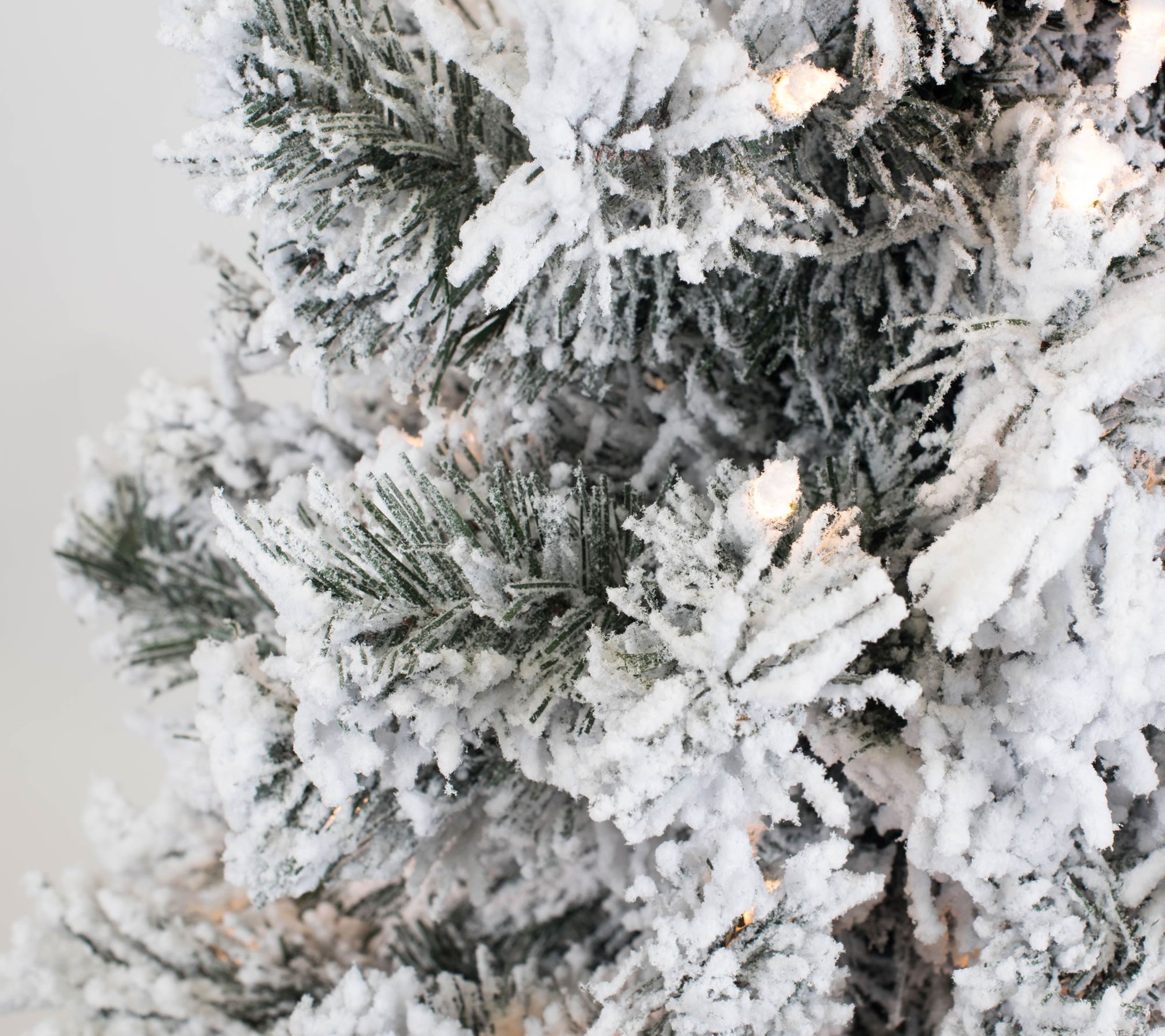 This pre-lit flocked Alaskan Christmas tree brings a winter wonderland into your home. With 127 flocked tips and 100 clear Dura-Lit lights, the 36"H tree helps deliver a festive glow to smaller spaces. From Vickerman.