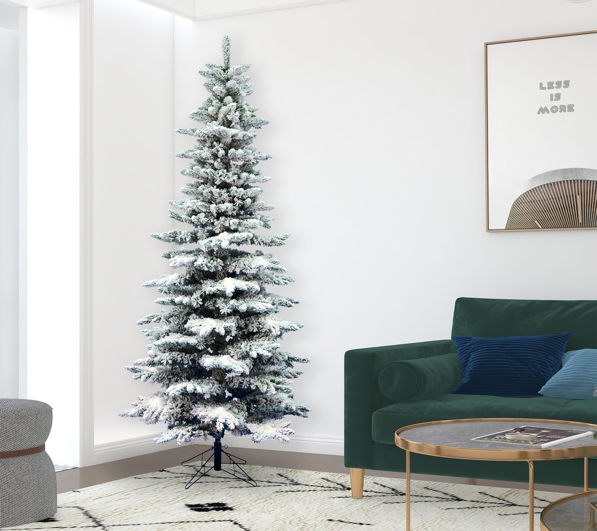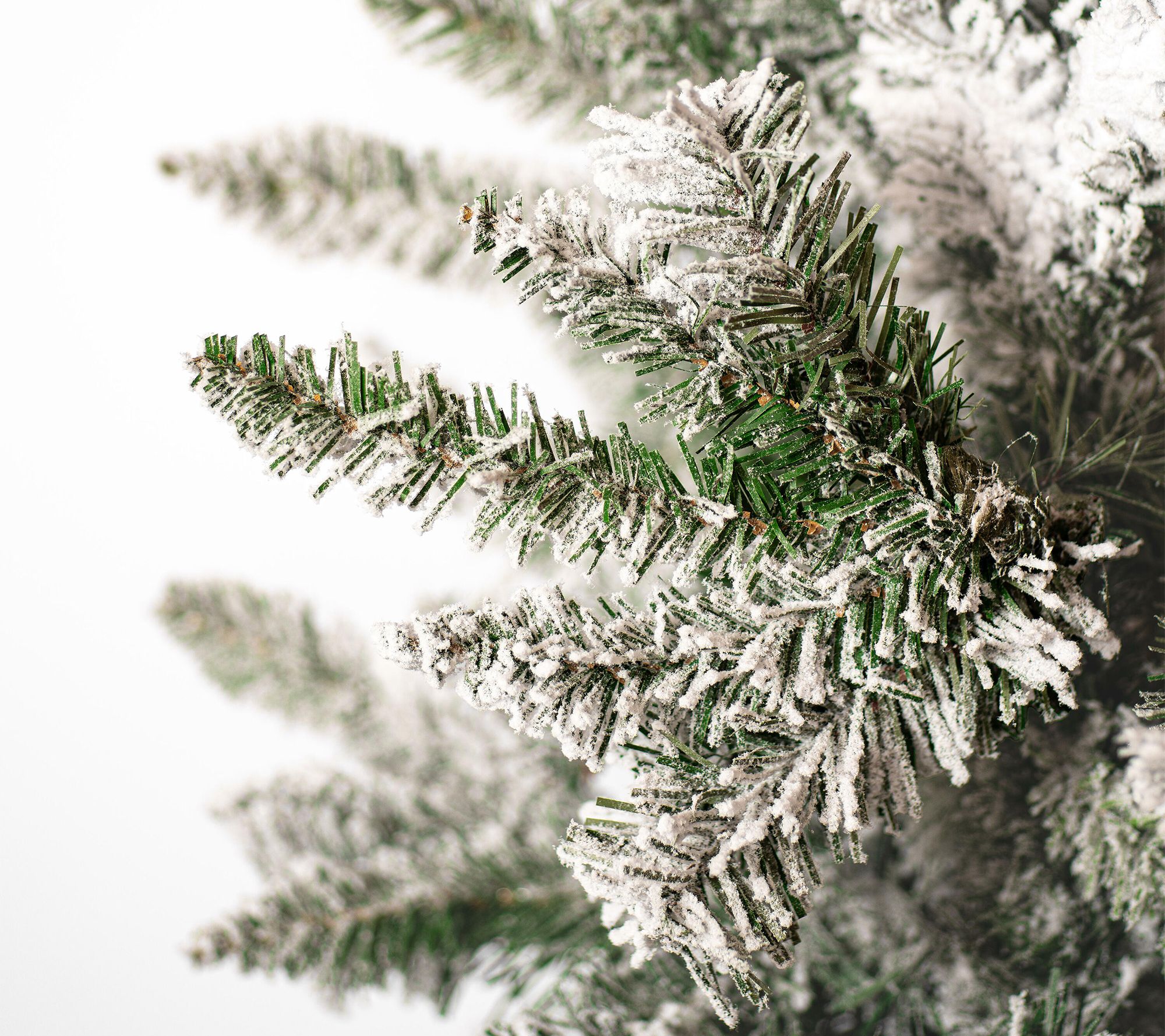 Holiday decorating takes on an enchanting look as this flocked faux fir stands tall, creating a snowy retreat right in your living room. Gather family and friends around its full, frosted branches to share stories, hang ornaments, and build seasonal memories. From Vickerman.