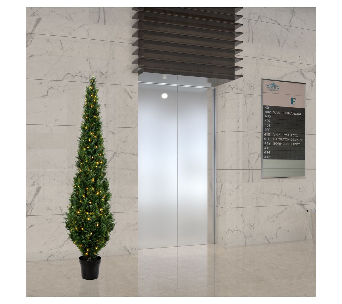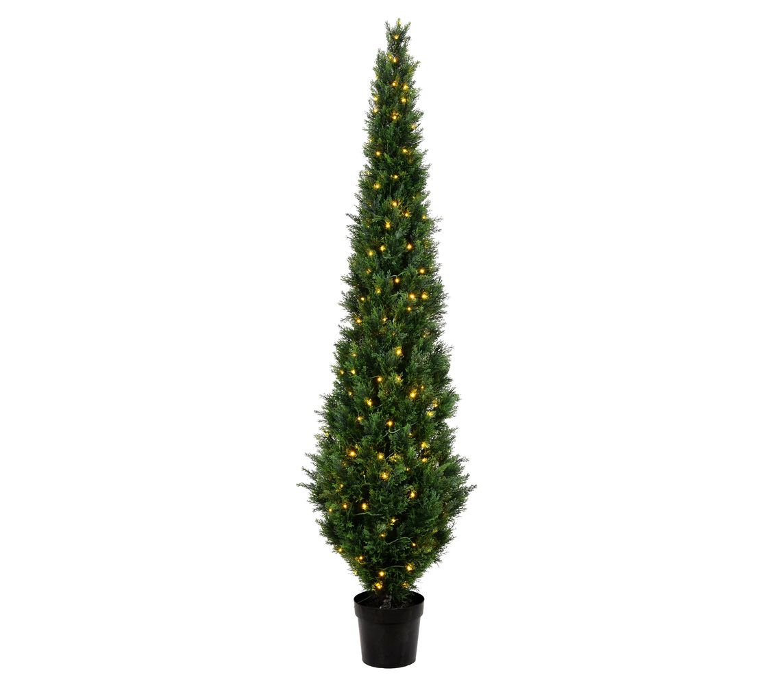 Brighten up an entryway or add instant elegance to a home office when you have this faux cedar tree that features lush green foliage accented by a warm, welcoming glow. From Vickerman.