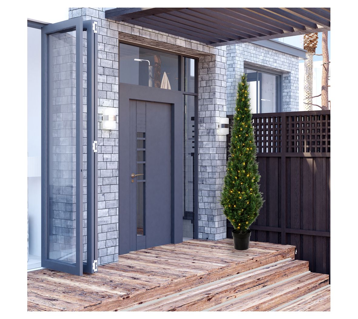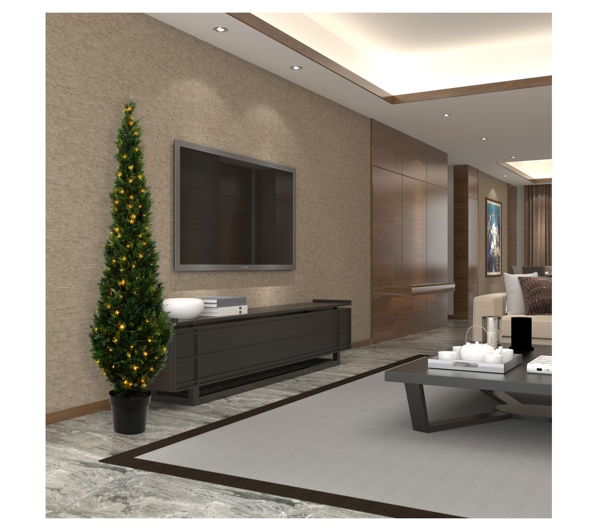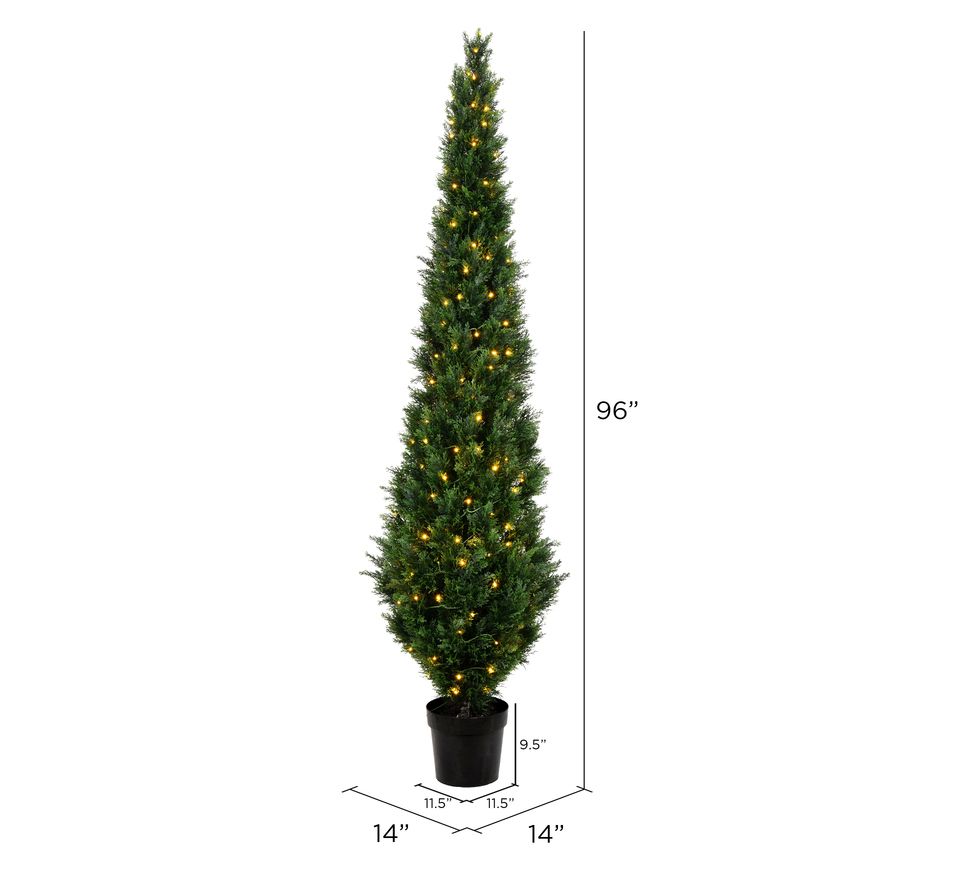 • Includes potted faux cedar tree with warm white LED lights