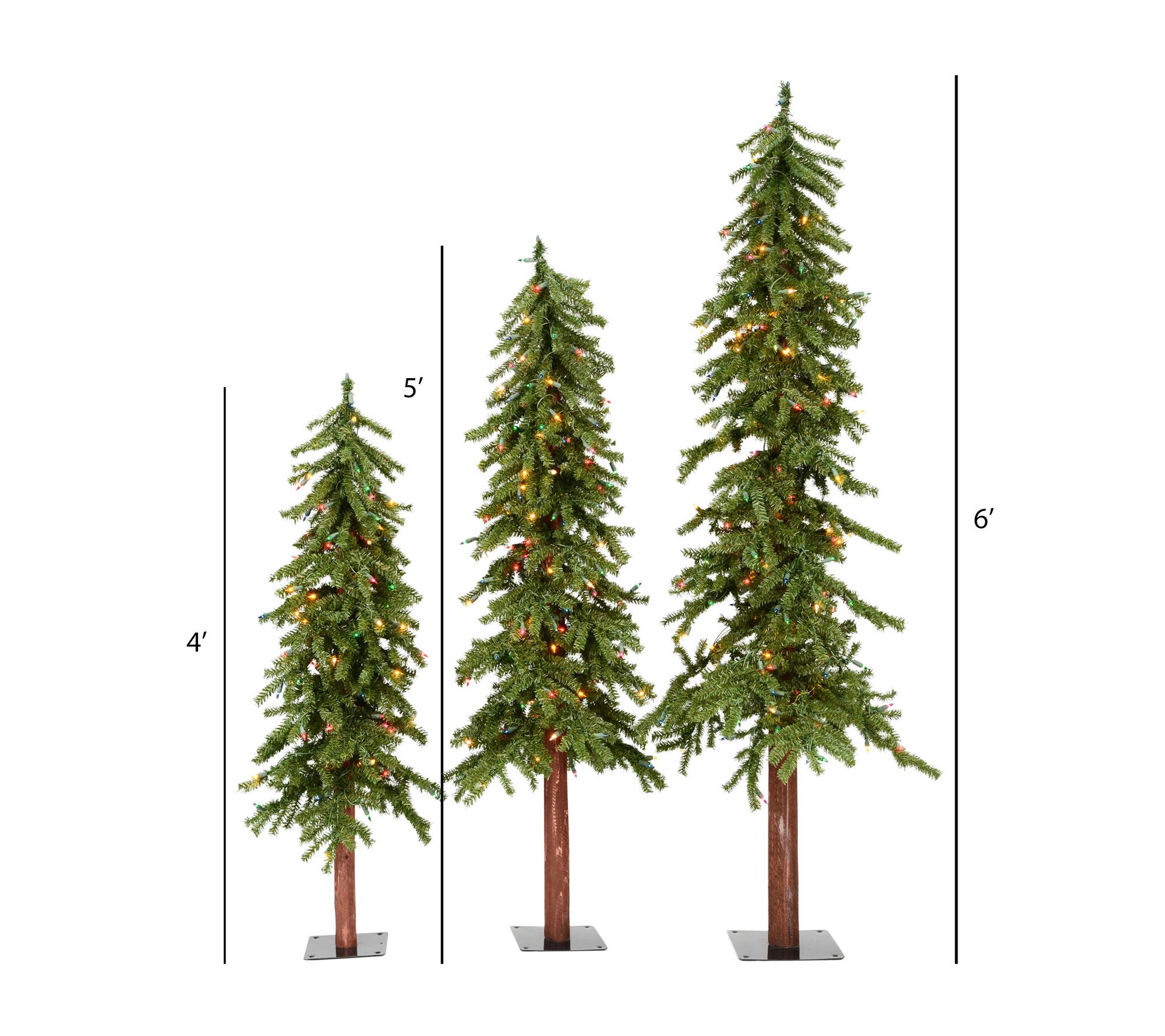 Bring a rustic, lighted look to your holiday space or year-round decor with these three pre-lit, natural bark artificial Alpine Christmas trees that vary from 4 ft to 6 ft tall. From Vickerman.