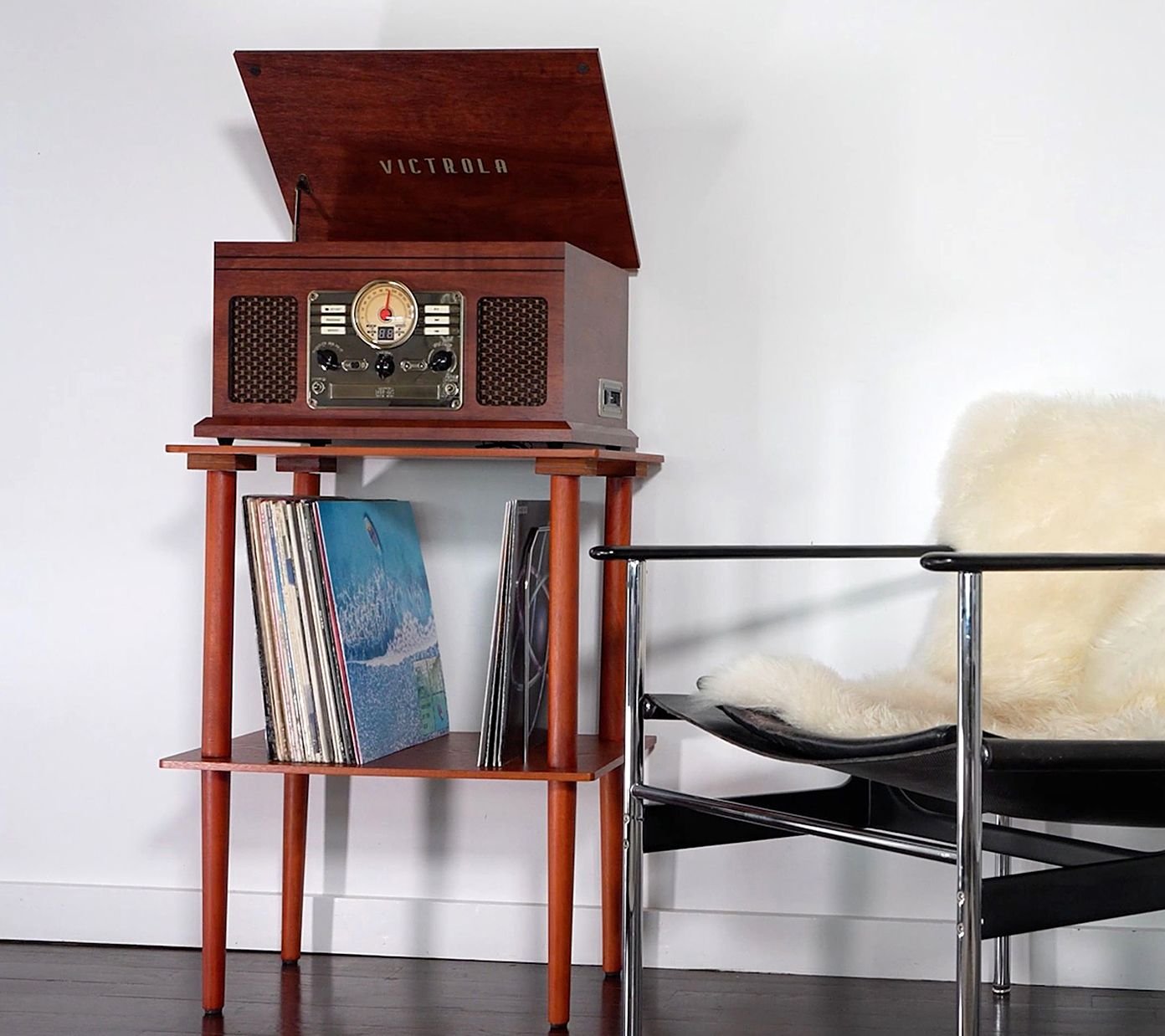 Keep all your favorite records in one easily accessible place with this wooden stand. From Victrola.