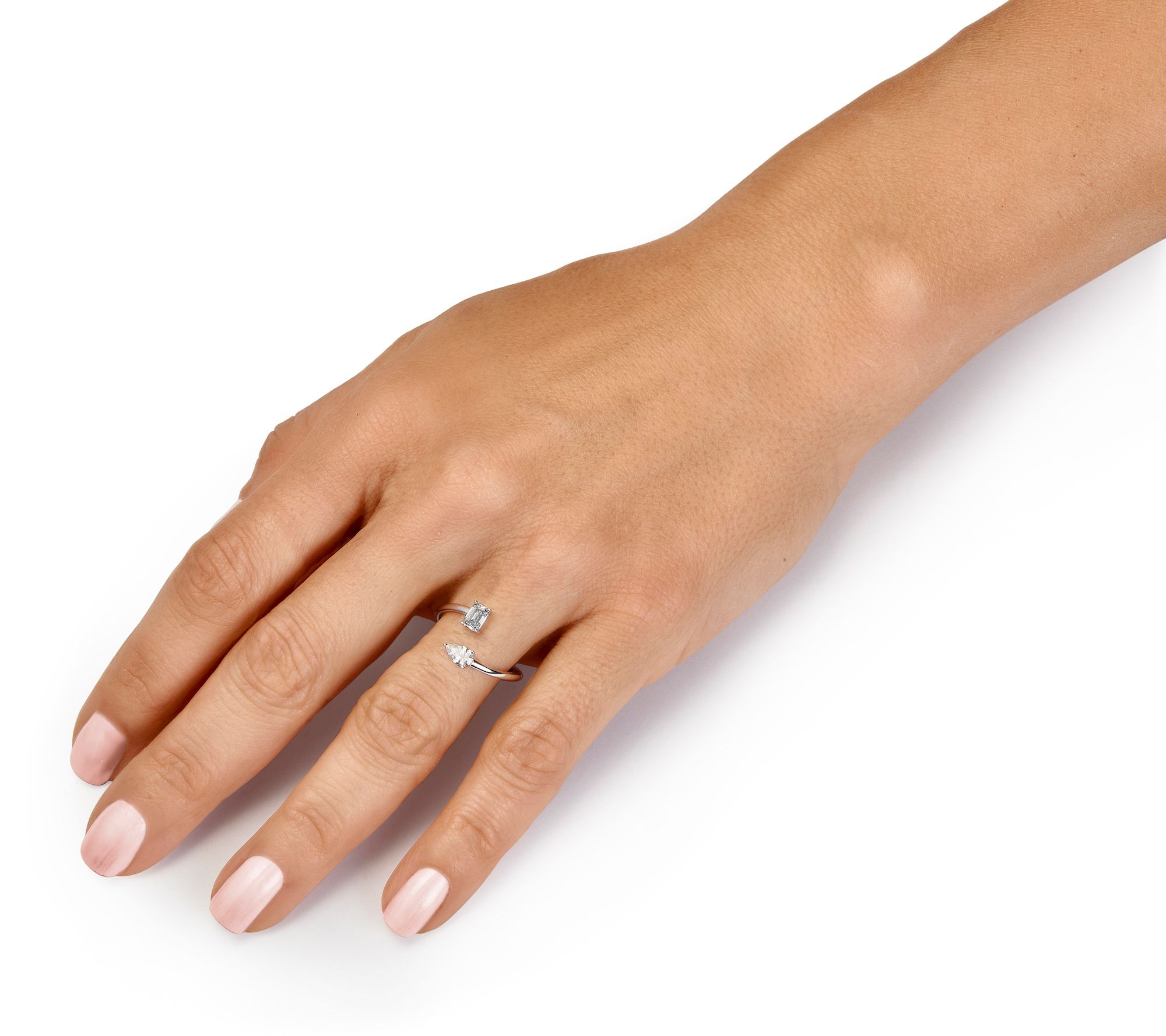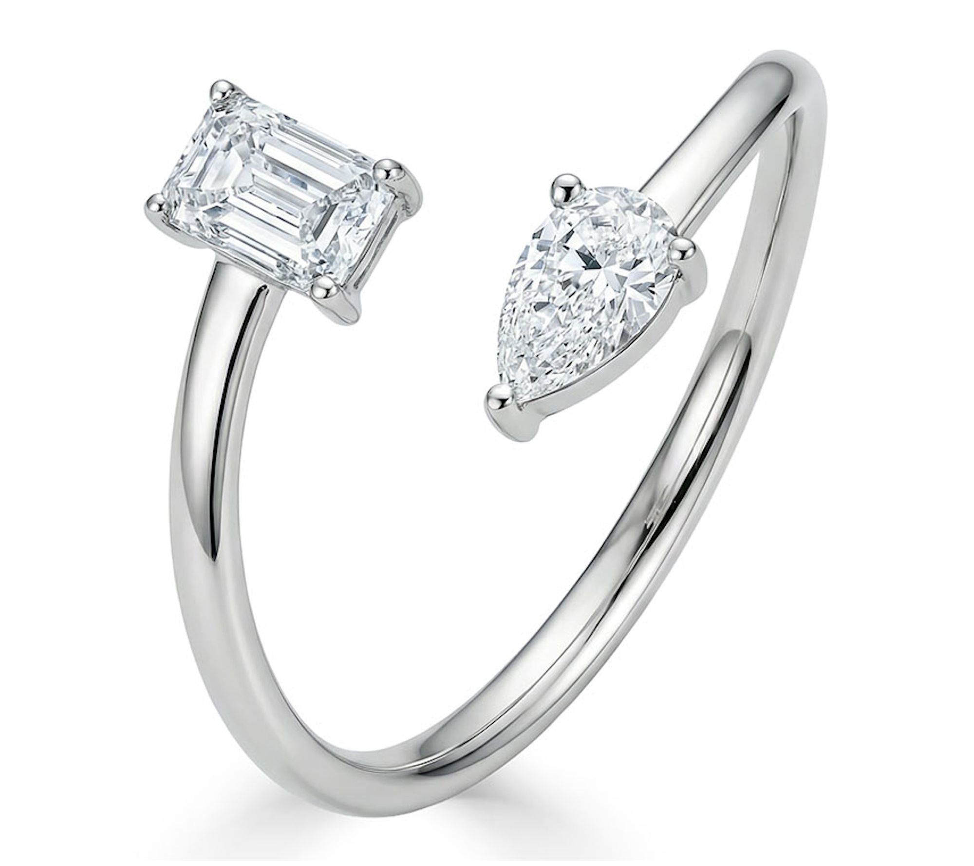 • Open-wrap prong setting; pear- and emerald-cut lab-grown diamonds; modern open silhouette