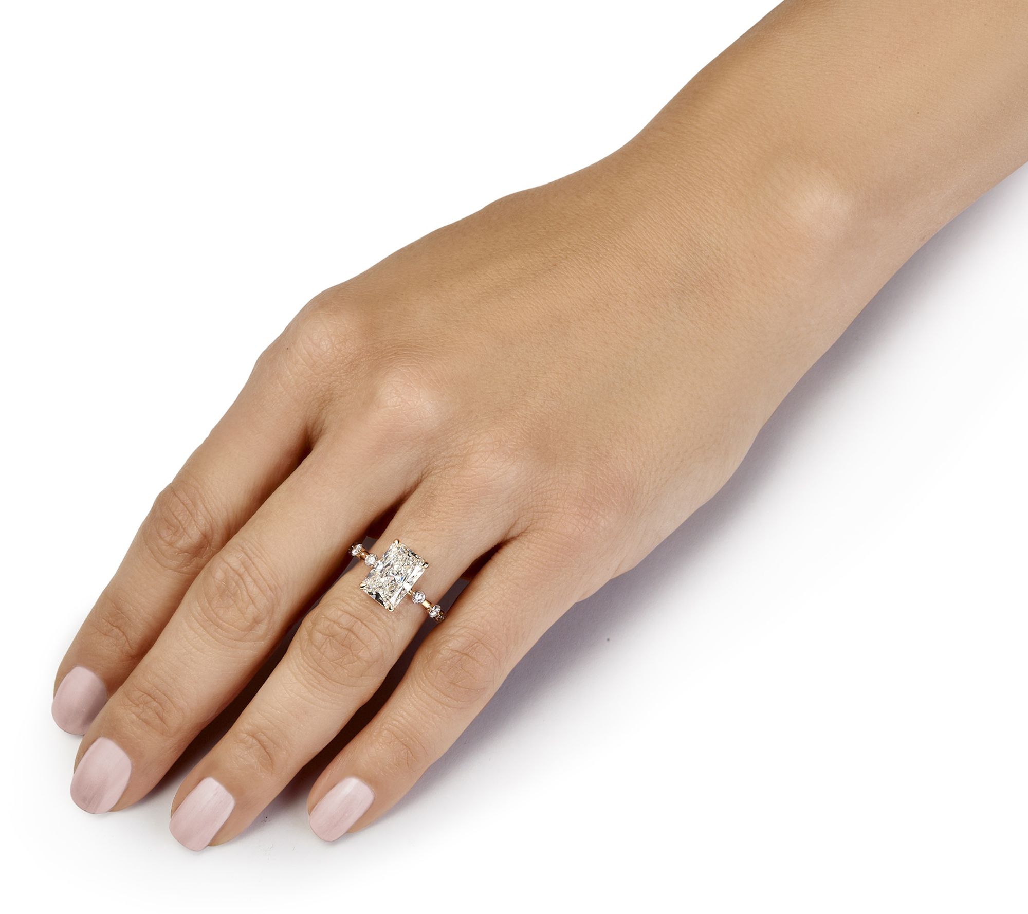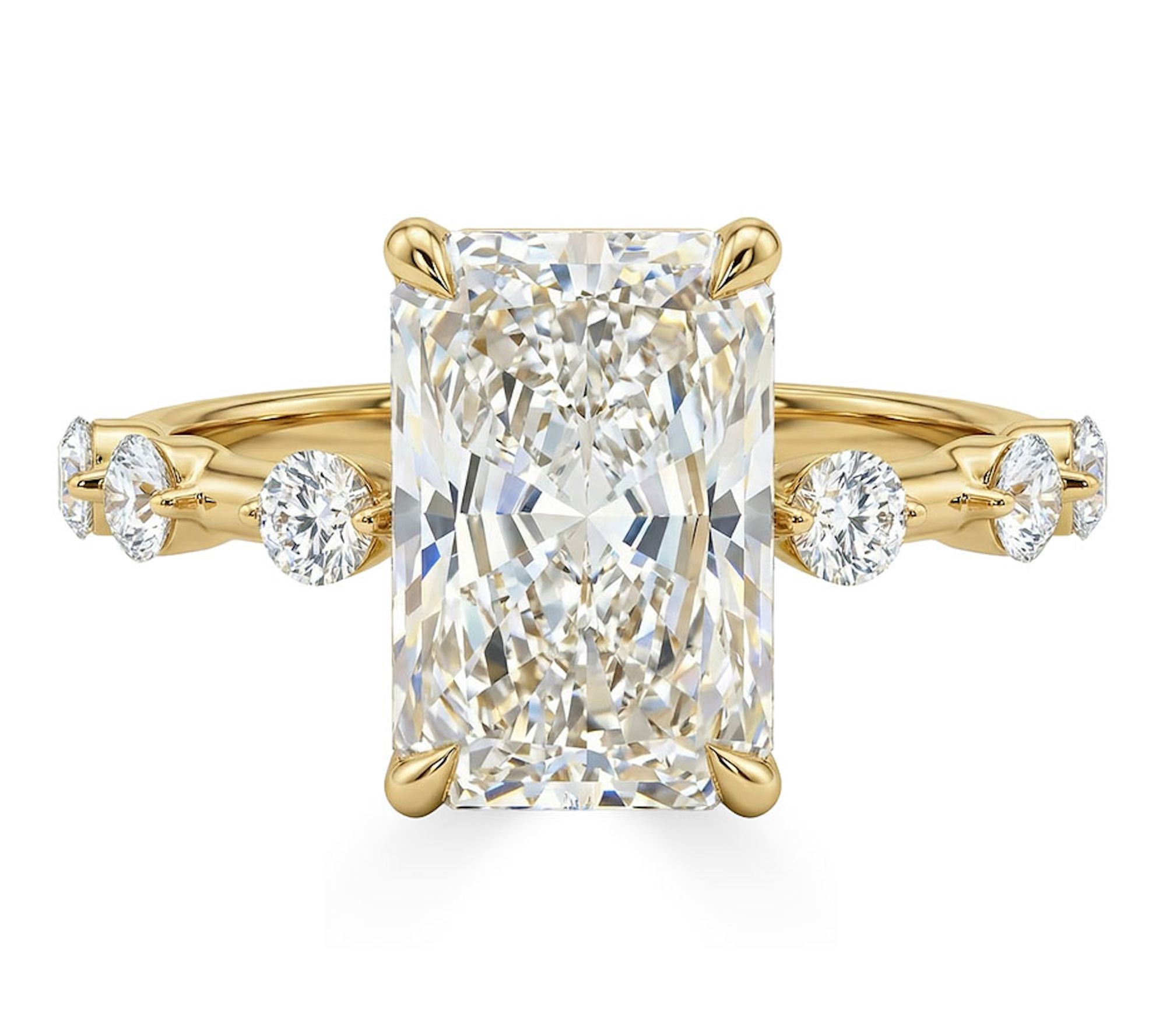 Radiant-cut lab-grown diamond center; round lab-grown diamonds on shank; highly polished band