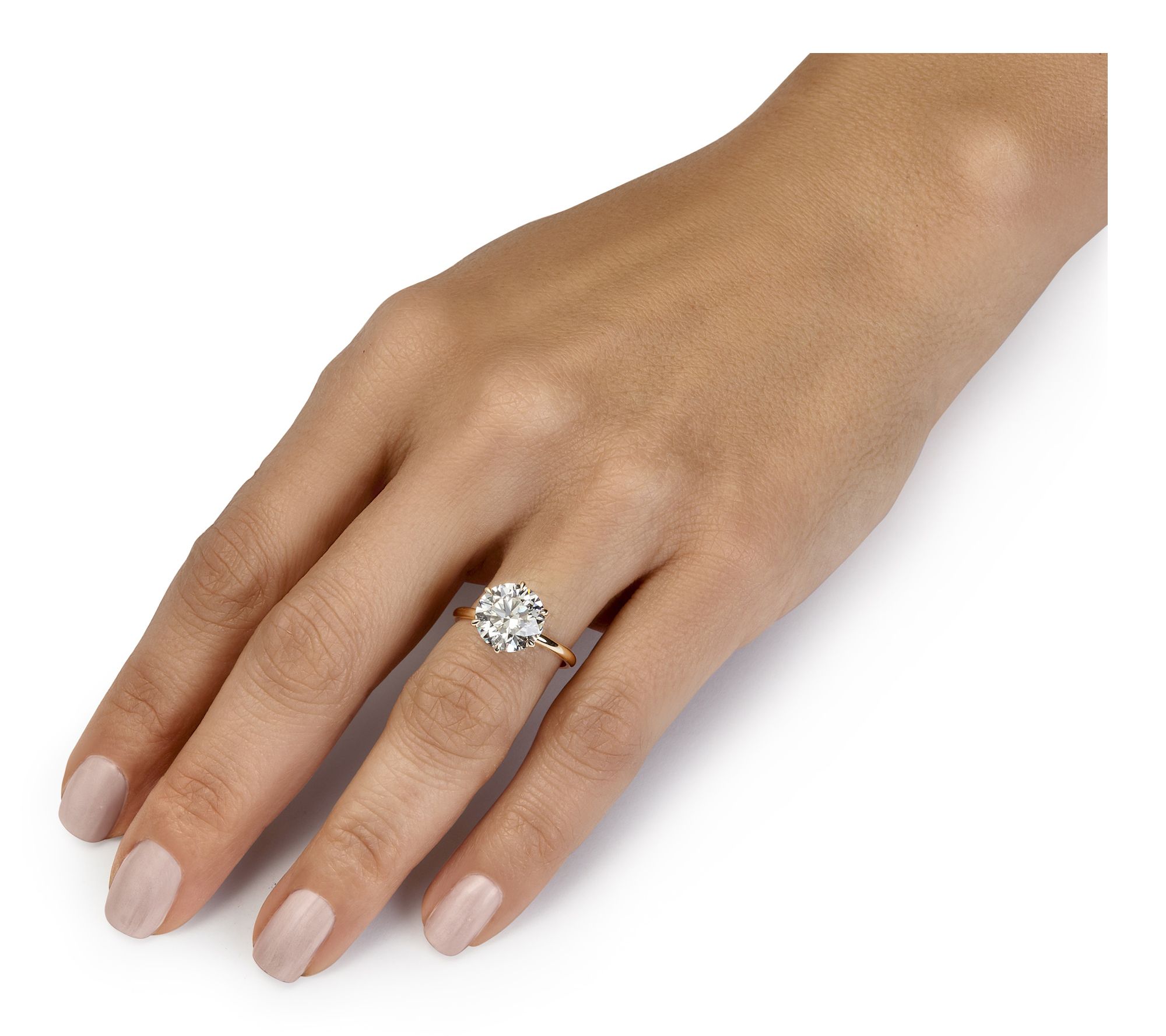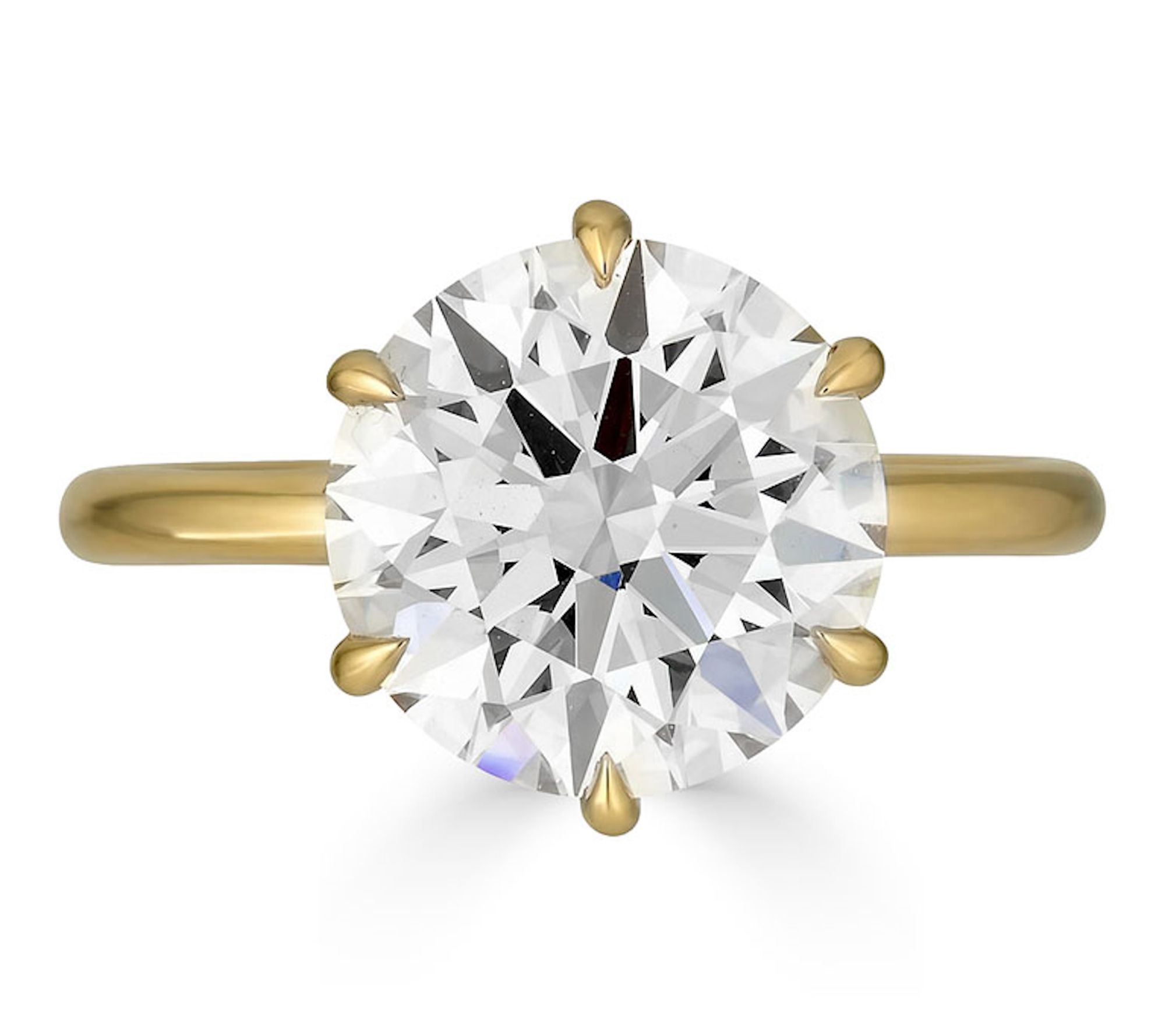Round-cut lab-grown diamond in a six-prong setting; solitaire design; polished finish