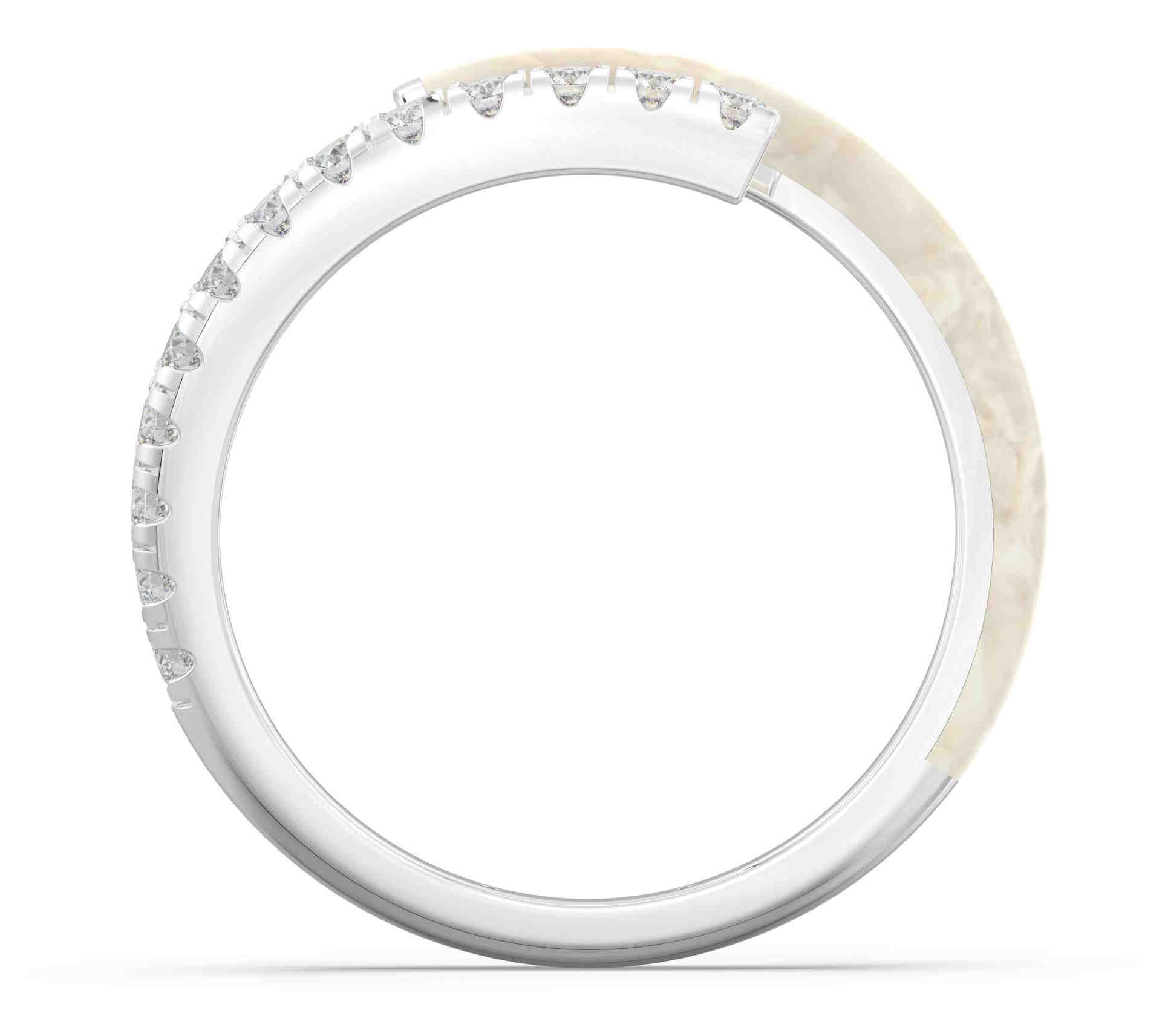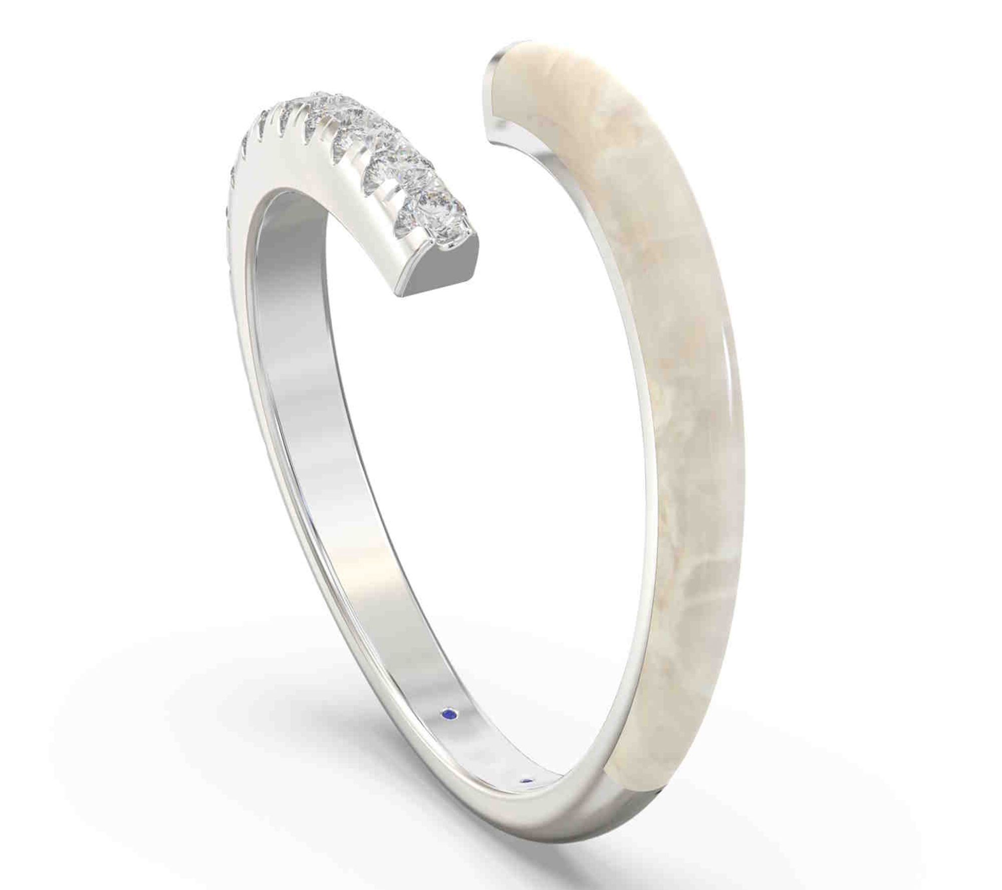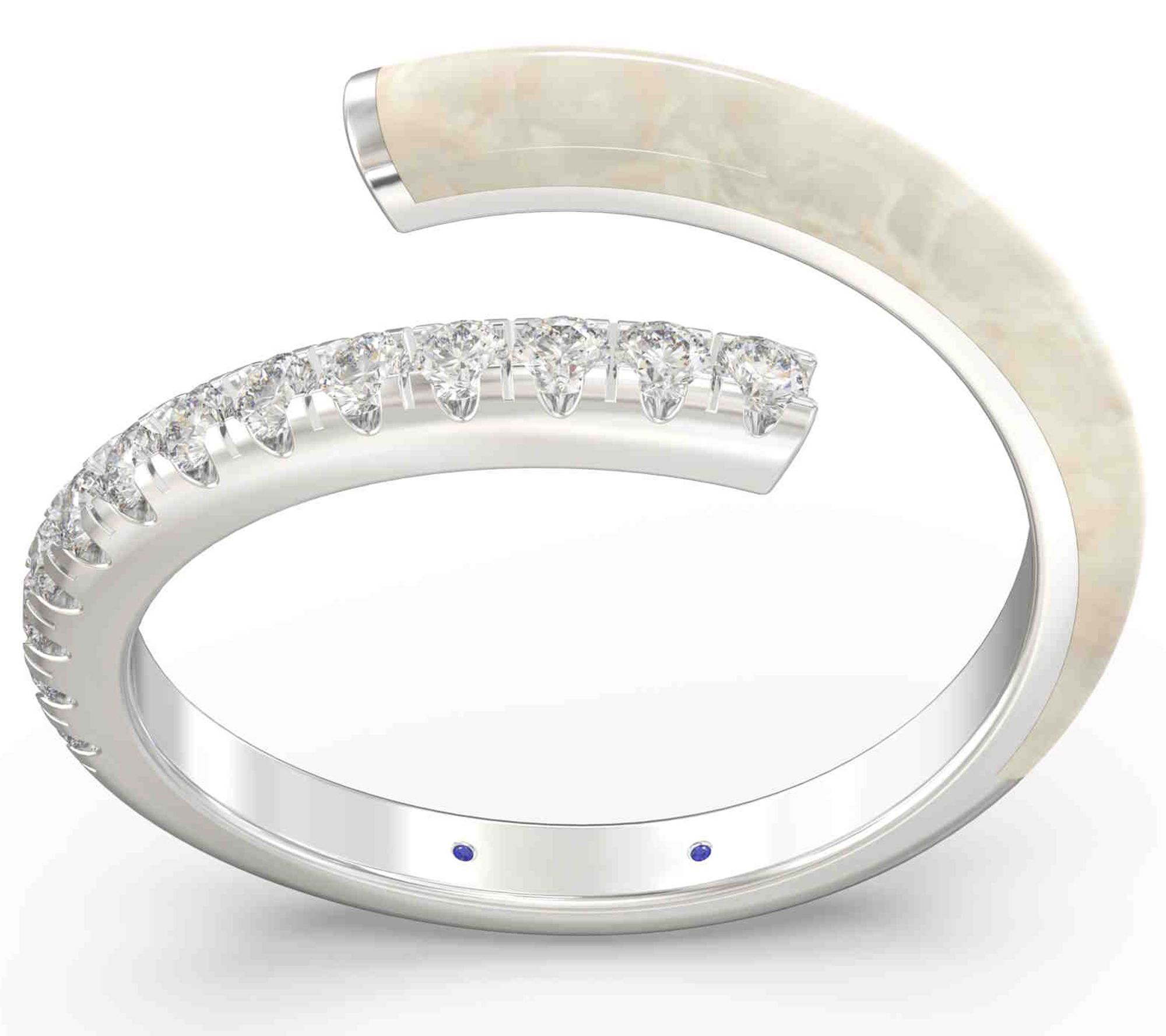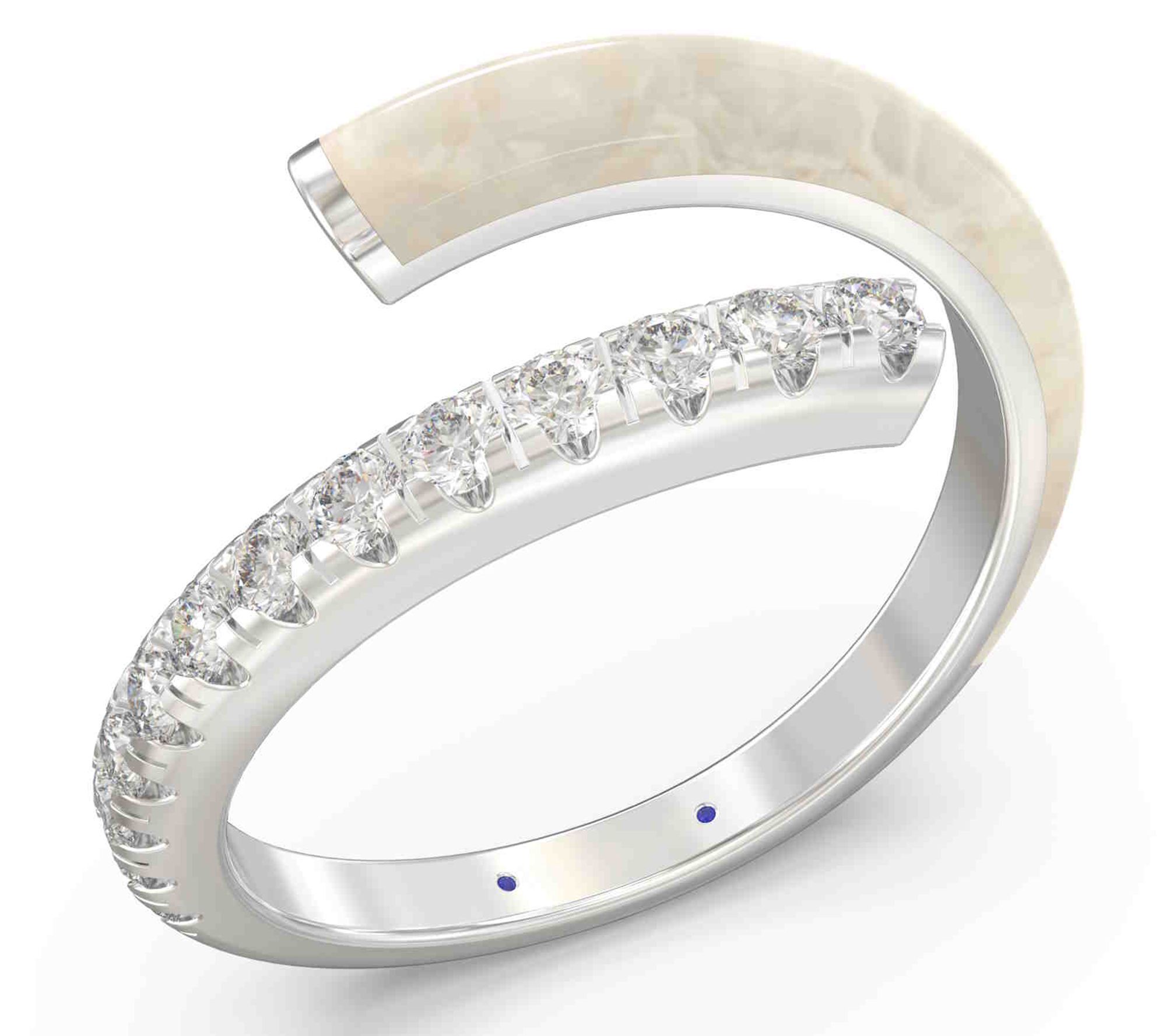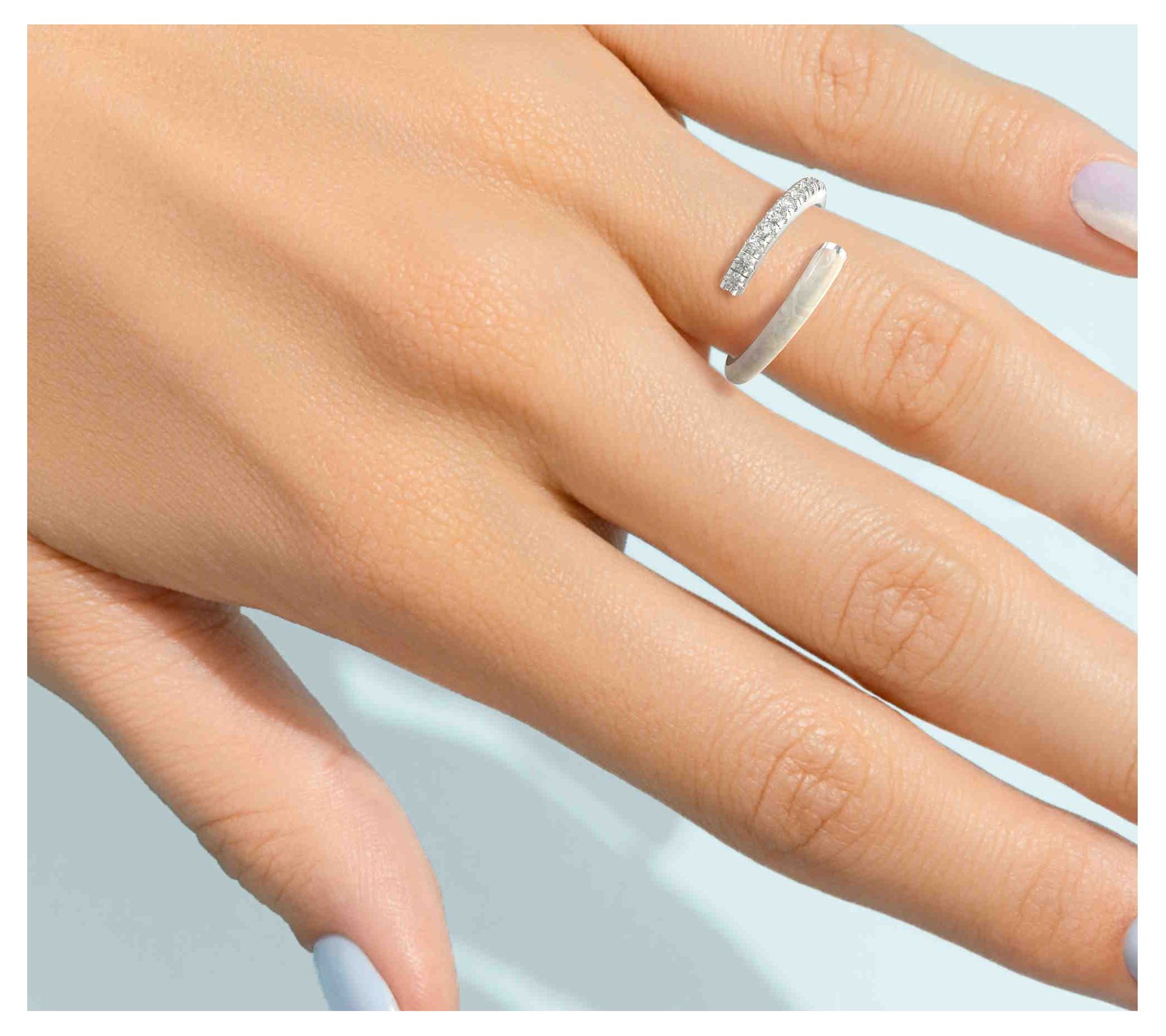 A captivating blend of modern elegance and timeless charm, this bypass band features a delicate light blue ceramic hue and showcases an open wrap design adorned with lab-grown diamonds. From Vida Lab Diamonds.