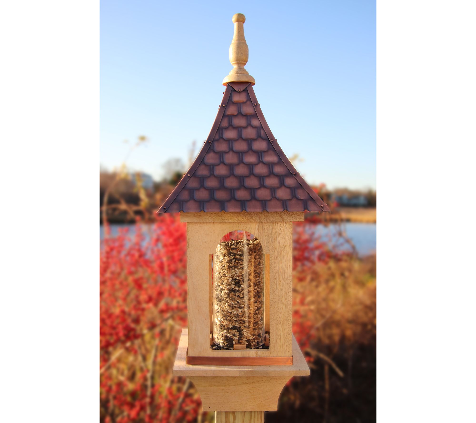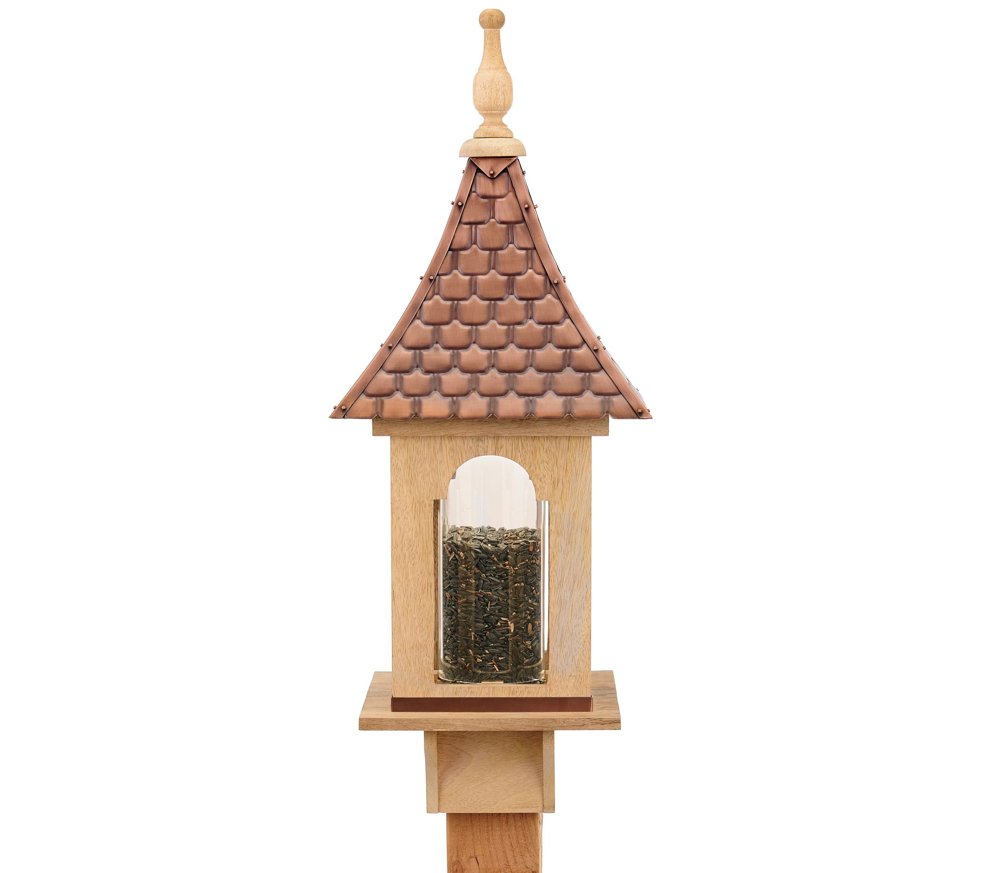Relax and enjoy the company of songbirds as they stop by for a snack at this feeder made of eco-friendly pure copper and mango wood. Each crafted feeder shows its own unique graining and color variations, making it a beautiful, elegant focal point for your garden and a welcoming buffet for your feathered friends. Post not included. From Good Directions.