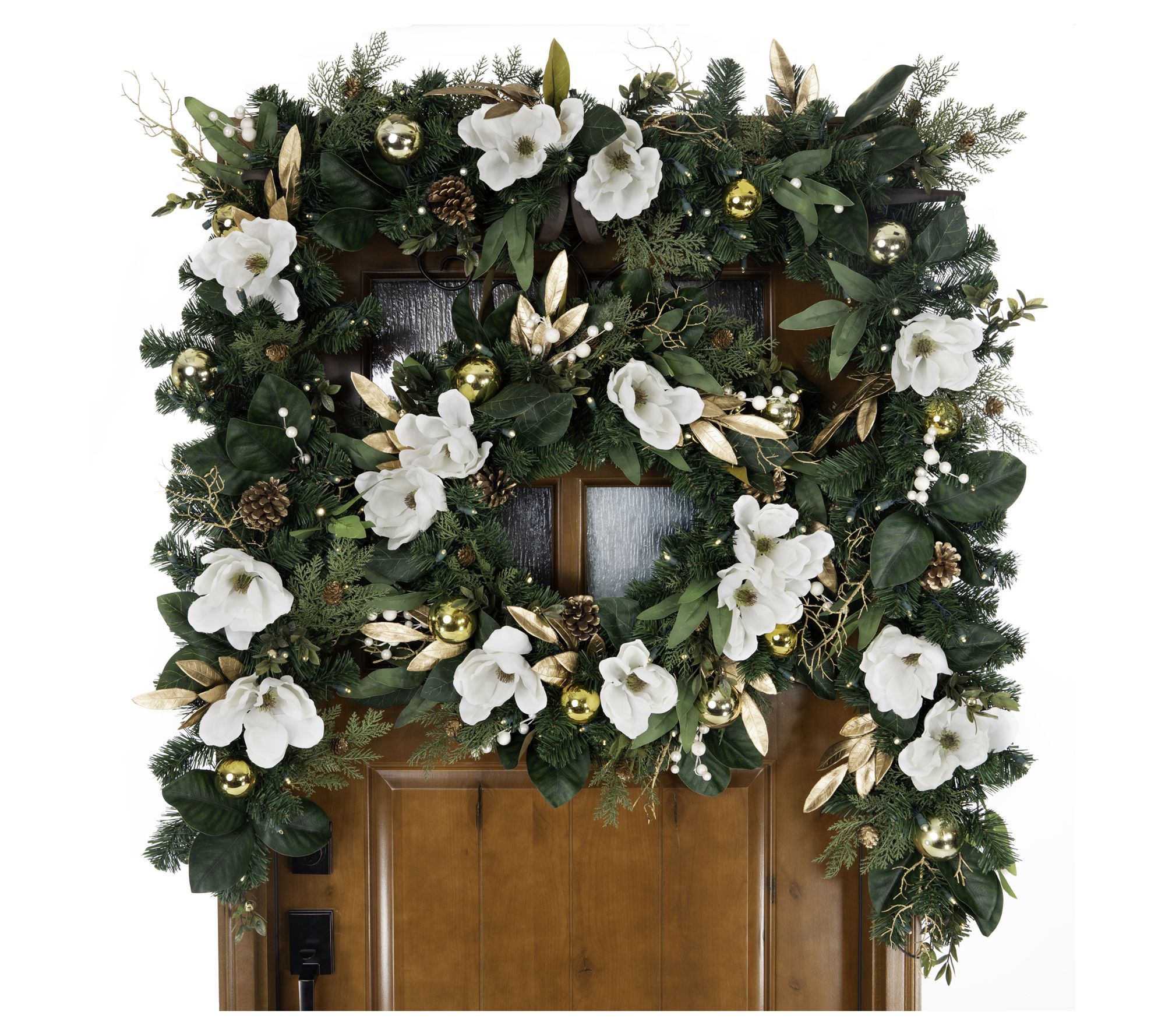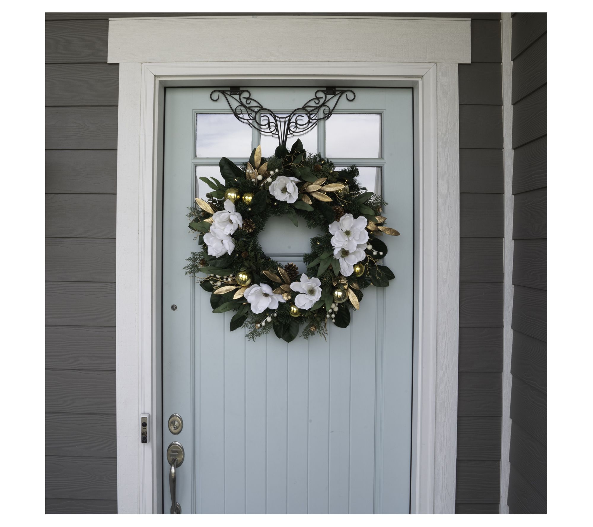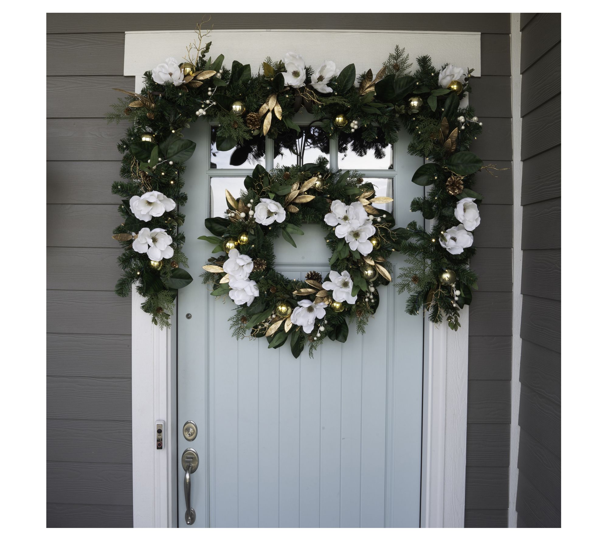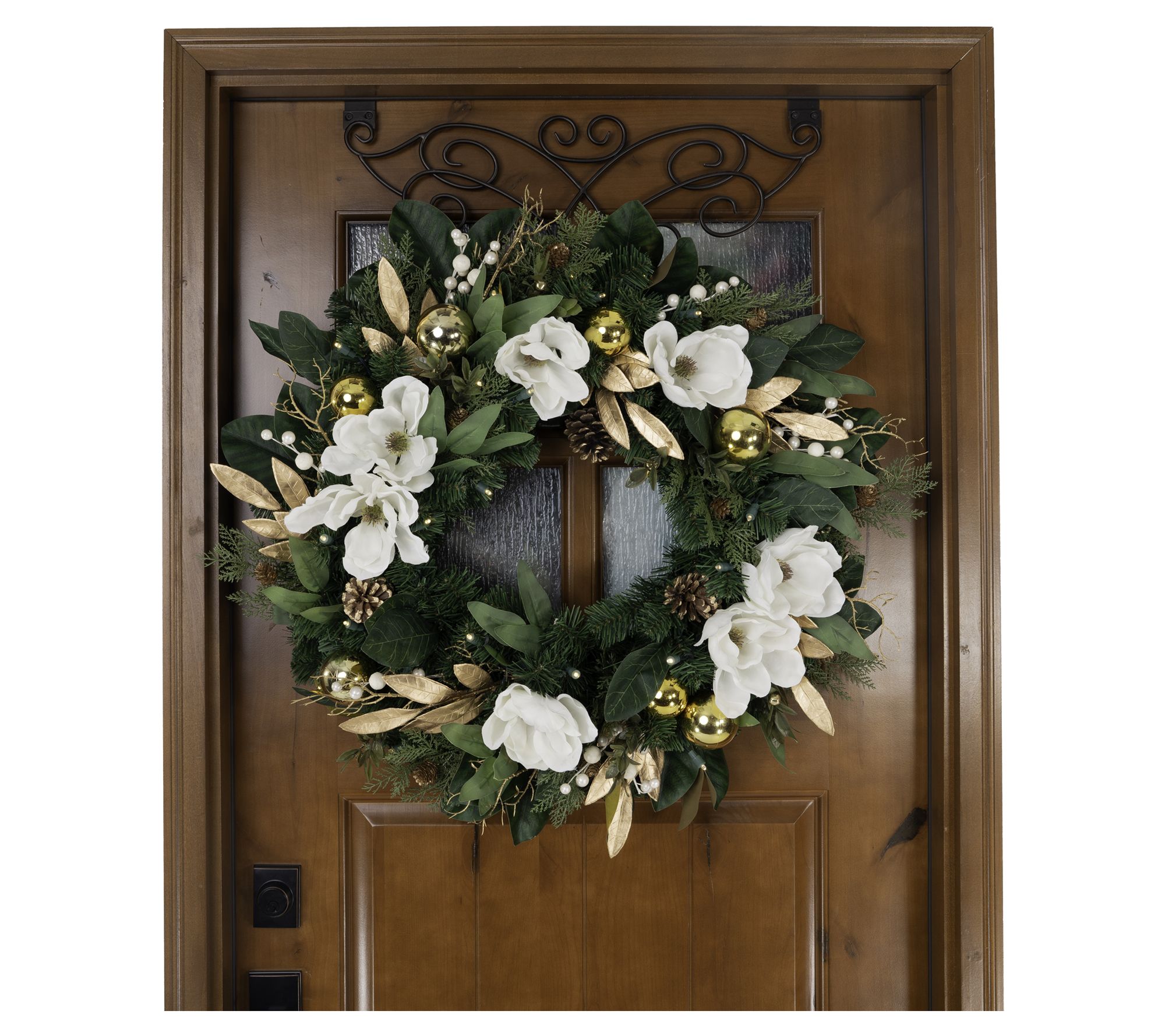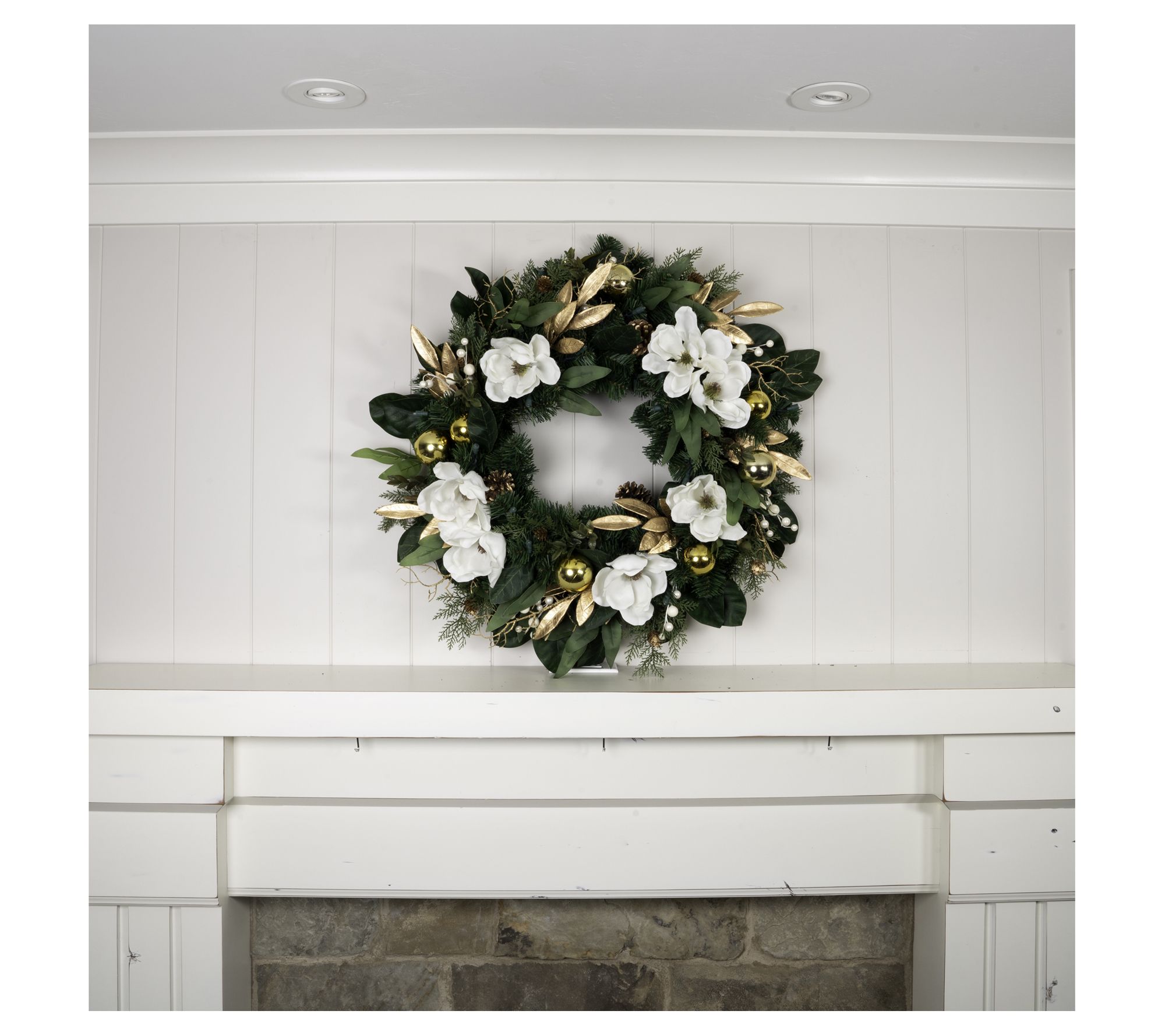 Make your home merry by hanging this beautiful white magnolia wreath designed with goldtone leaves and white blooms. From Village Lighting Company.
