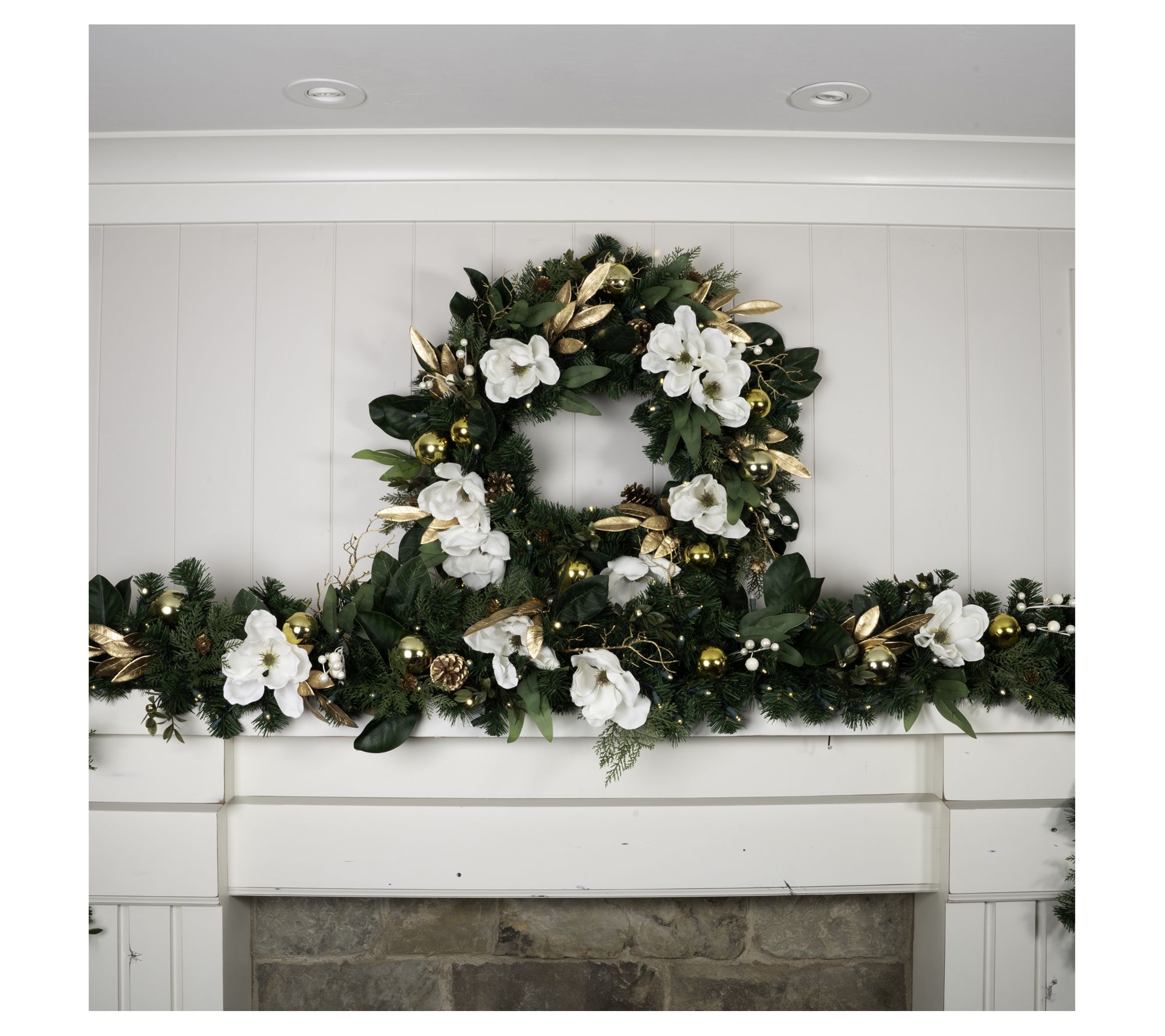 Village Lighting 30" Pre-Lit LED Wreath - White Gold Magnolia