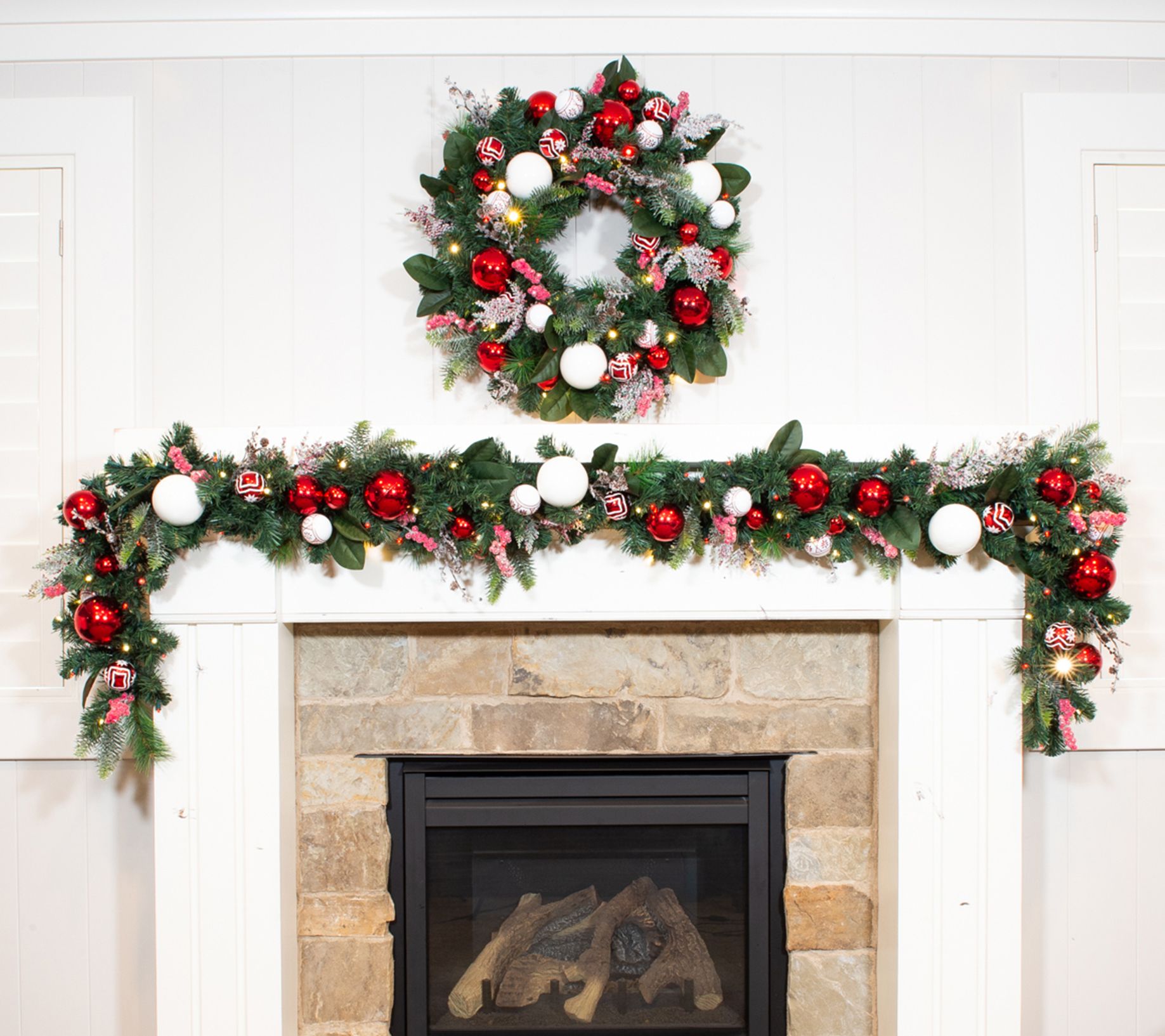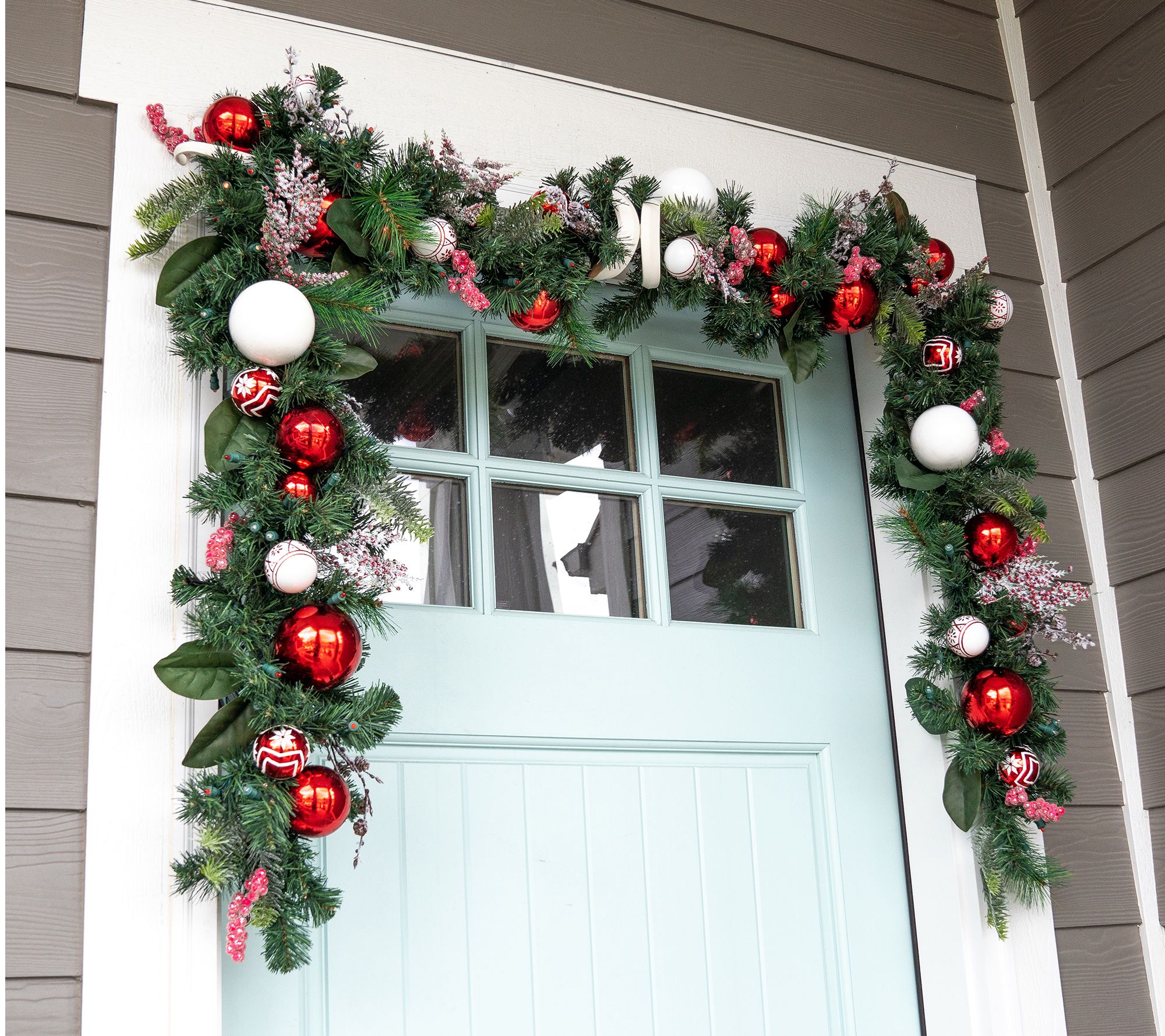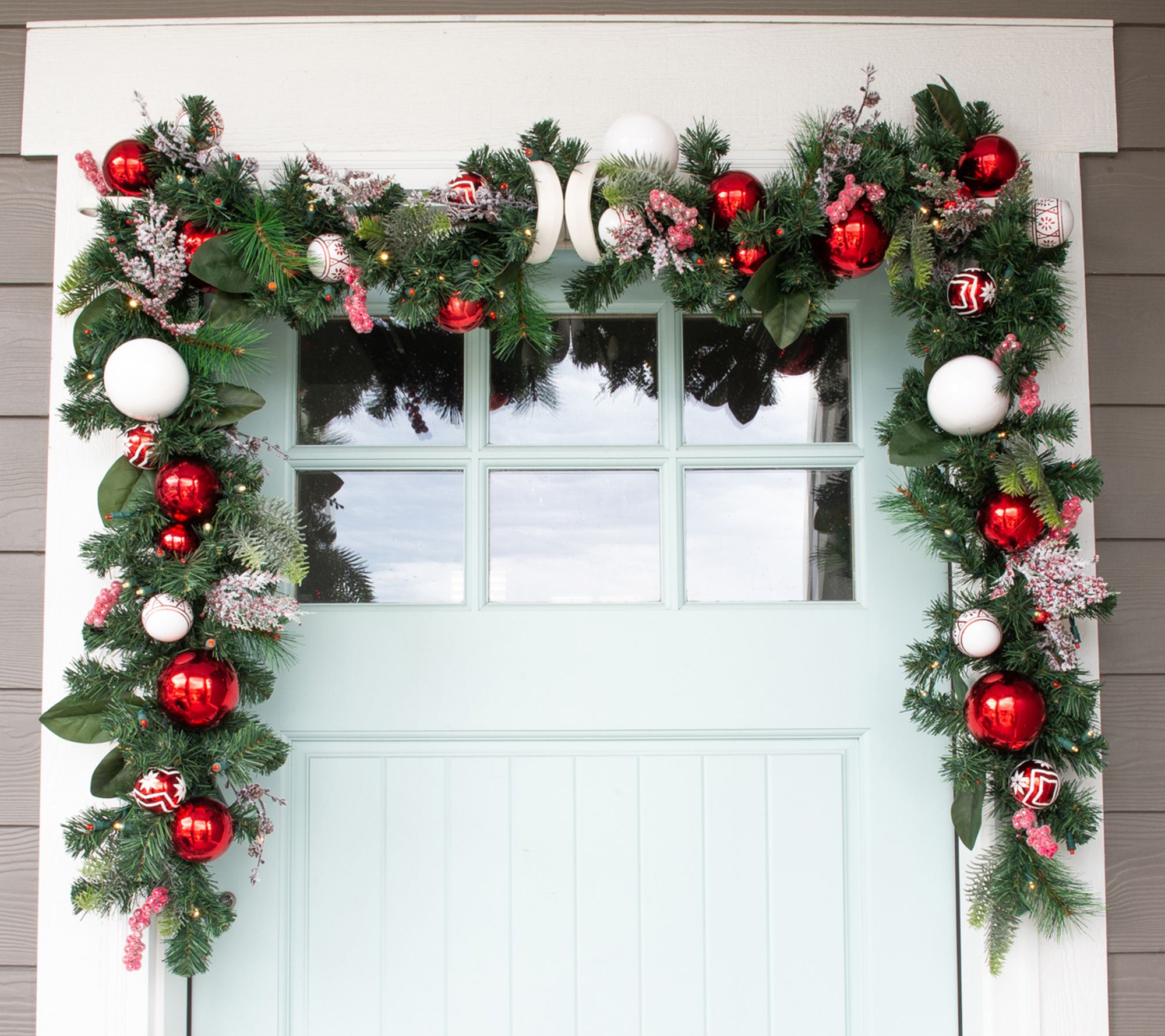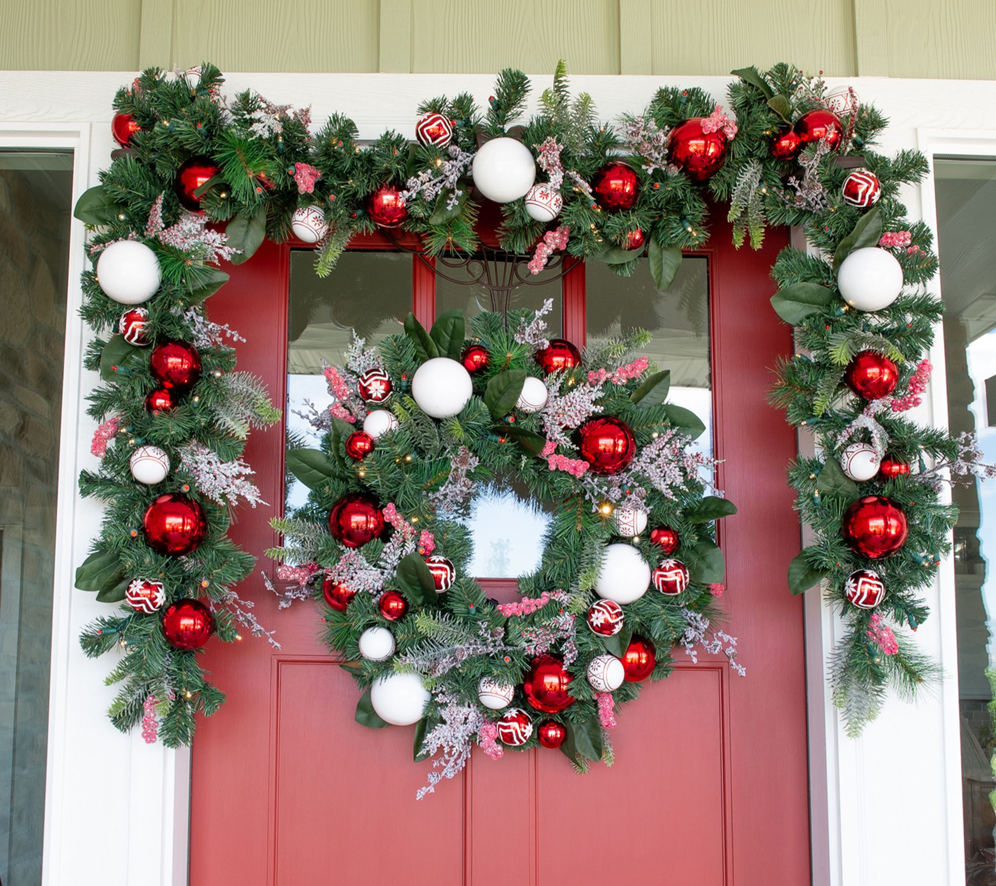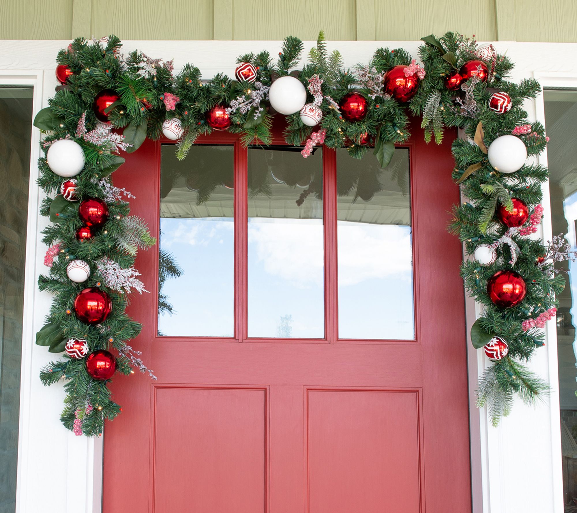 • Features red and white ornaments and realistic greenery