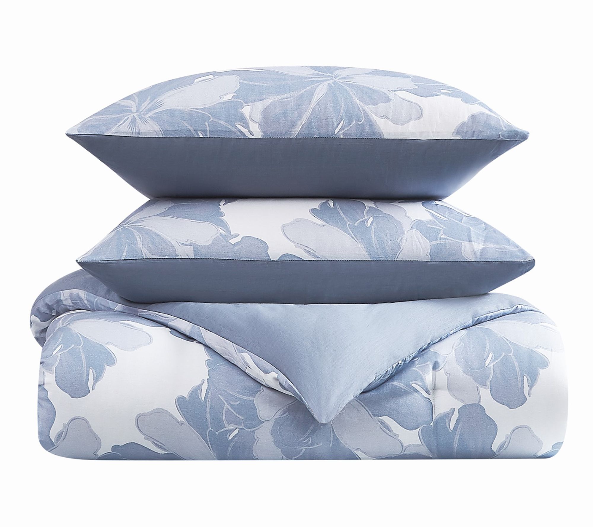 A blend of comfort and artistry, this floral comforter set brings serene, sophisticated style to your bedroom retreat. Soft blue botanical motifs paired with a silky sateen weave create an inviting oasis, while the contrasting solid reverse adds subtle modern flair. Experience gentle relaxation and effortless elegance every night. From Vince Camuto.
