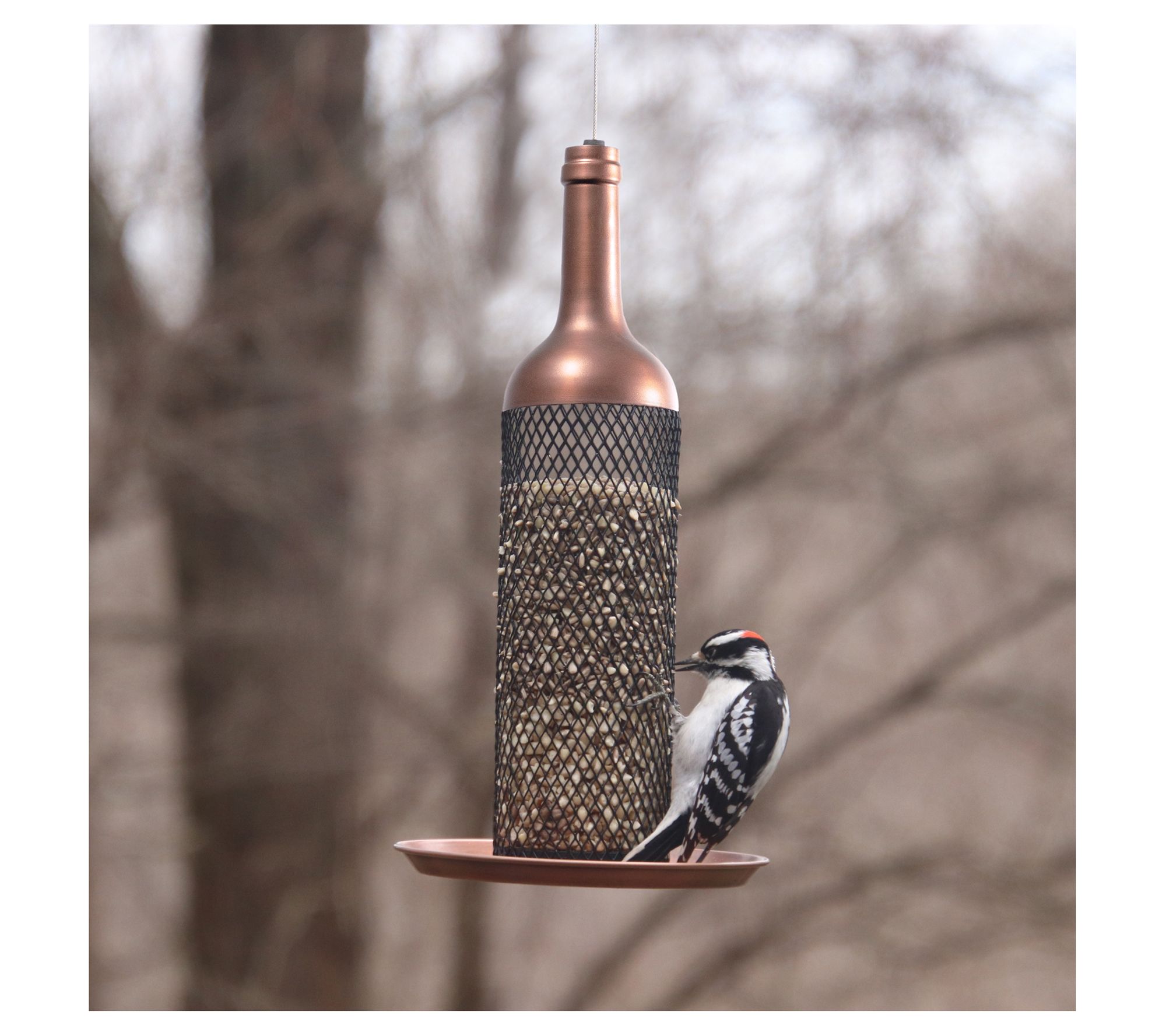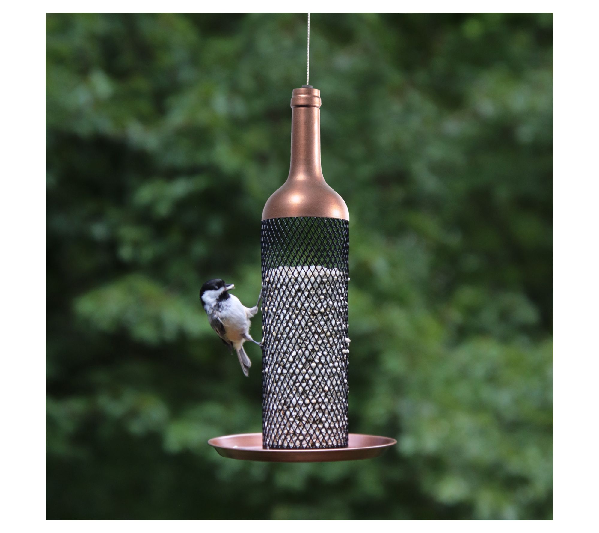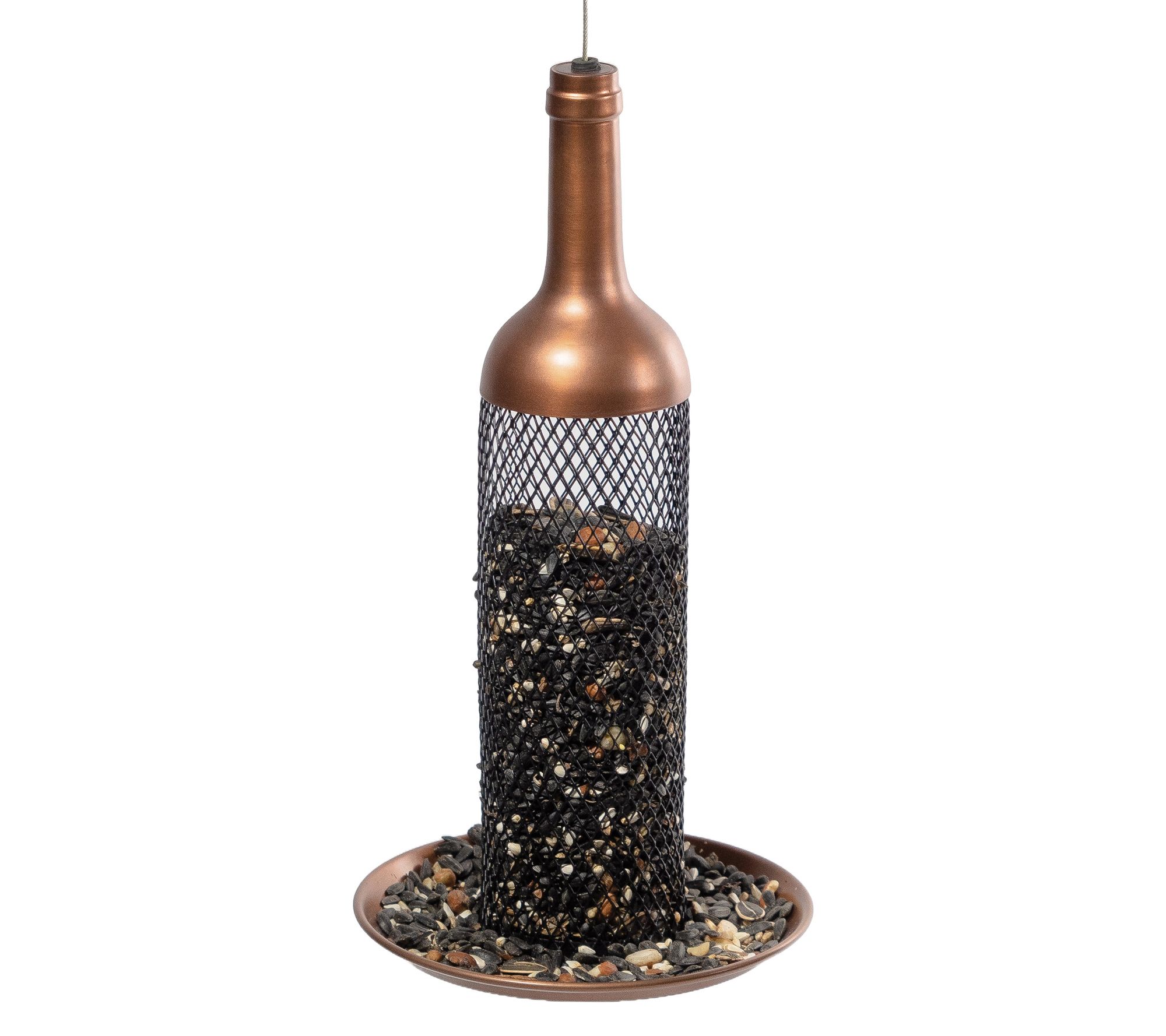 Summon your feathered friends to feast at this enchanting wine bottle-inspired feeder. The copper finish and mesh tube allow multiple birds to dine together, and a raised lip on the tray keeps seeds from spilling. Easy to fill and equipped with drainage holes to keep seeds dry, it's designed to hold 1.5 pounds of seed. From Good Directions.