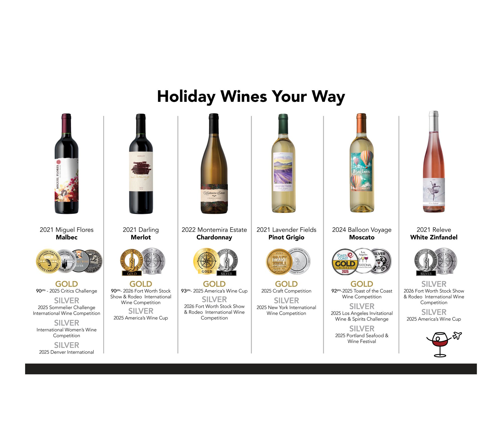 • All White: three bottles each of 2024 Lavender Fields Pinot Grigio and 2022 Montemira Estate Chardonnay