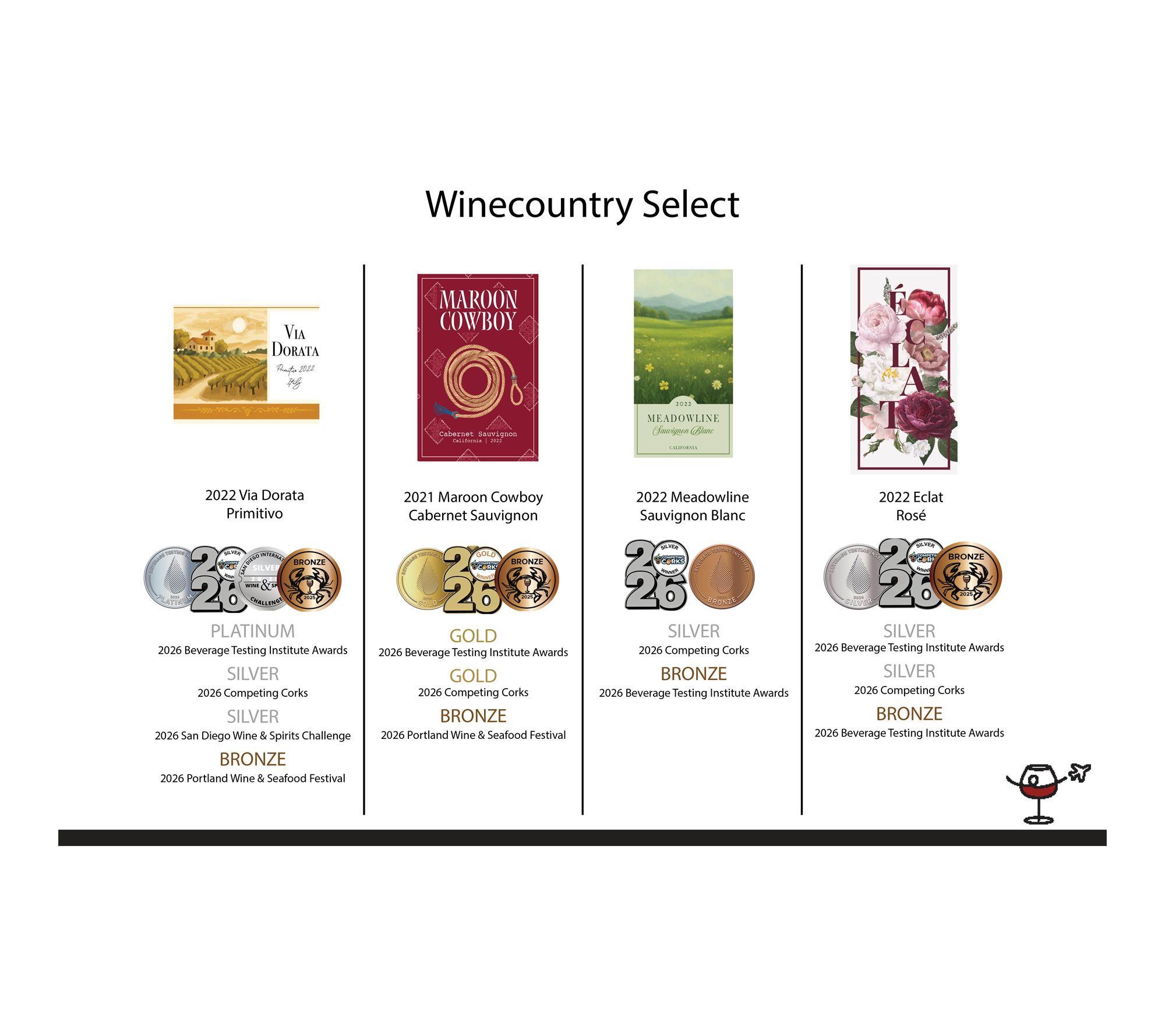 • All White: six bottles each of 2022 Eclat Rose, CA and 2022 Meadowline Sauvignon Blanc, CA