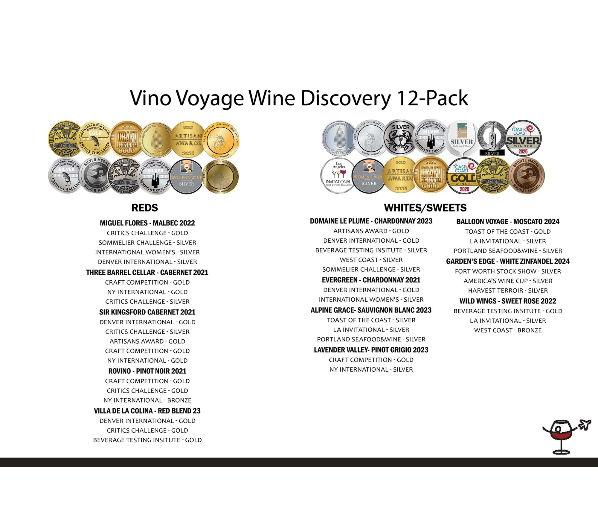 Whether you're hosting a festive dinner or relaxing with a friend, this wine discovery 12-bottle set is your ticket to savoring a curated journey of sweet, white, and red varietals -- each ready to elevate everything from charcuterie boards and seafood to chocolate cake or movie night popcorn. Experience the joy of trying new pairings and enjoy the convenience of delivery. From Vino Voyage.