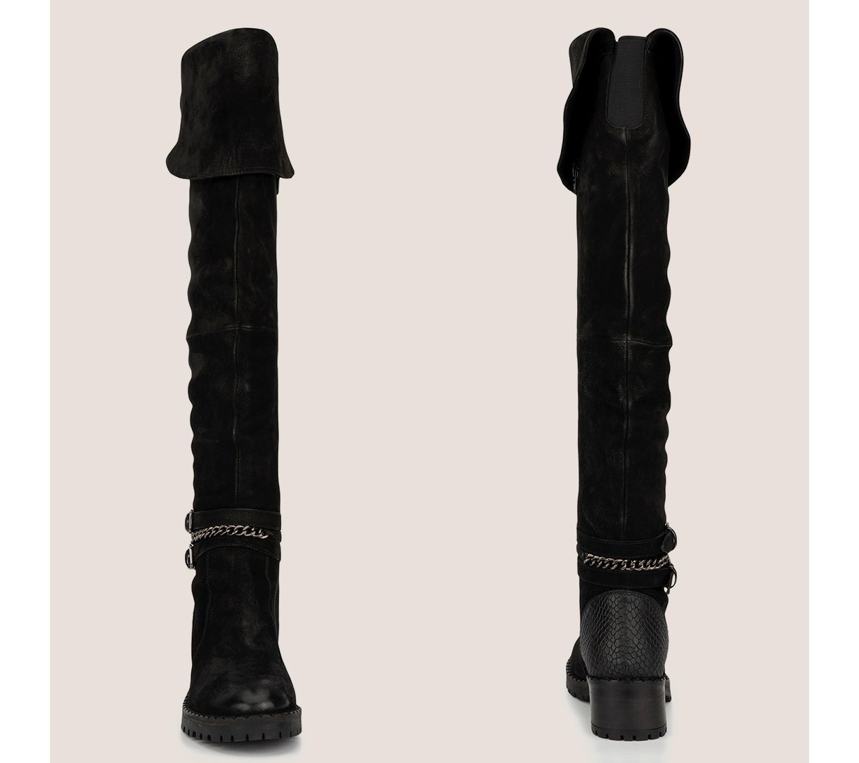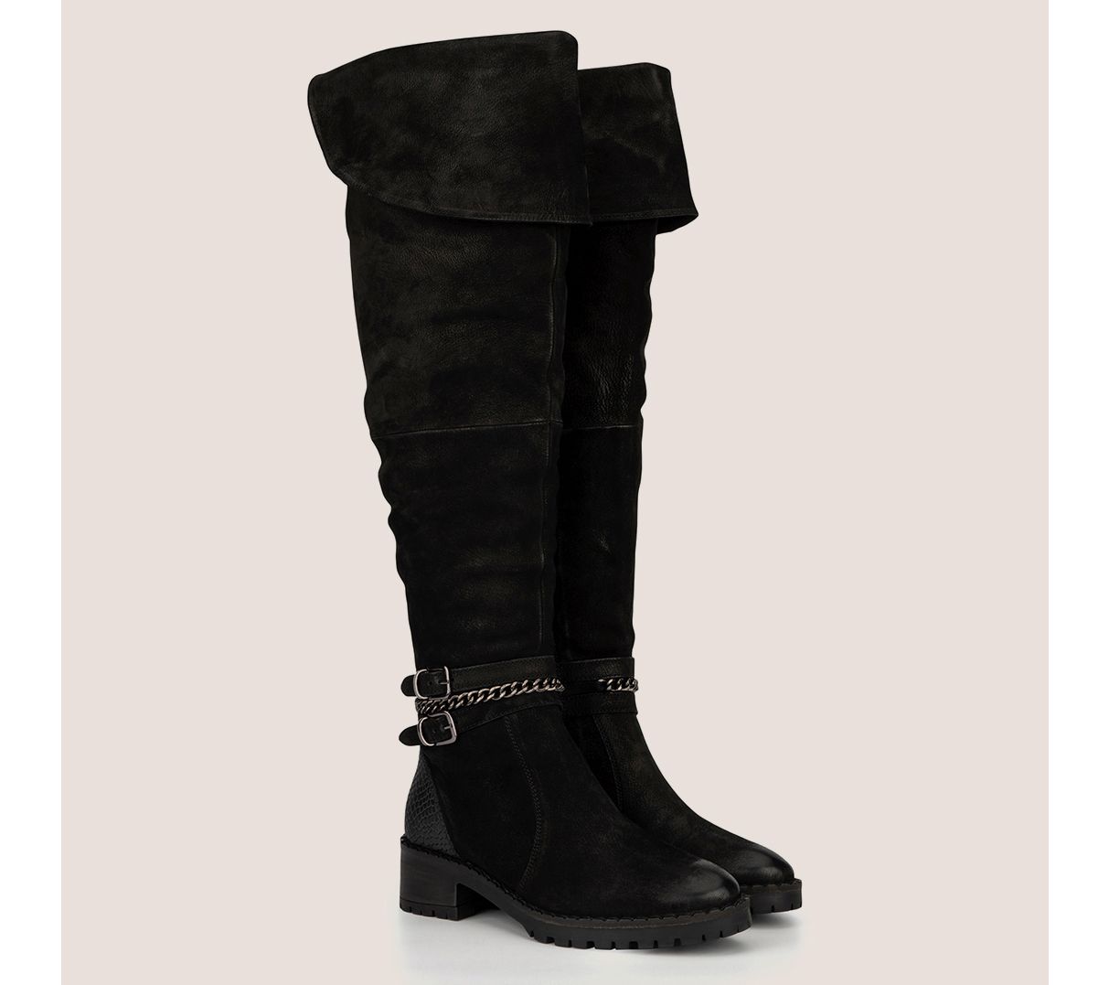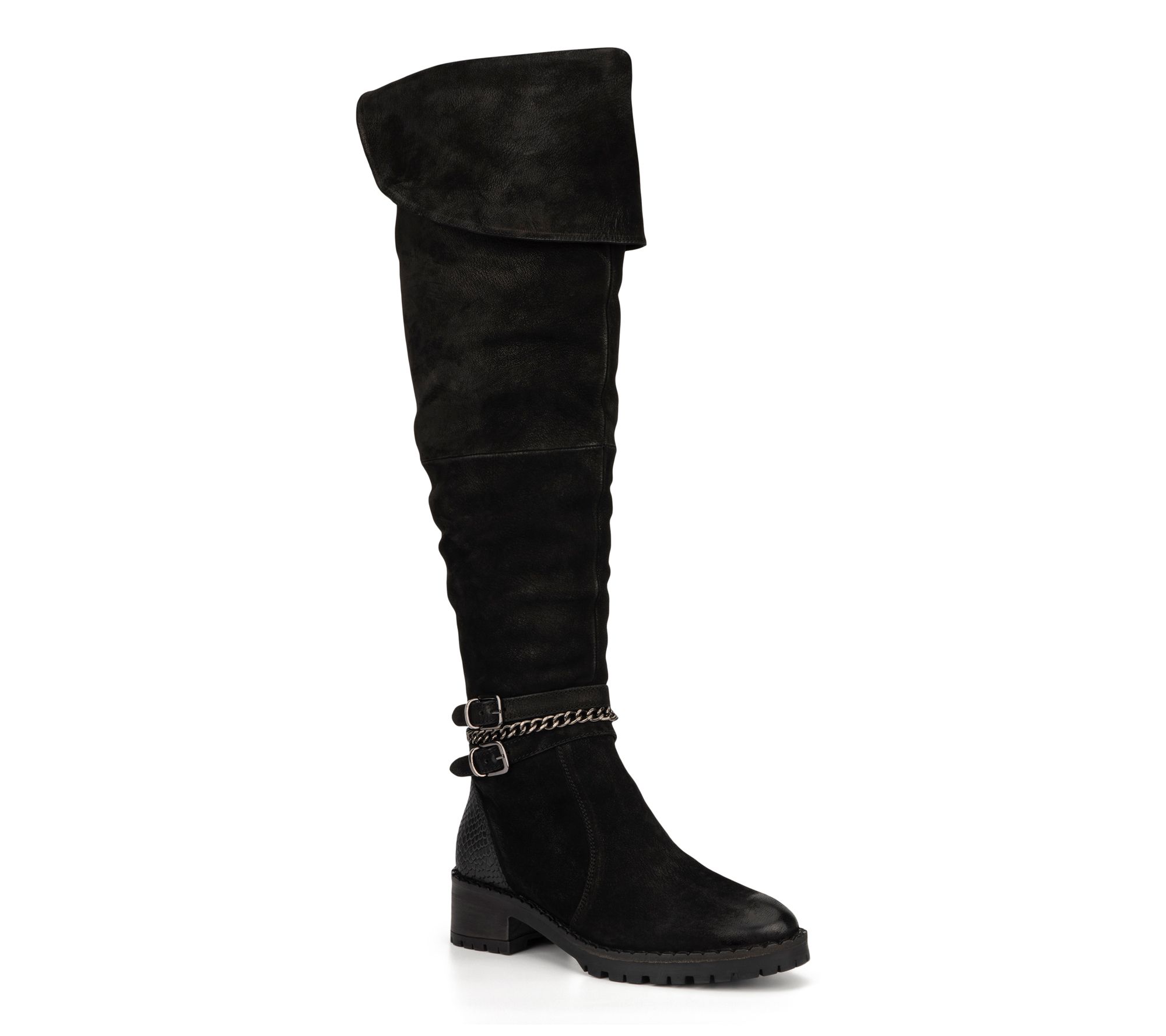 Leather upper, over-the-knee style, buckle belt feature at ankle, rounded toe, side zip closure